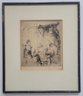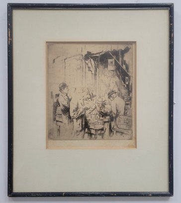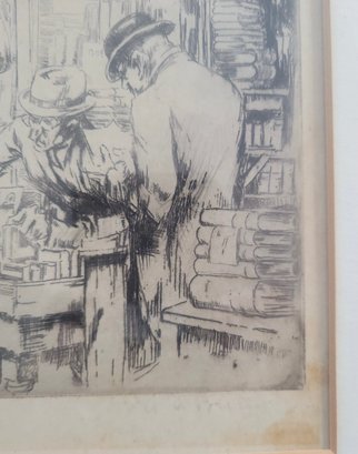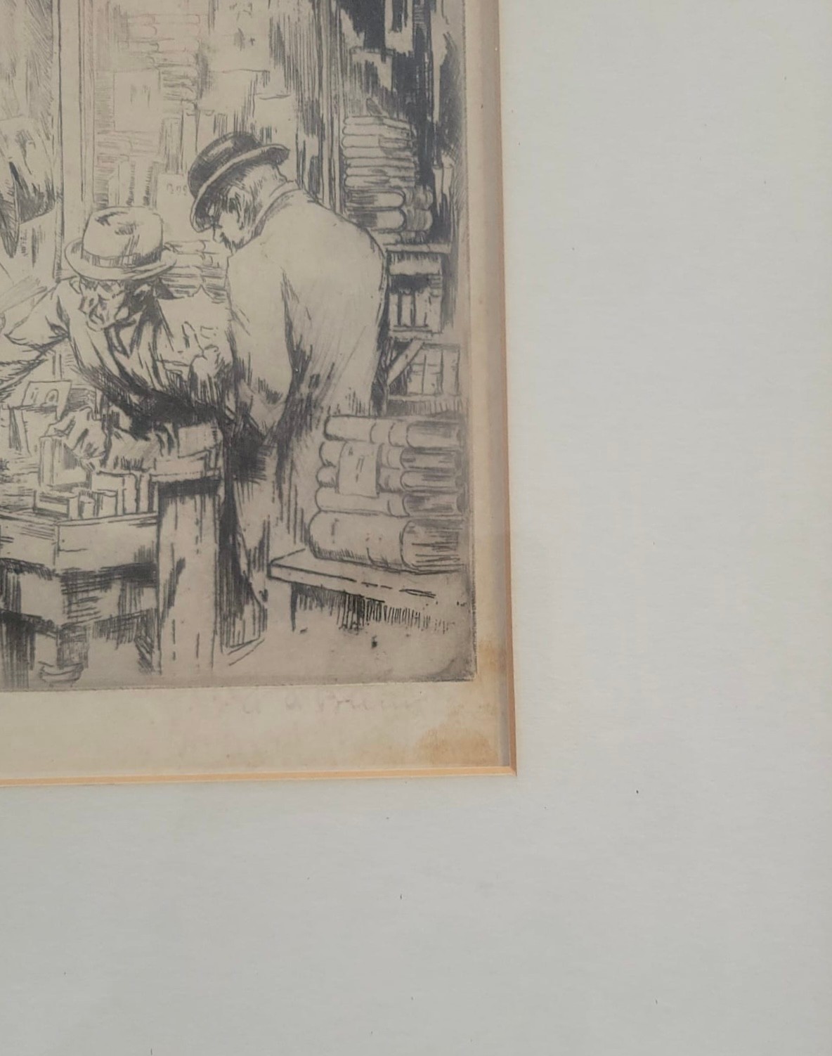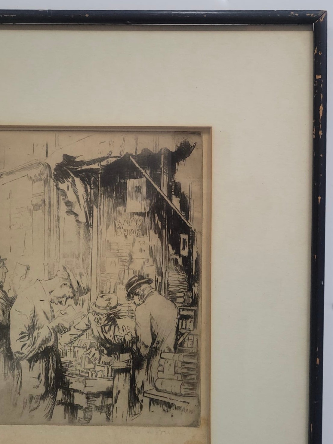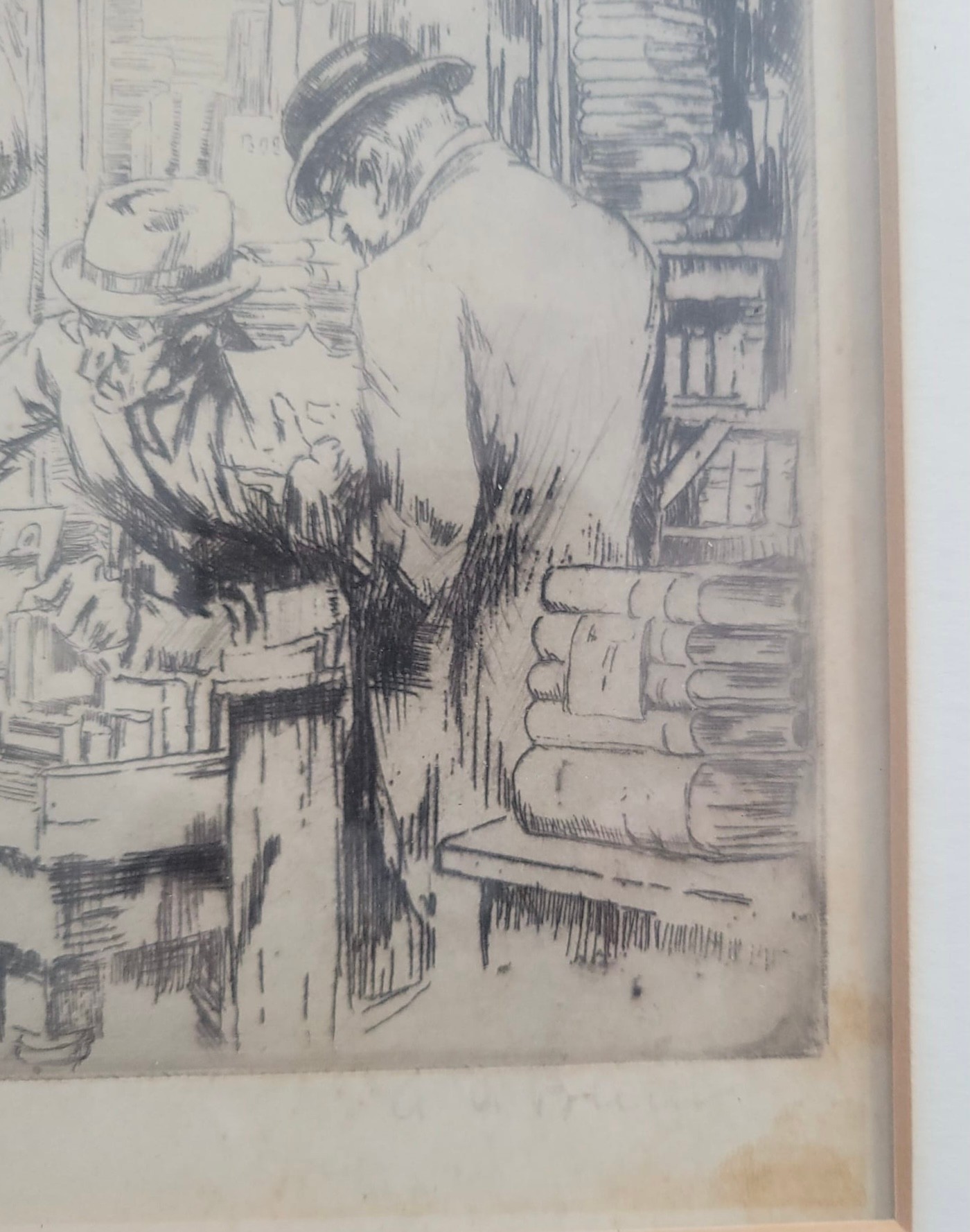 This appears to be an etching titled "Old Bookshop" (also known as "The Bibliomaniacs", "Bookshop", "Curiosity Shop", or "Old Curiosity Shop") by the Hungarian-American artist Alexander Aladar Blum (1889-1969).