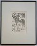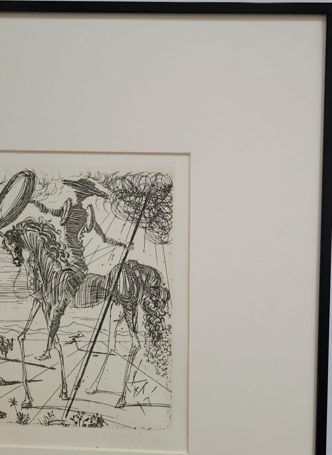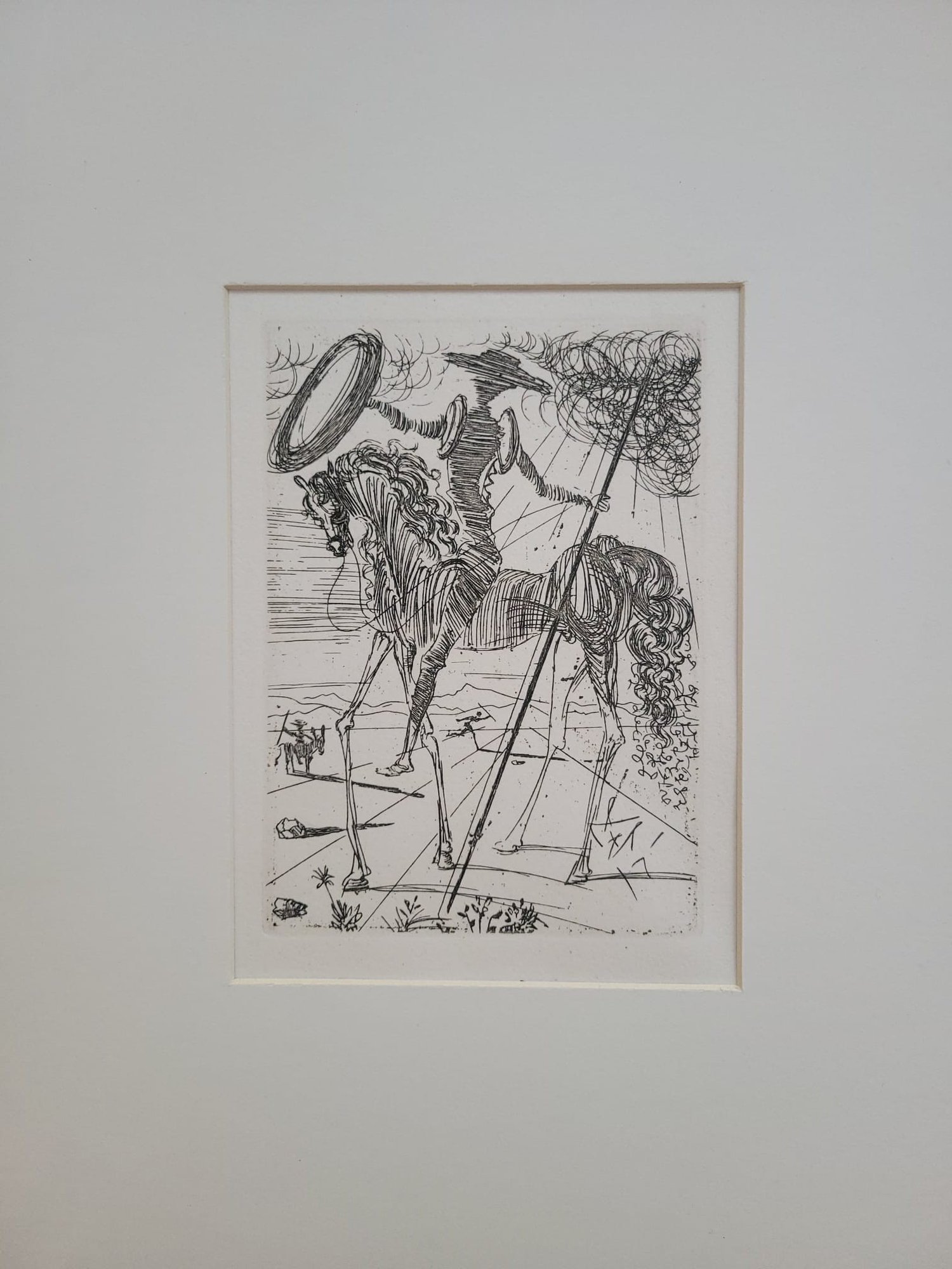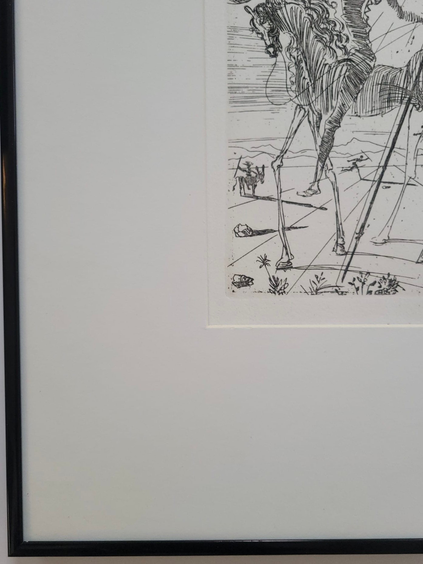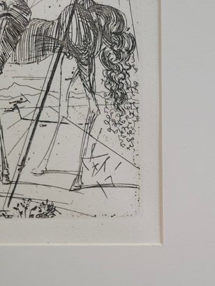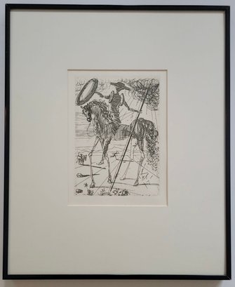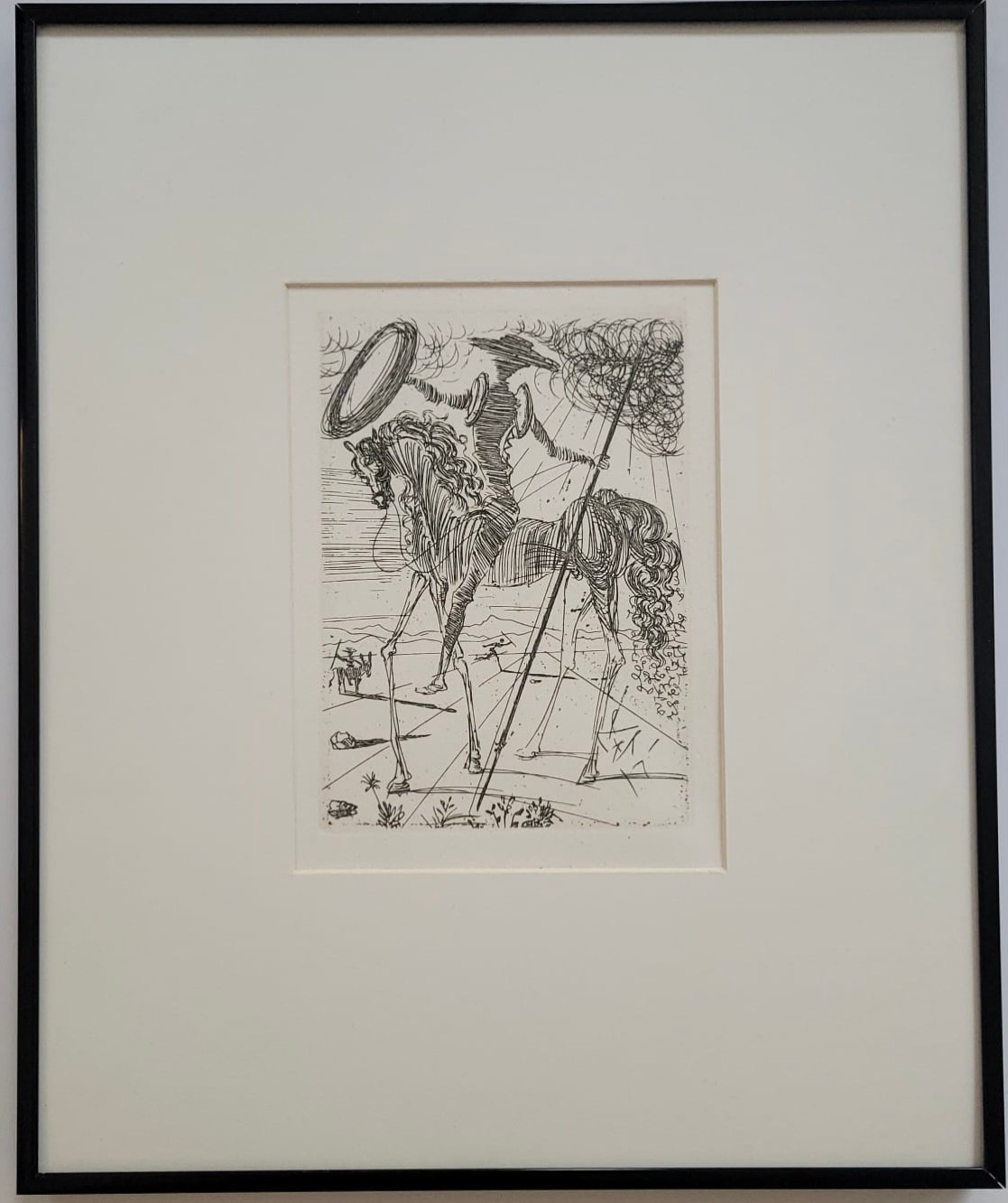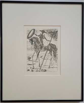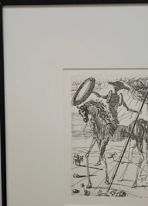 Artwork Details: The etching depicts the legendary literary character Don Quixote on horseback in Dalí's characteristic surrealist style, featuring tall, emaciated figures