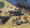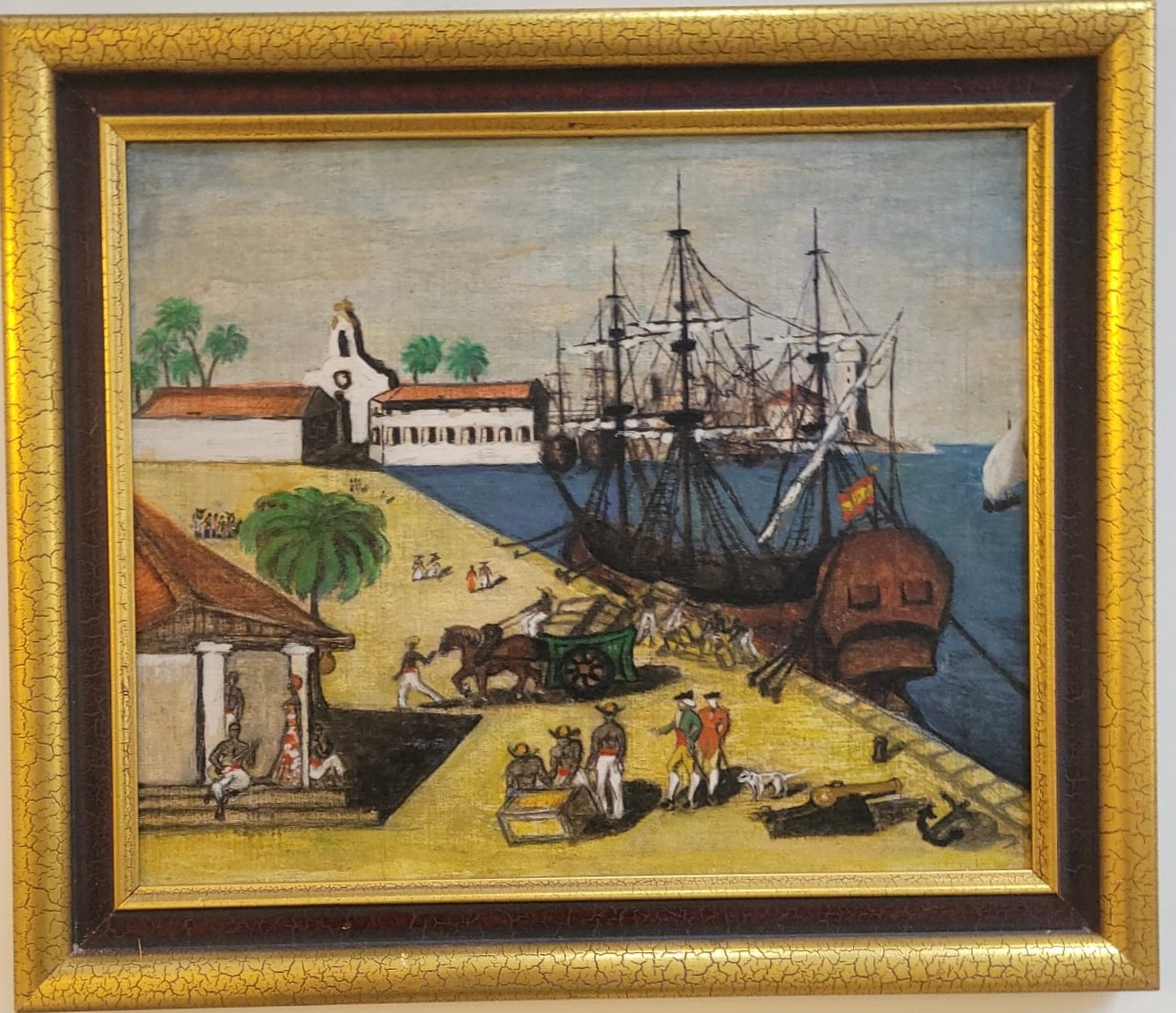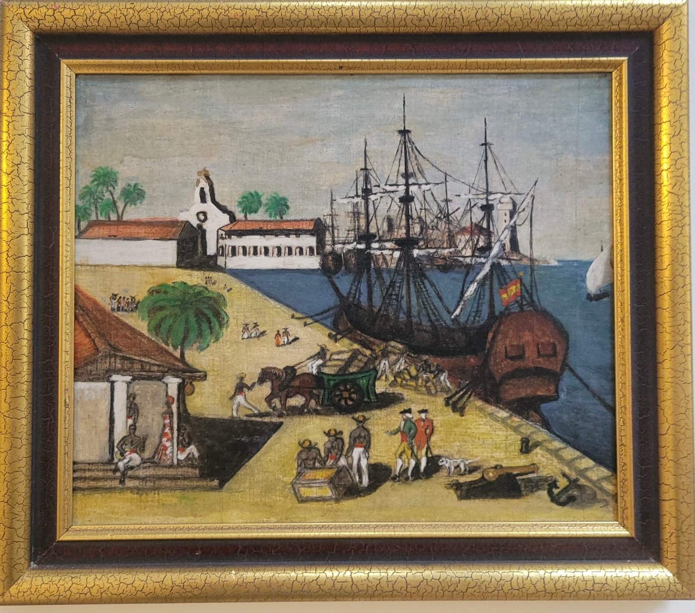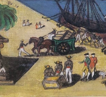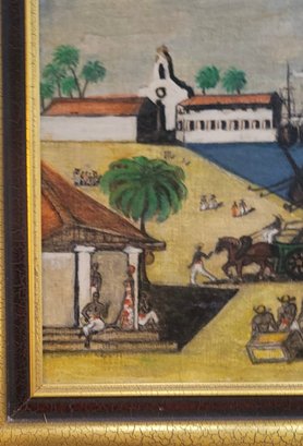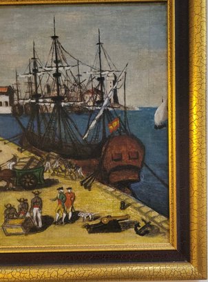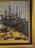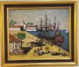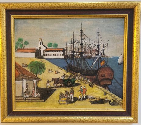 Folk Art featuring Harbor Scene likely depicting historical Boston Tea Party The artwork shows colonial-era ships docked at a wharf, with crates and figures on the shore.