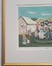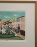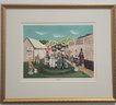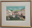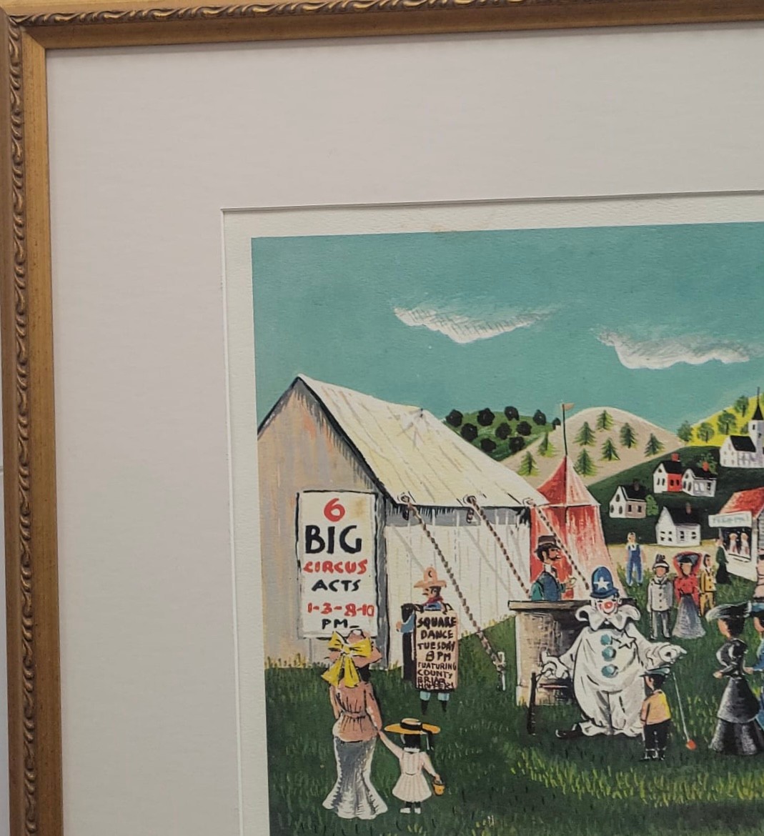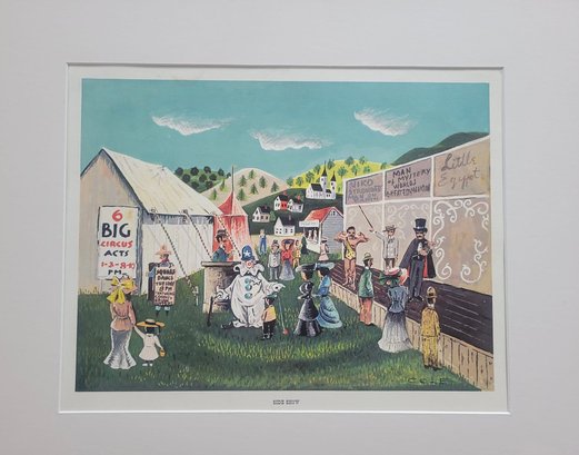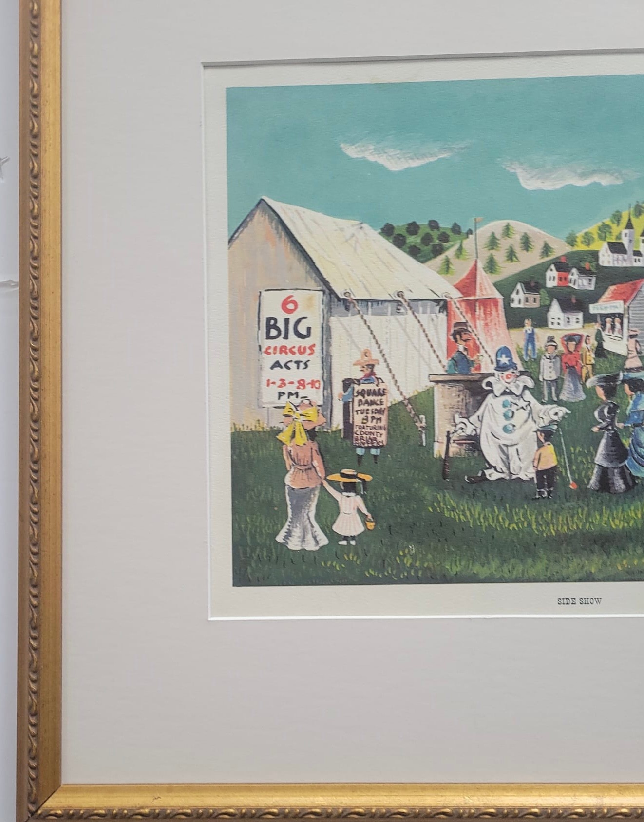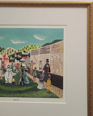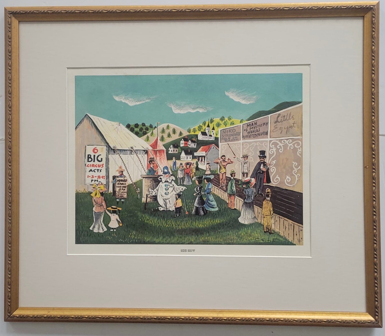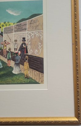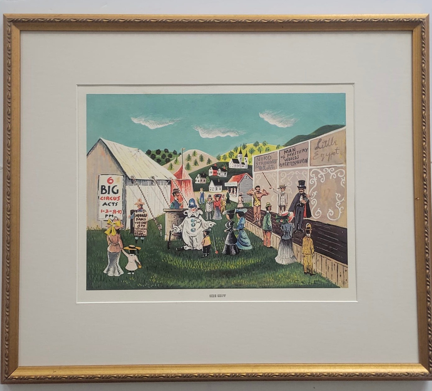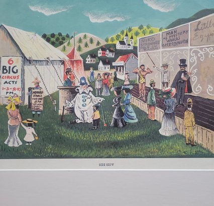 This item is a vintage folk art print titled "Side Show". It depicts a bustling 19th or early 20th-century fair or circus scene with a large white tent, various performers (including a clown), and hand-painted advertisements for acts like "Man Eating Live Animals" and "Lulu, Egypt"