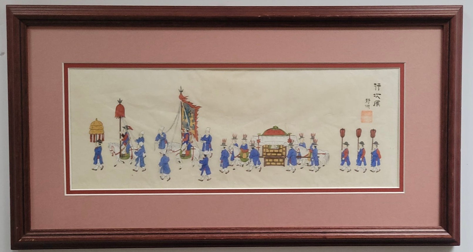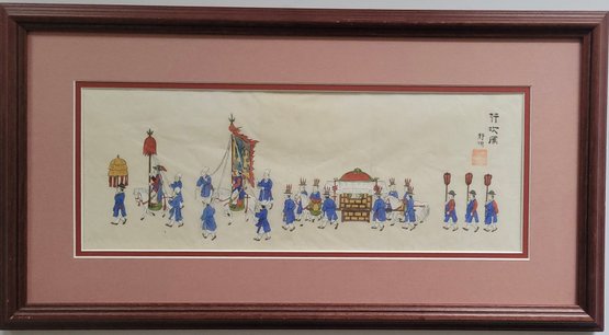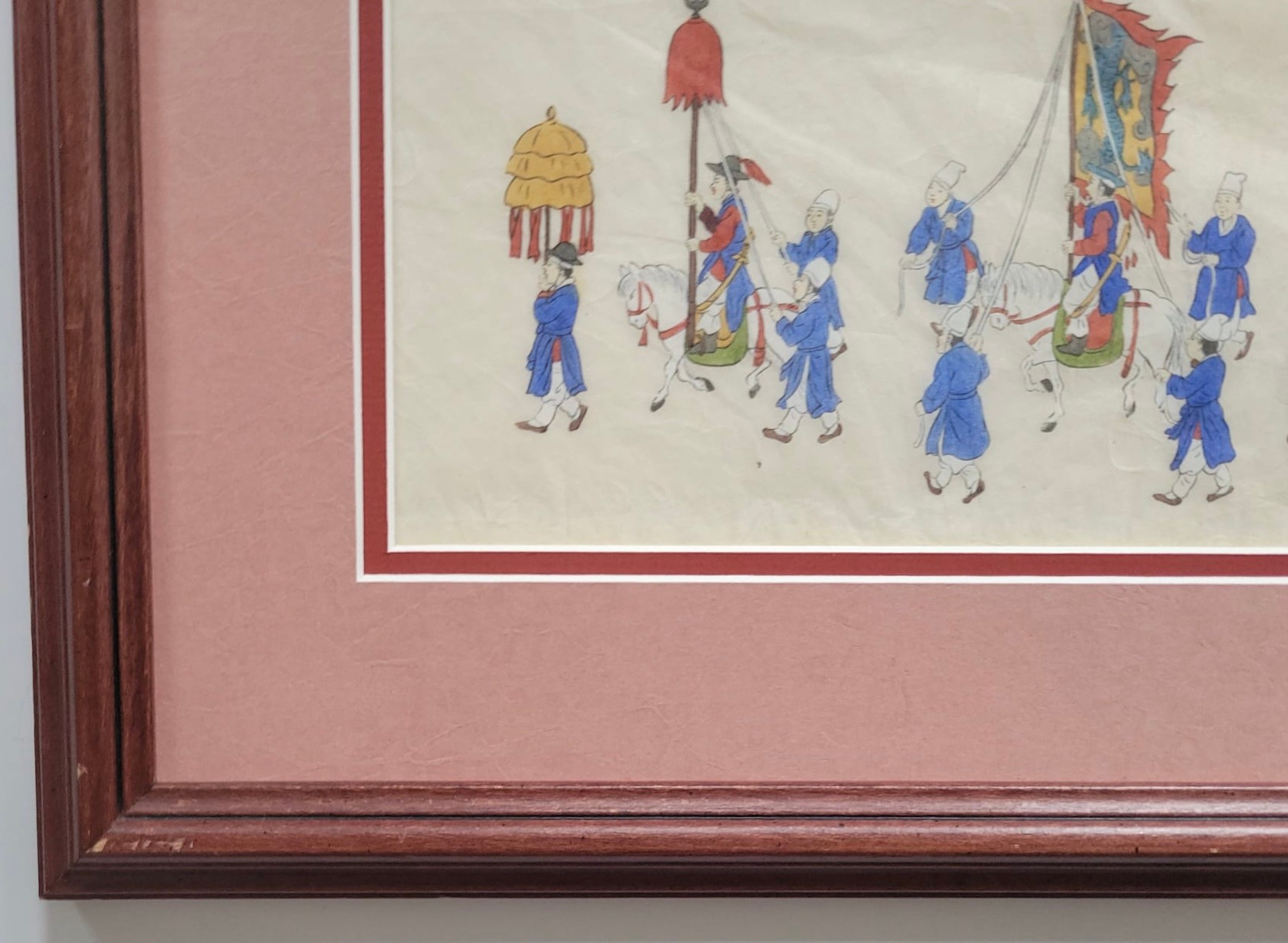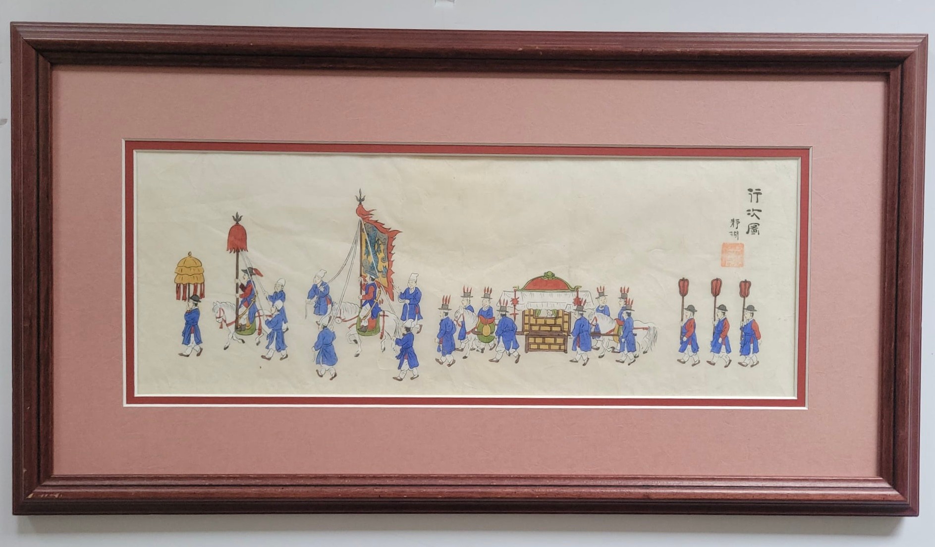 This item is a framed Asian watercolor painting on rice paper depicting a traditional procession, likely Korean folk art (Minhwa) or a scene representing diplomatic exchanges like the Ryukyuan missions to Edo.