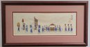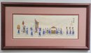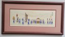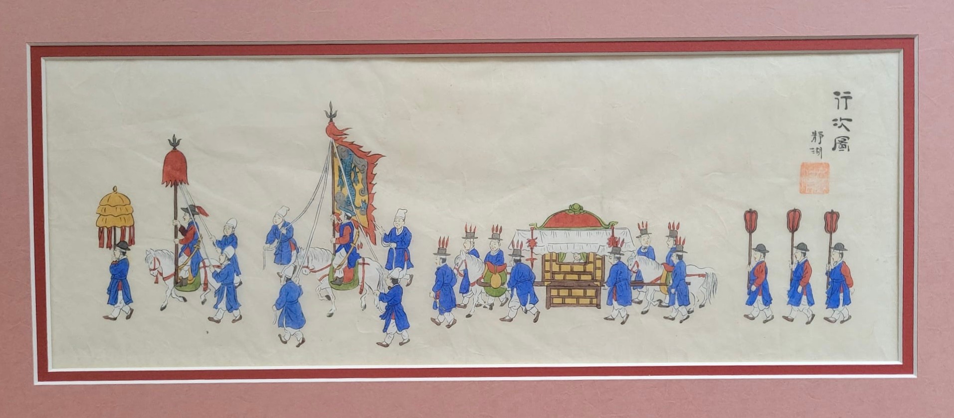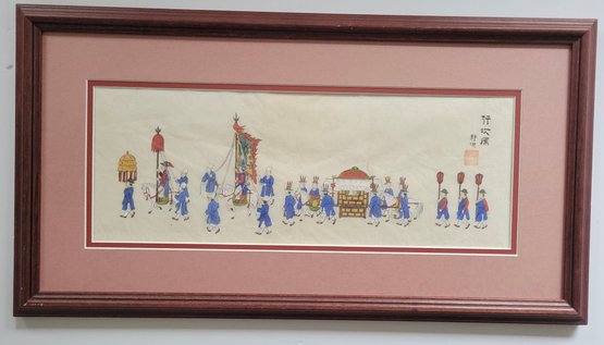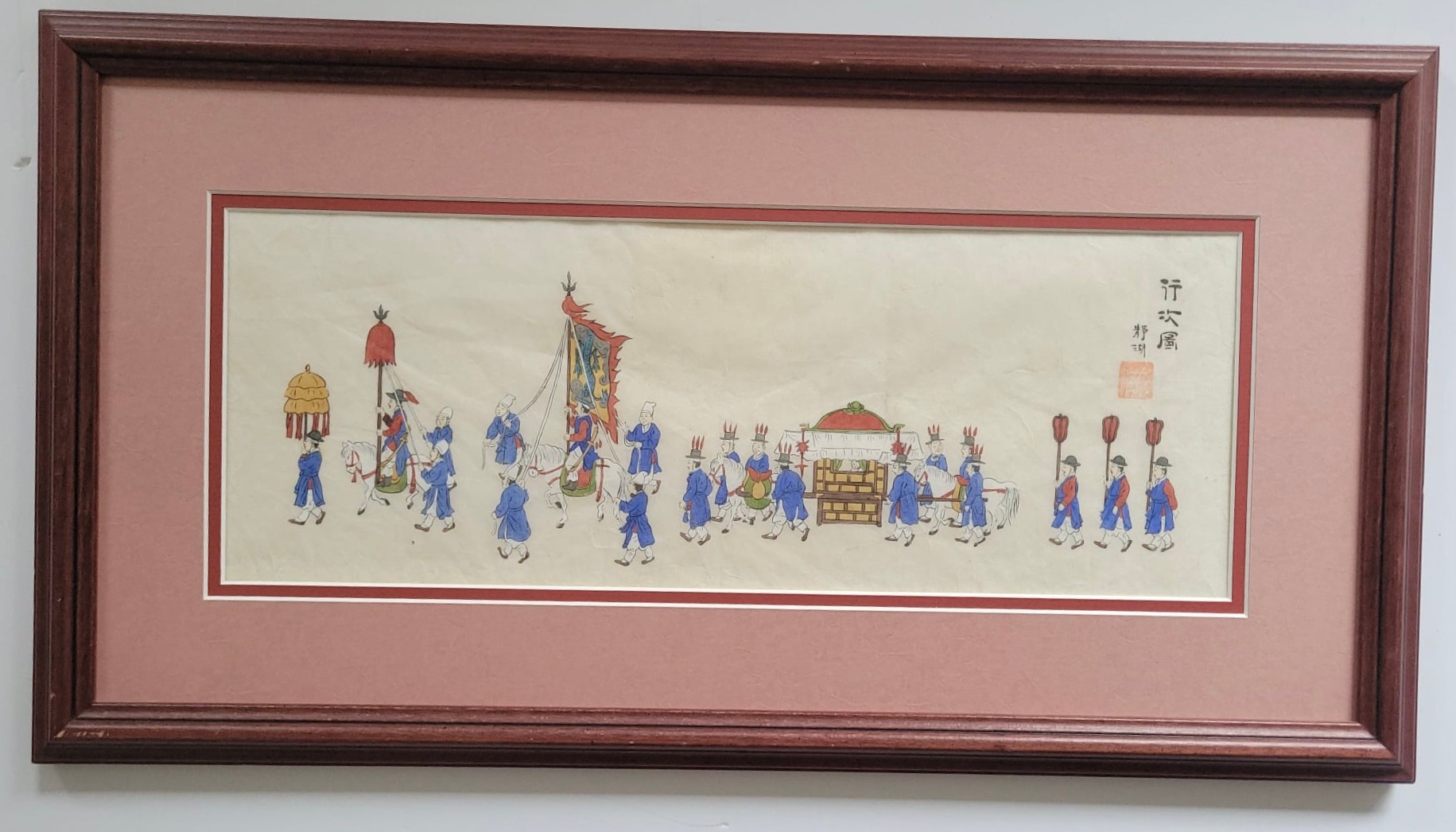 This item is a framed Asian watercolor painting on rice paper depicting a traditional procession, likely Korean folk art (Minhwa) or a scene representing diplomatic exchanges like the Ryukyuan missions to Edo.
