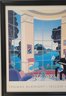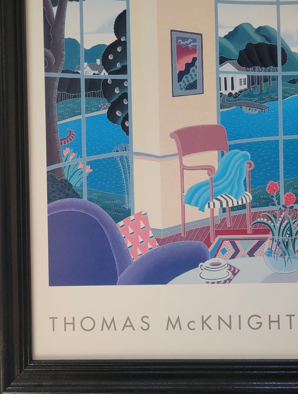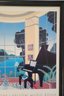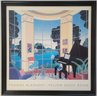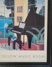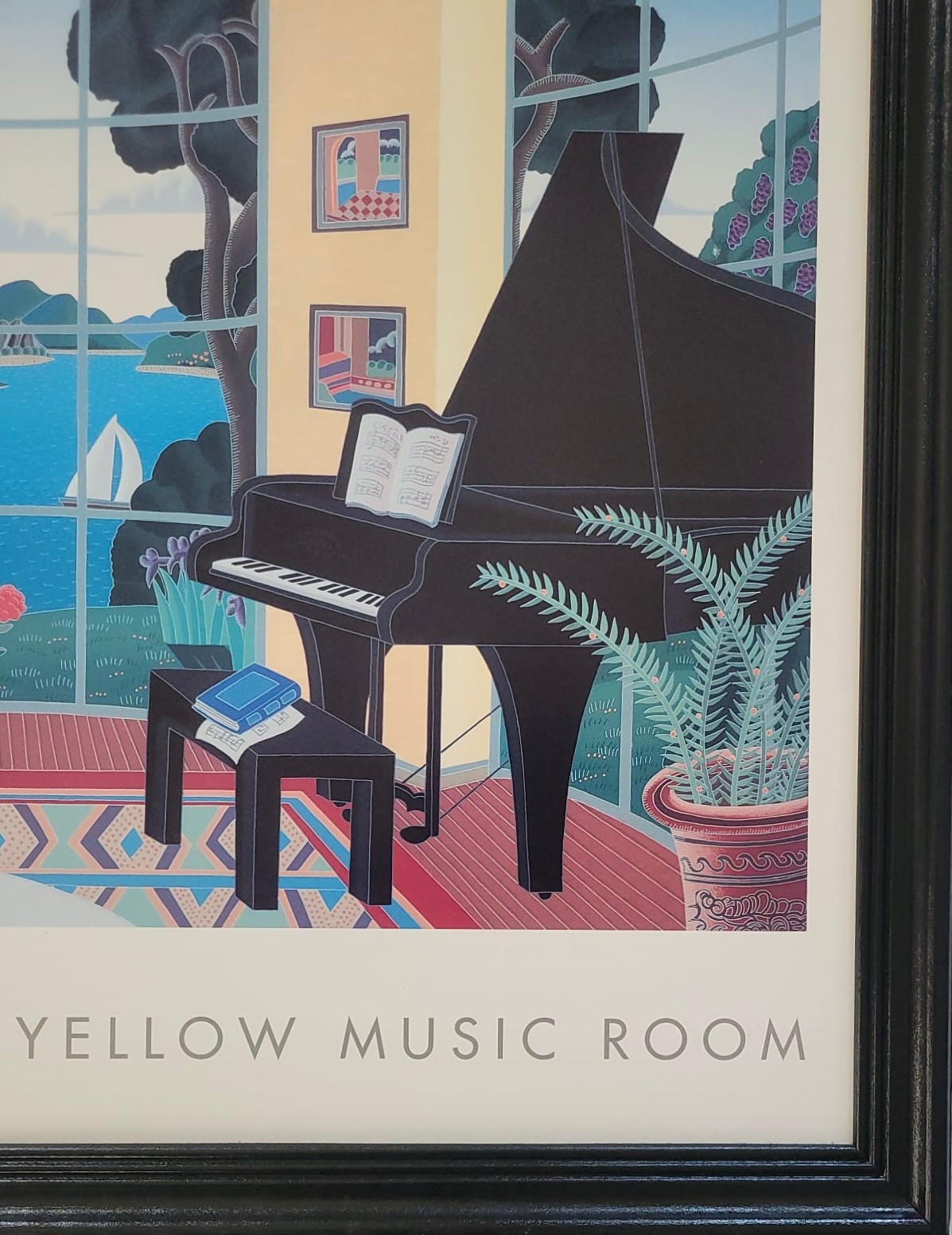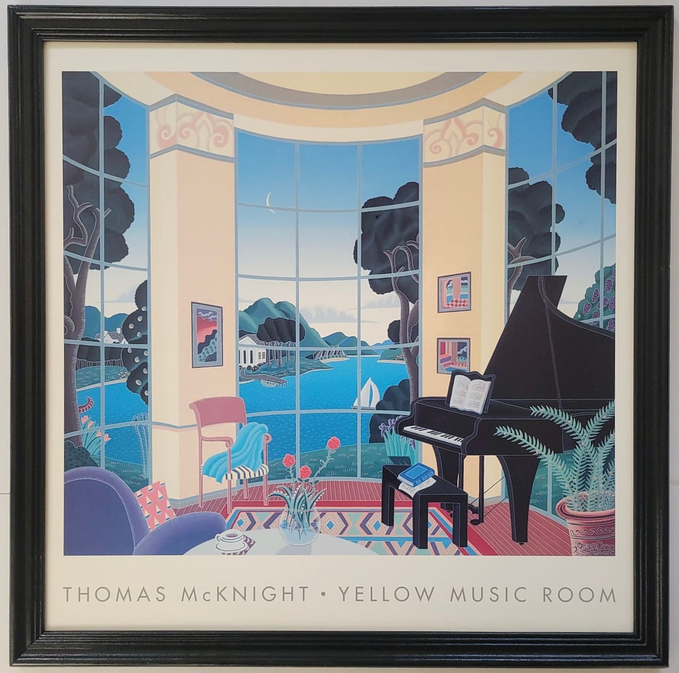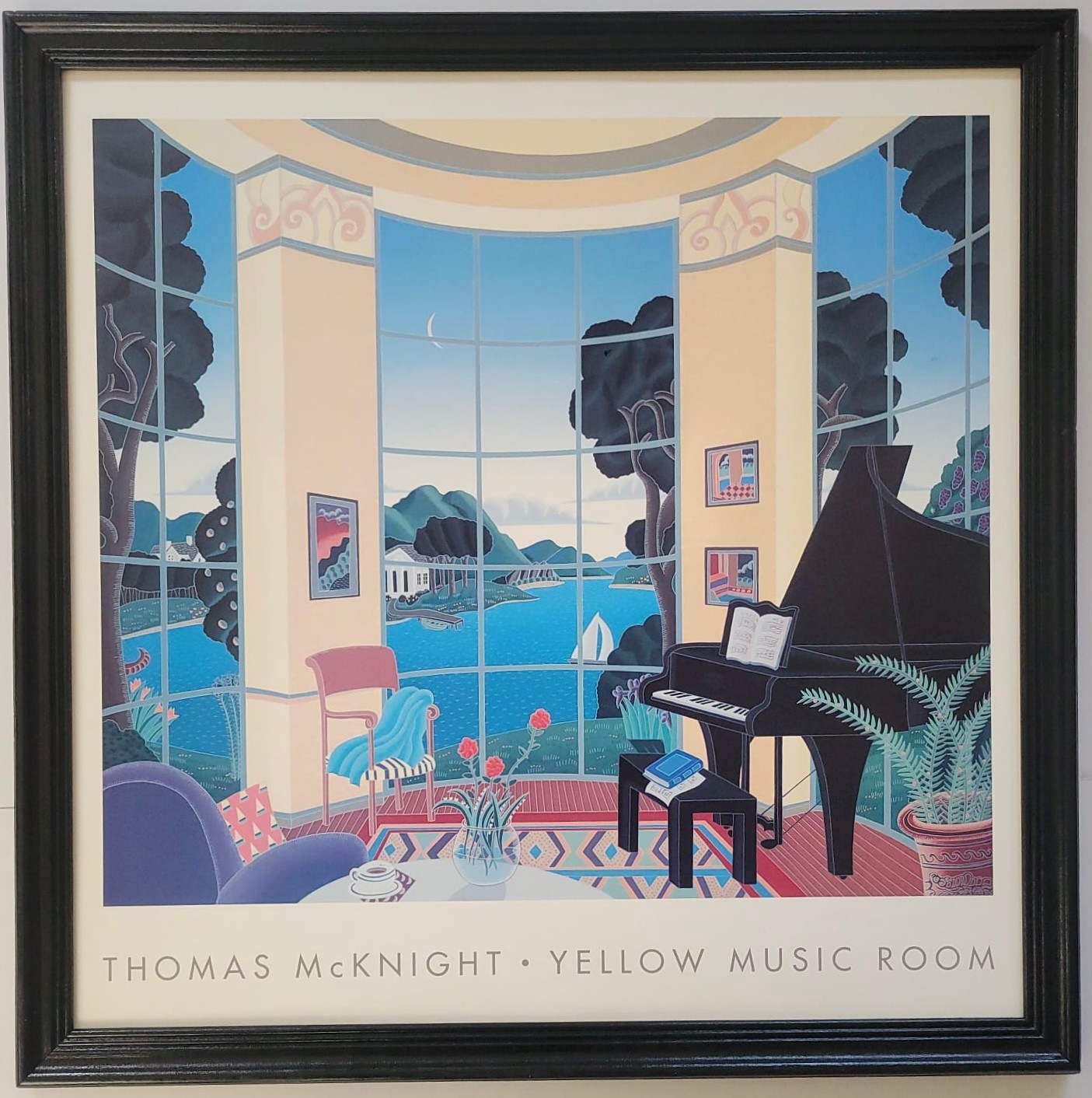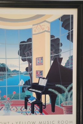 Framed poster print titled "Yellow Music Room" by the American artist Thomas McKnight. The artwork features a characteristic surreal interior scene looking out onto a landscape. A brightly colored, architectural modernism style print depicting a room with a grand piano and large windows overlooking a scenic bay