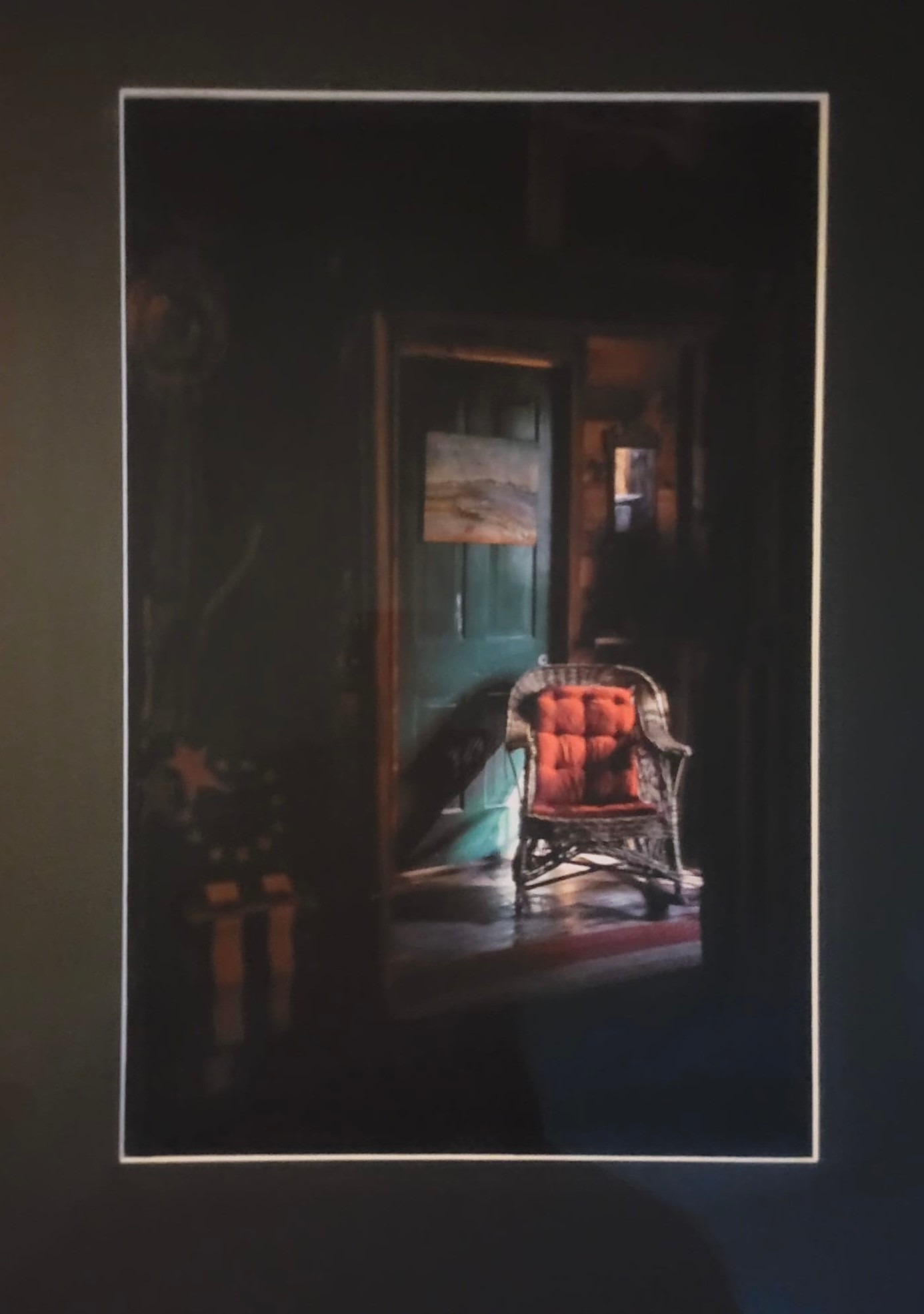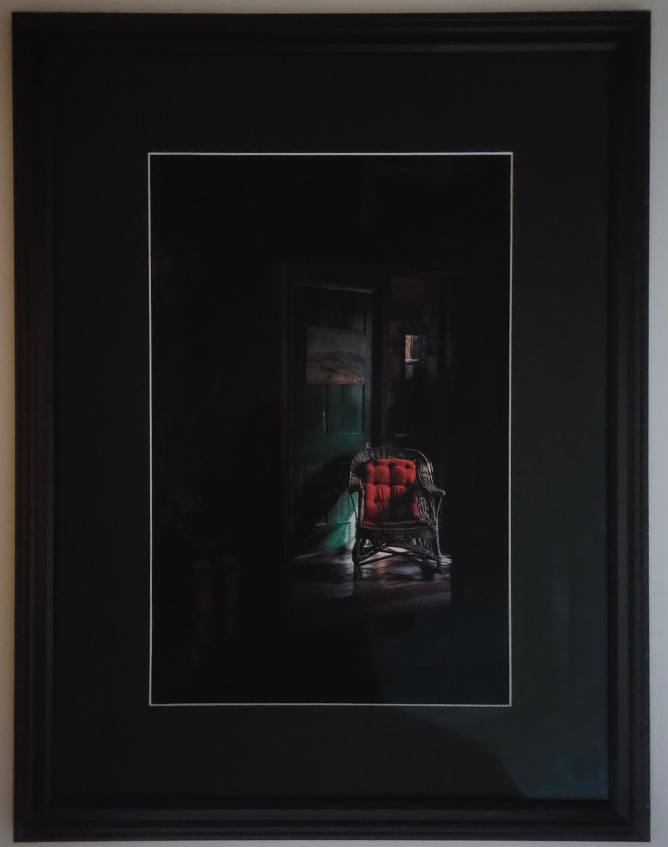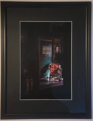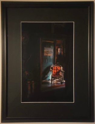 Framed Print featuring a scene with a red chair. The artwork showcases a dramatic, film noir style with heavy shadows.Color Palette: Dominated by deep, dark tones that contrast sharply with the warm highlights on the chair and the soft blue-green accents on the door in the background.