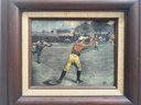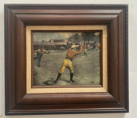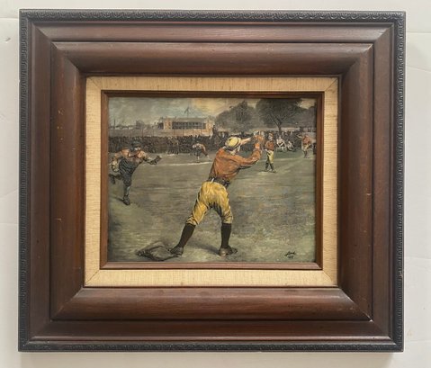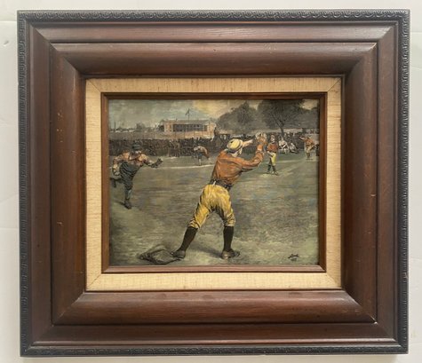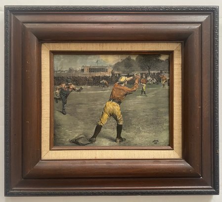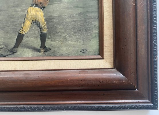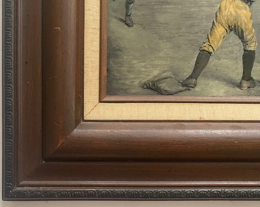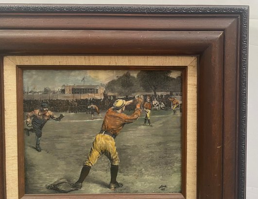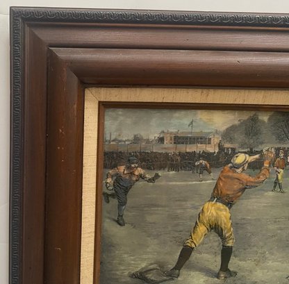 This is a framed print of an 1887 woodcut engraving by American artist William Gilbert Gaul, titled "Thrown Out on Second Base". The original engraving was published in Harper's Weekly on September 10, 1887. Gaul was known for his genre paintings and illustrations, particularly those depicting the U.S. Civil War and everyday life. The print depicts a vintage baseball game scene, capturing the action of a player being "thrown out" at second base.