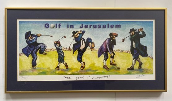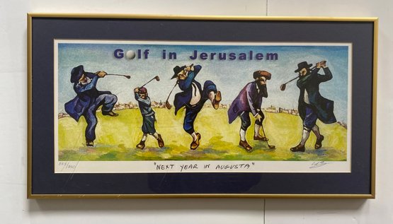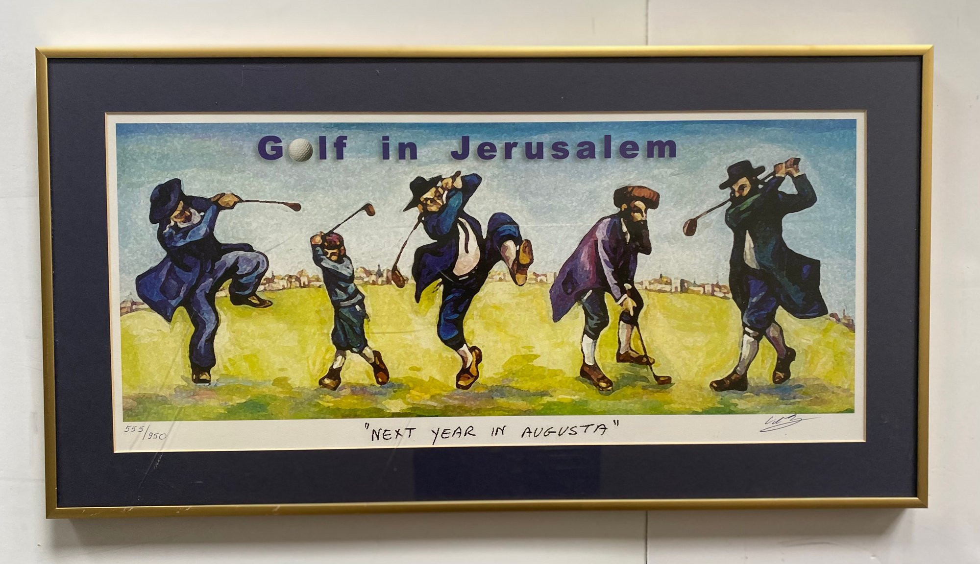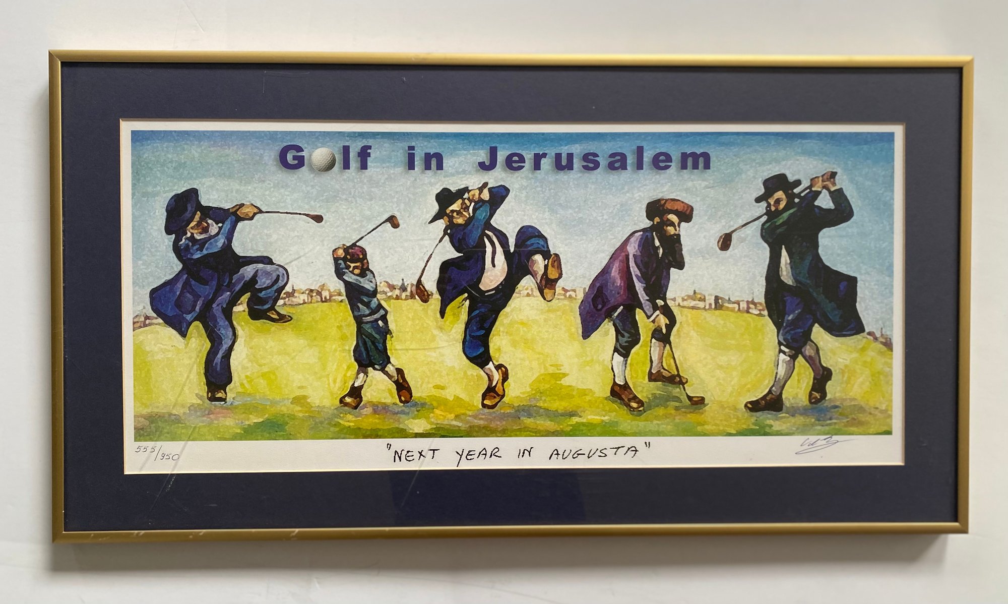 The print depicts a whimsical scene of five figures, dressed in traditional Jewish attire, playing golf in a Jerusalem landscape. The title "Golf in Jerusalem" is prominently displayed at the top of the print.