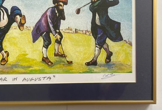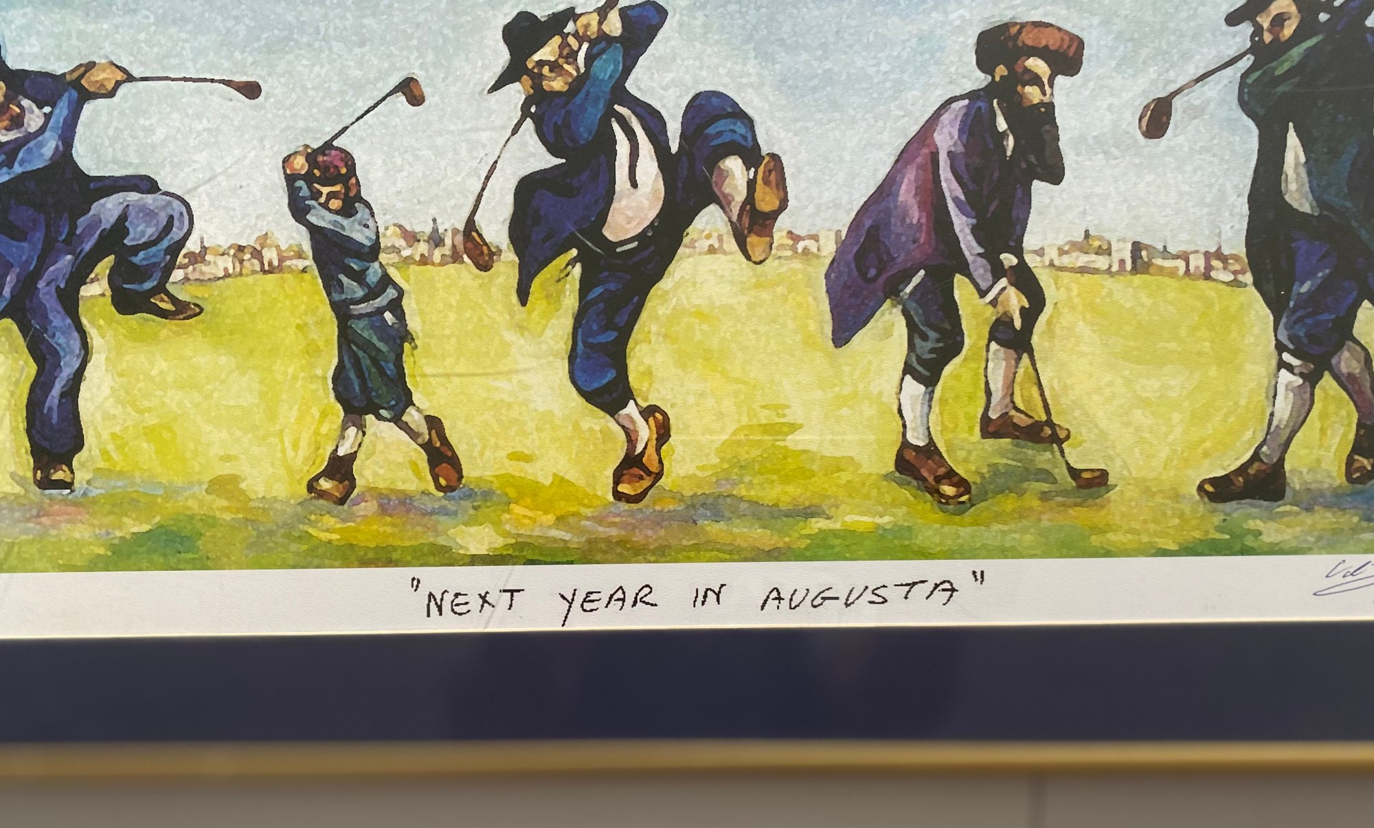 The bottom of the print includes the phrase "NEXT YEAR IN AUGUSTA," a playful reference to the Masters Tournament held in Augusta, Georgia, and the traditional Jewish saying "Next Year in Jerusalem". The print is signed by the artist Udi and numbered 555/950, indicating it is a limited edition print. Udi Merioz is an artist who operates a store called Blue and White in Jerusalem's Old City, known for his unique and humorous depictions of Jewish life and traditions.