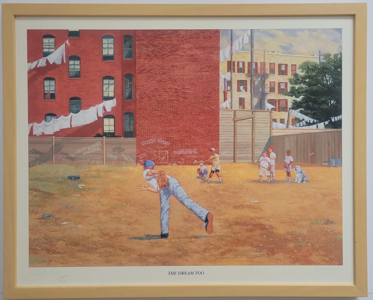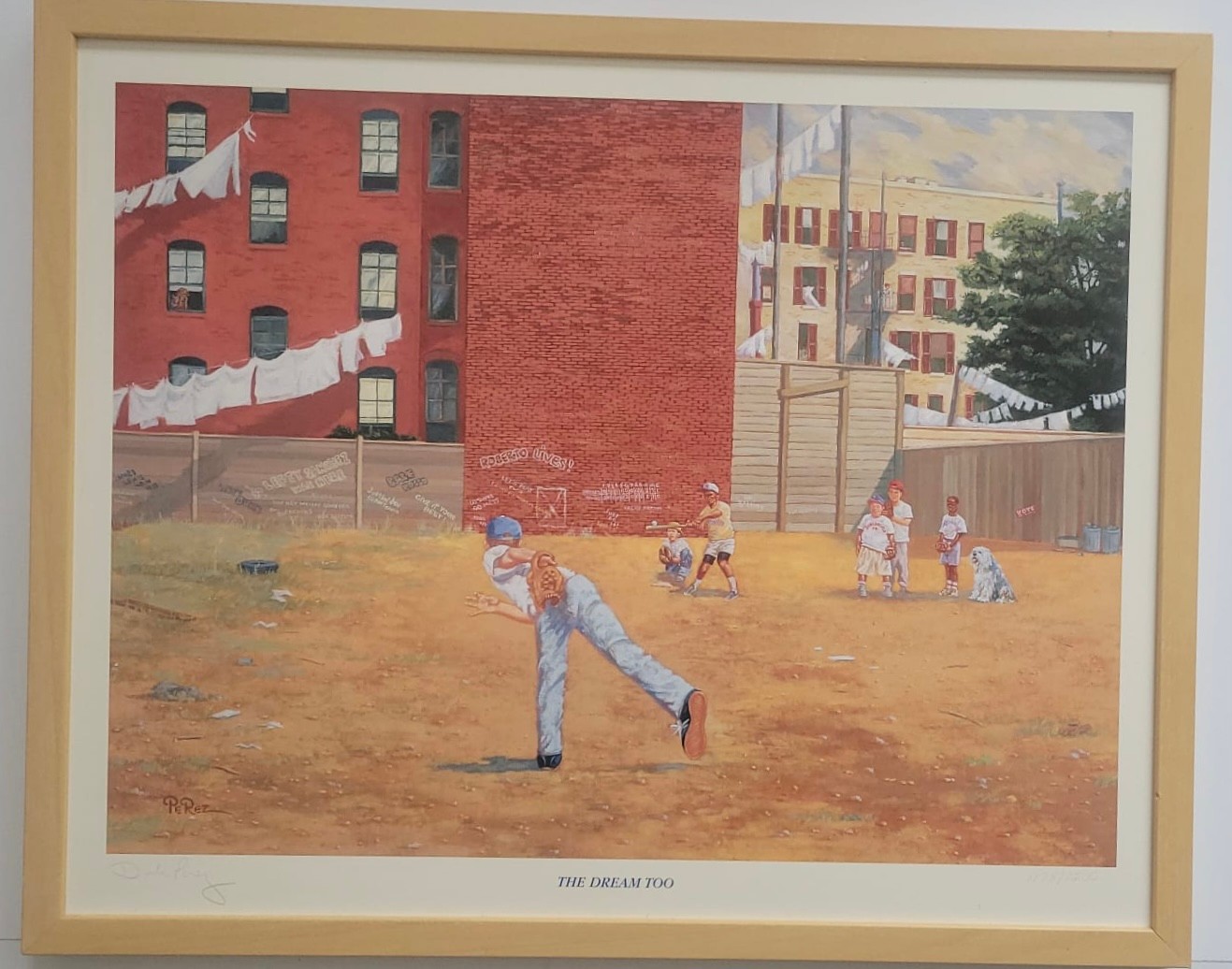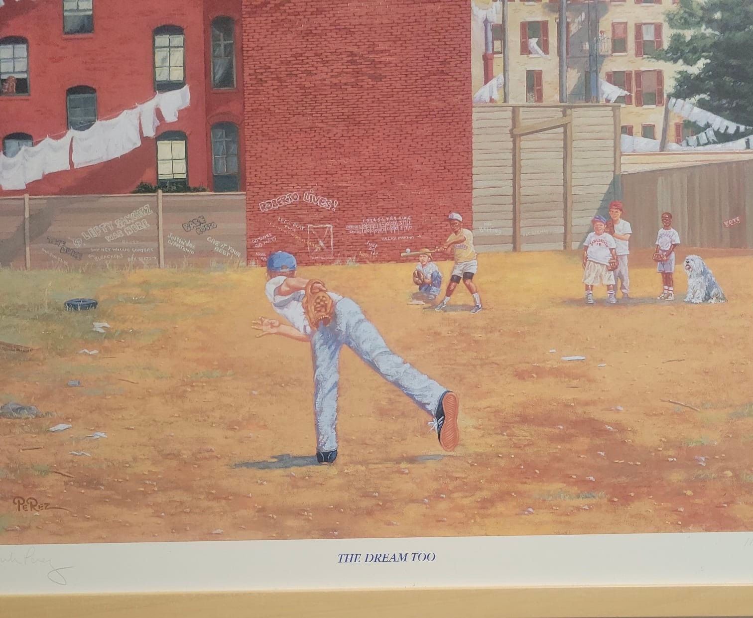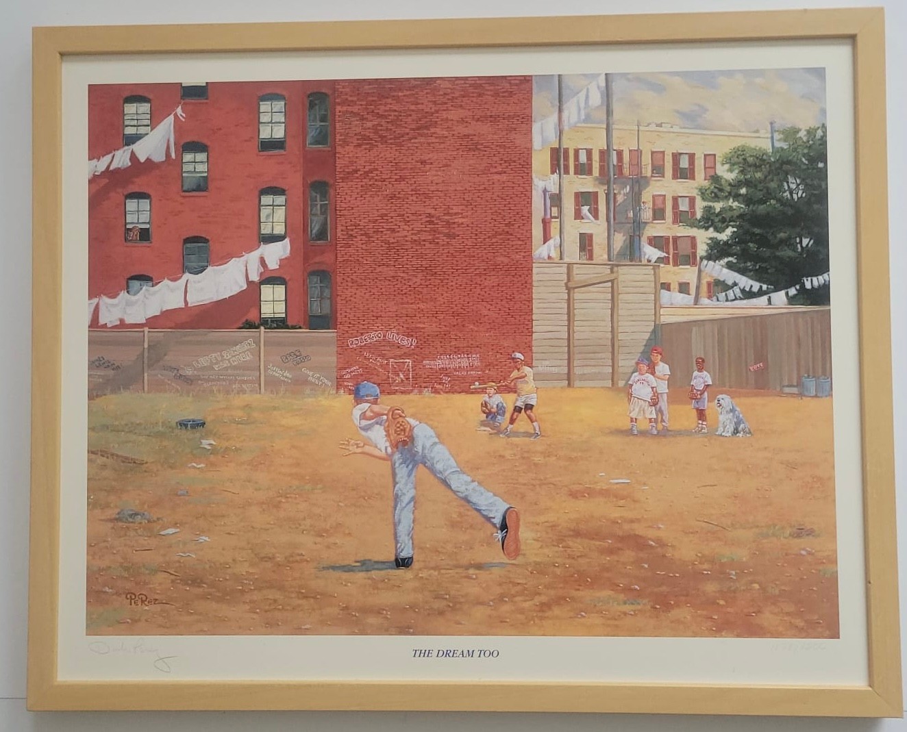This item is a framed art print titled "The Dream Too," which depicts children playing baseball in a gritty urban setting. Nostalgic painting showcasing a youth baseball game in a backyard or vacant lot, bordered by brick buildings with laundry lines.