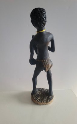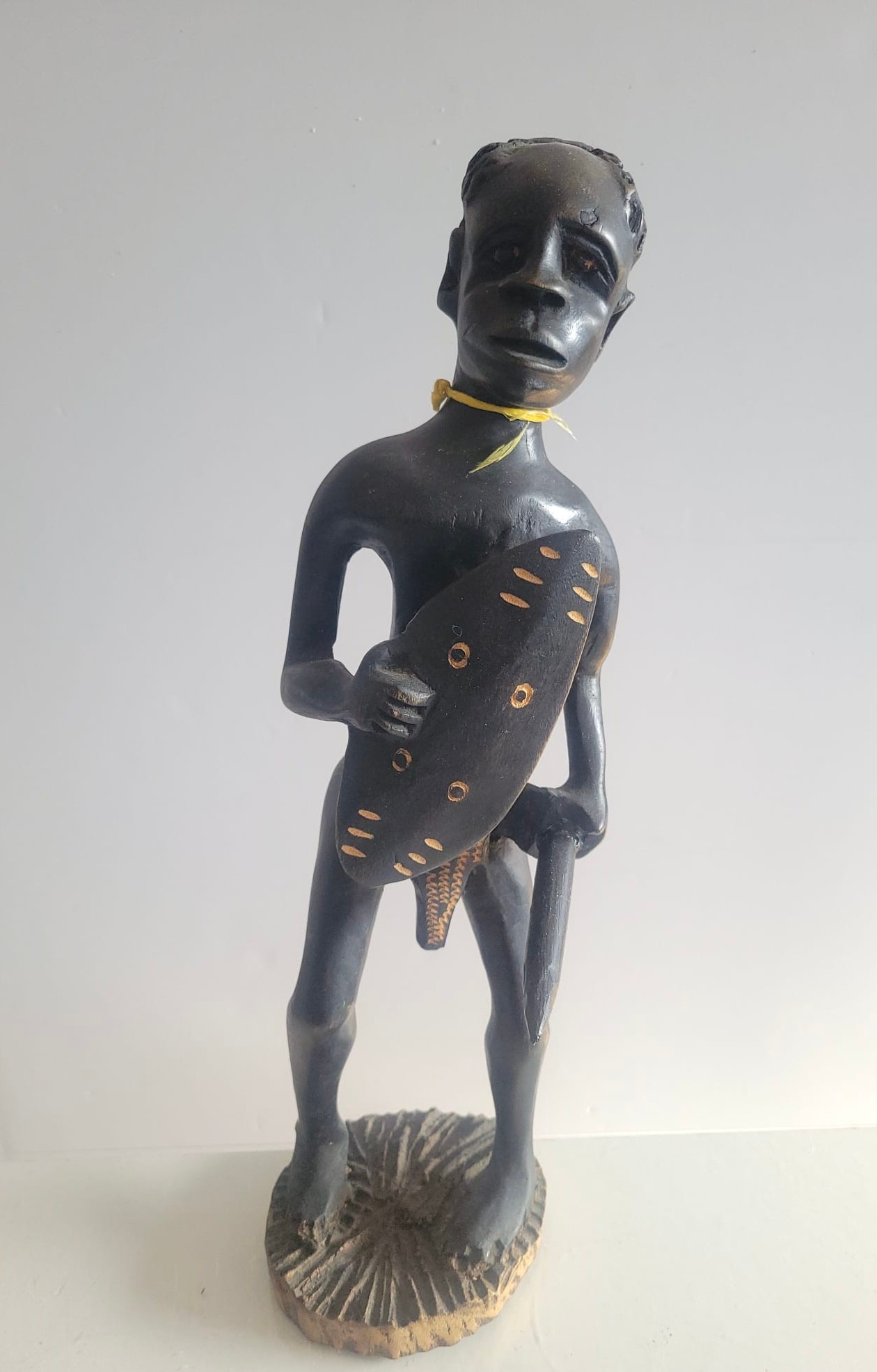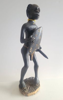 Hand-carved African figure holding a weapon and a shield, often categorized as tribal folk art. Carved wood, typically ebony or a similar dark hardwood. Hand-painted details on the figure and shield