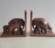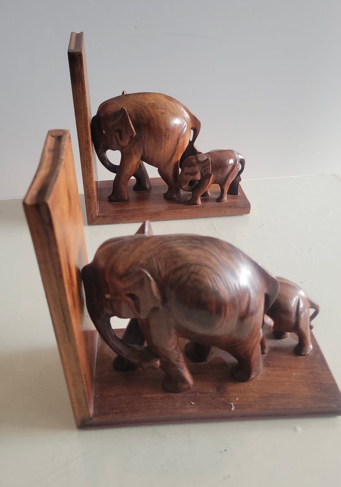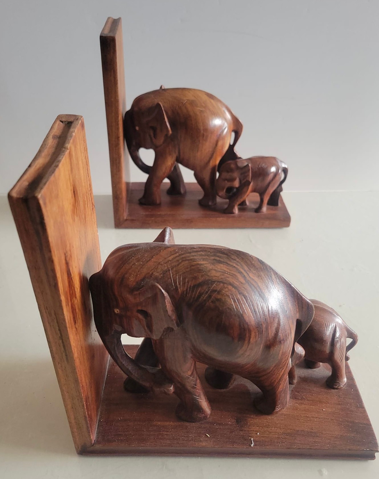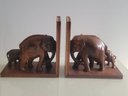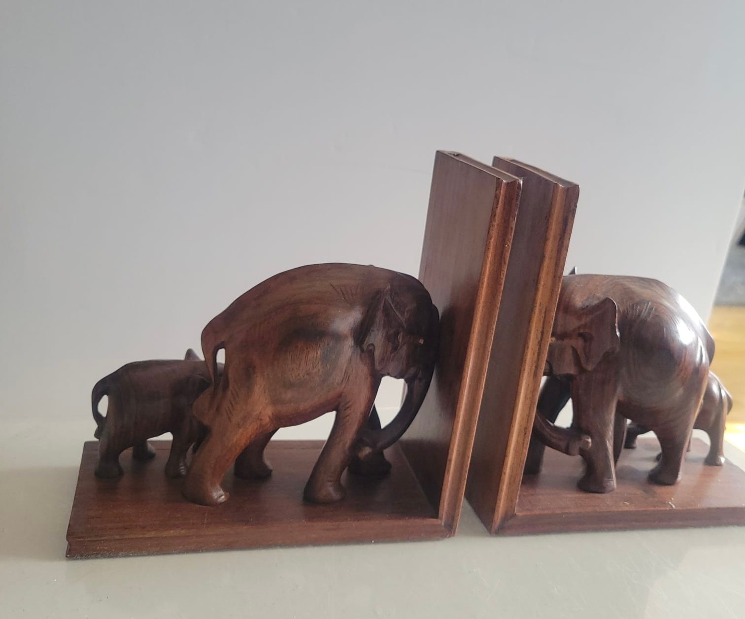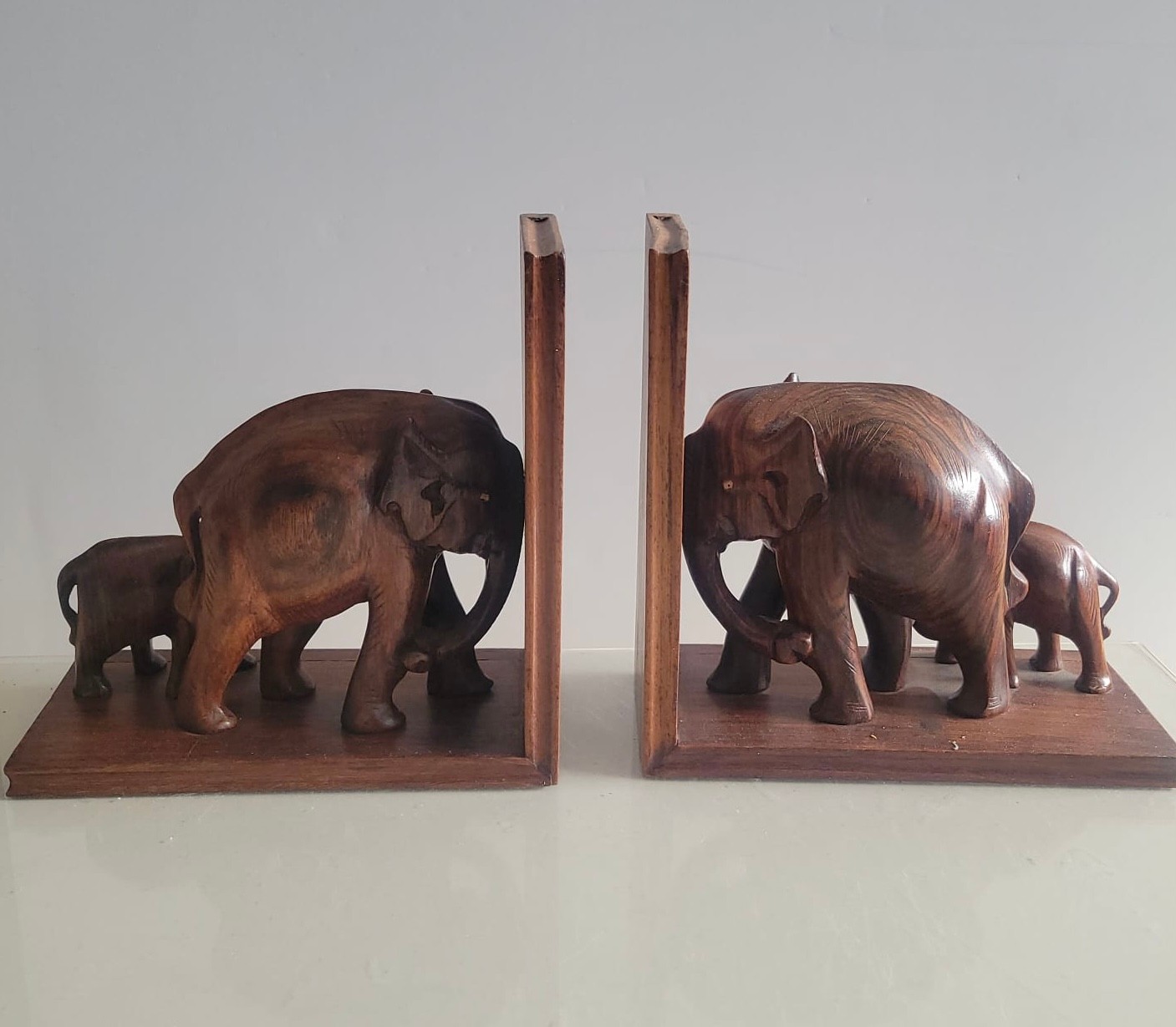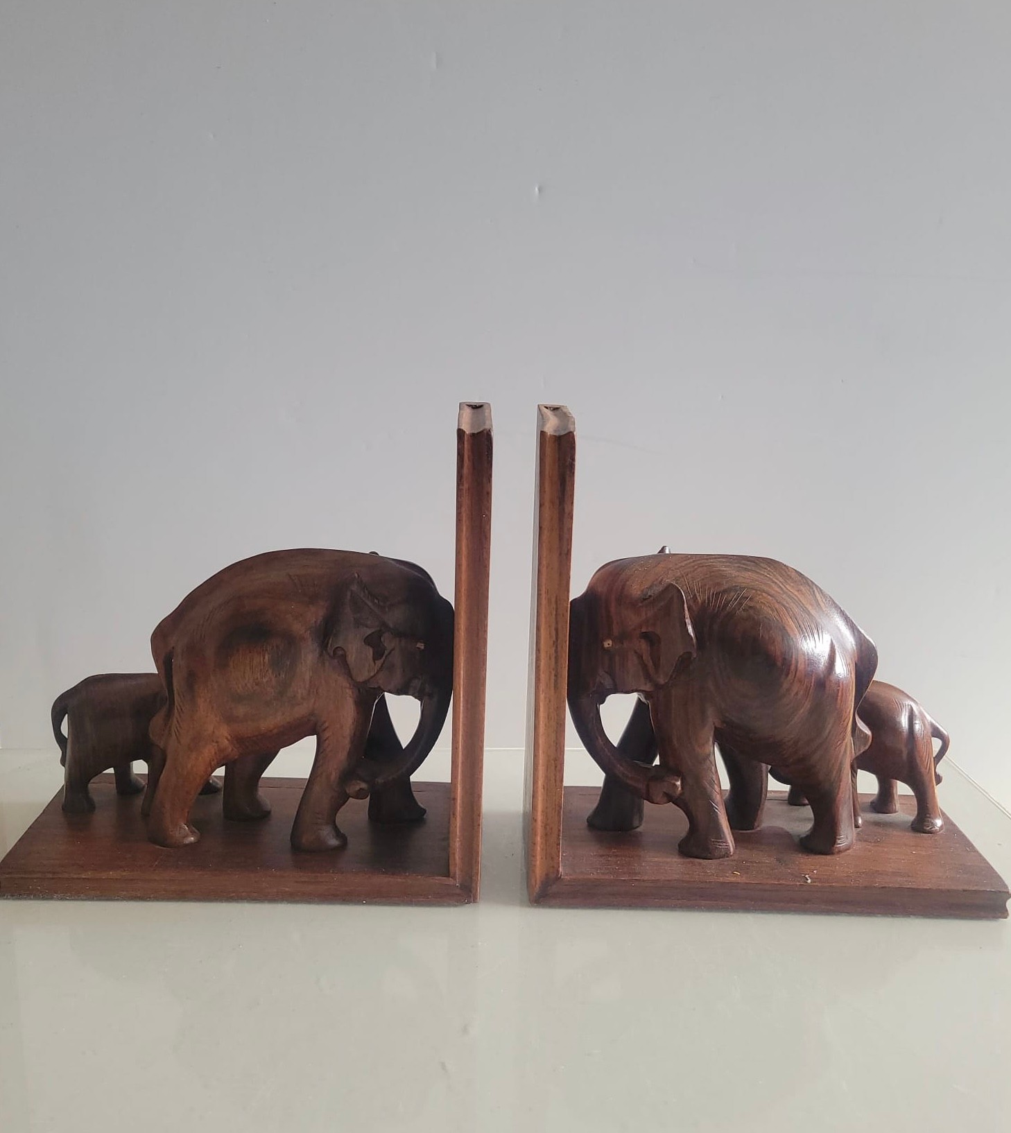 Hand-carved hardwood elephant bookends, likely originating from India or Sri Lanka.