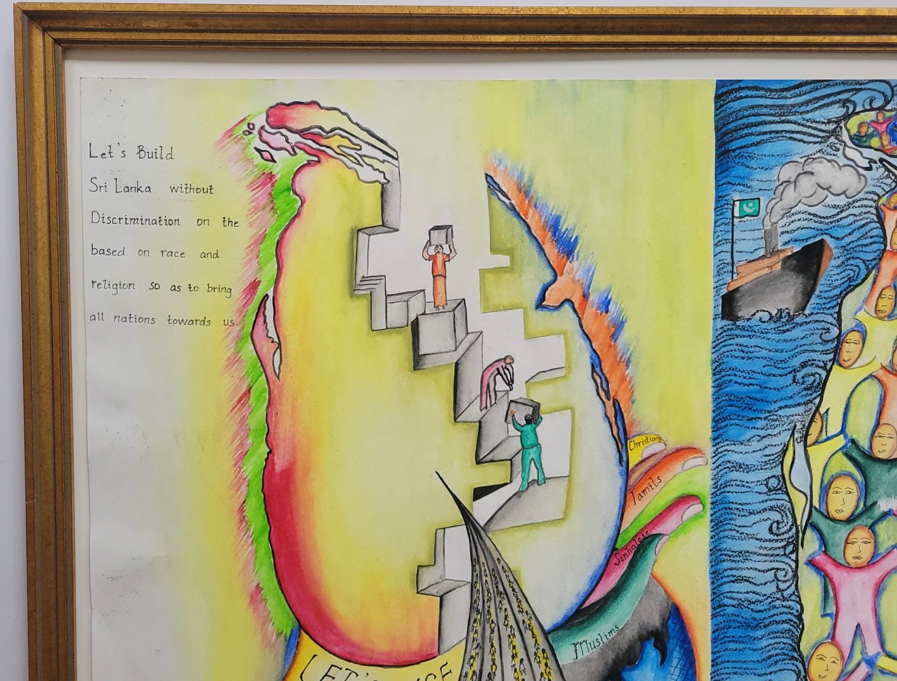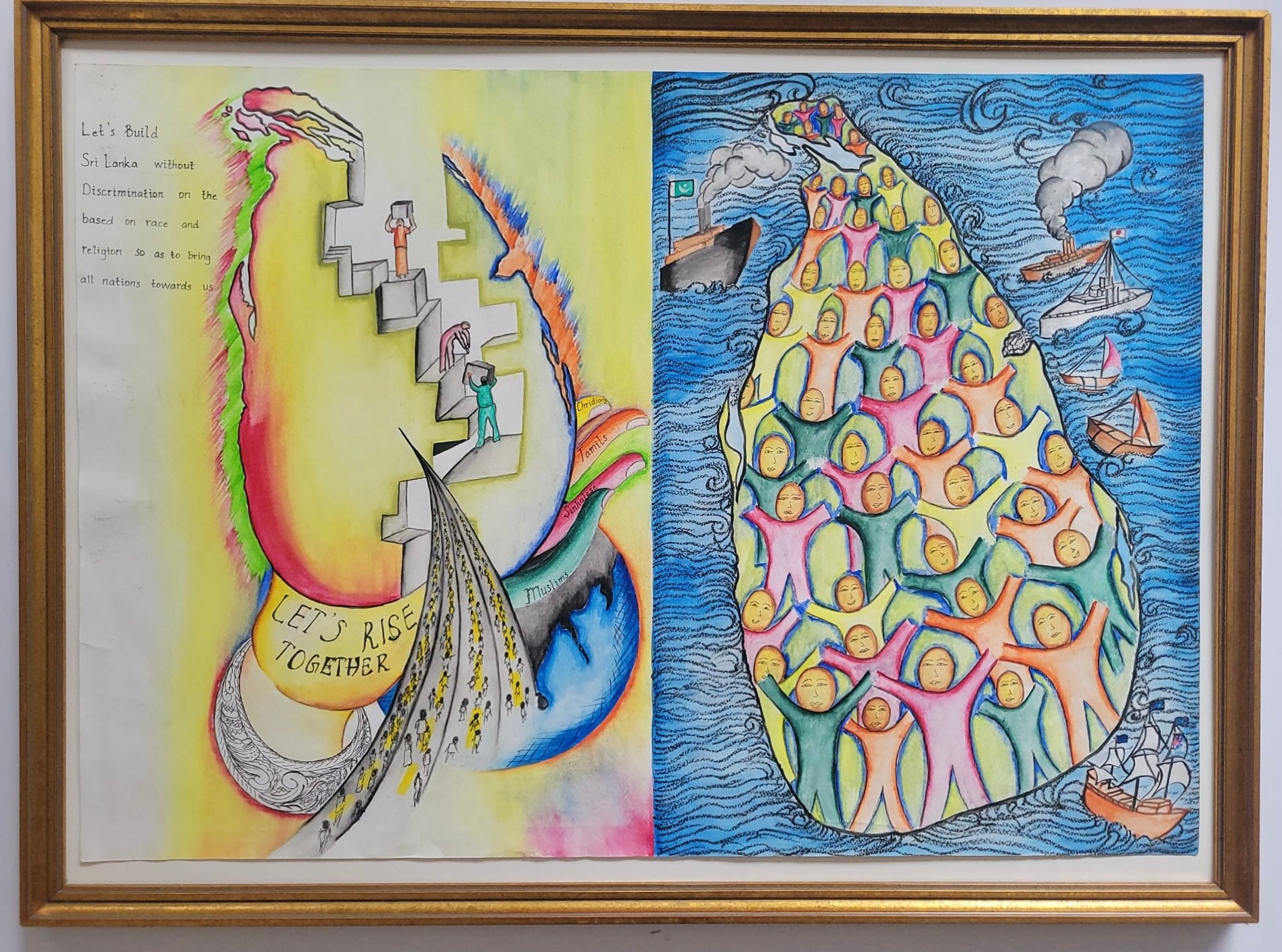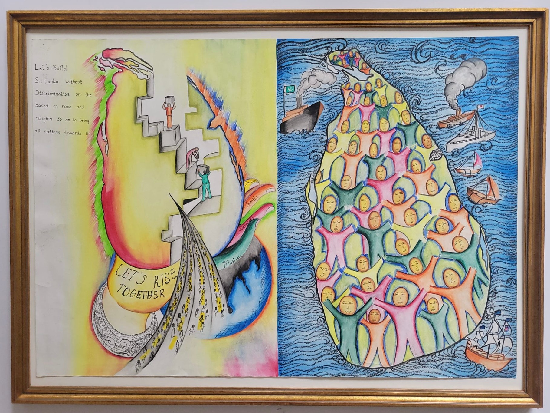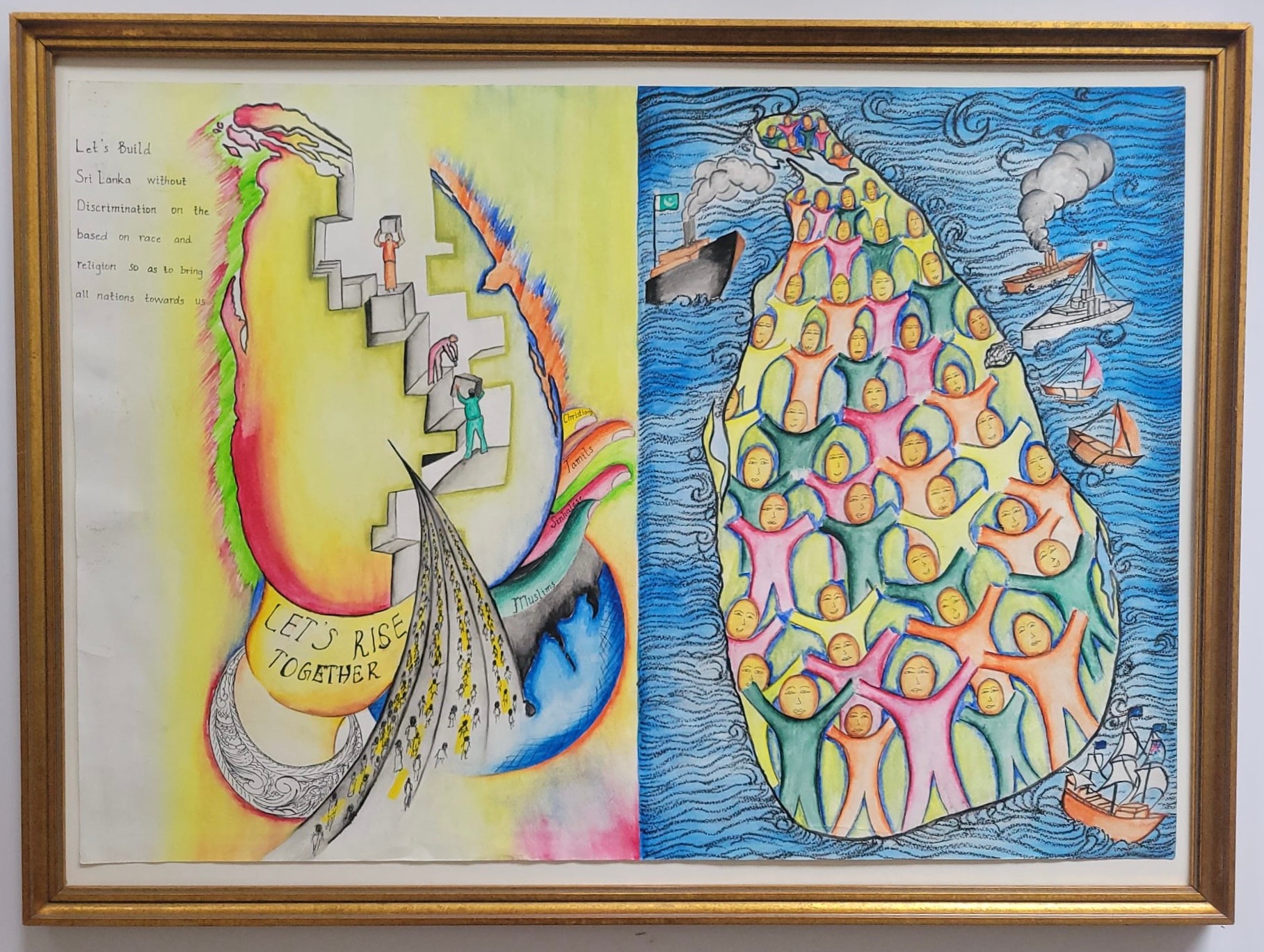 The left side features a message calling to build a nation without discrimination based on race or religion, encouraging everyone to rise together. The right side illustrates a map of Sri Lanka populated with diverse people standing together, with ships nearby.The artwork highlights themes of equality, peace, and national cooperation.