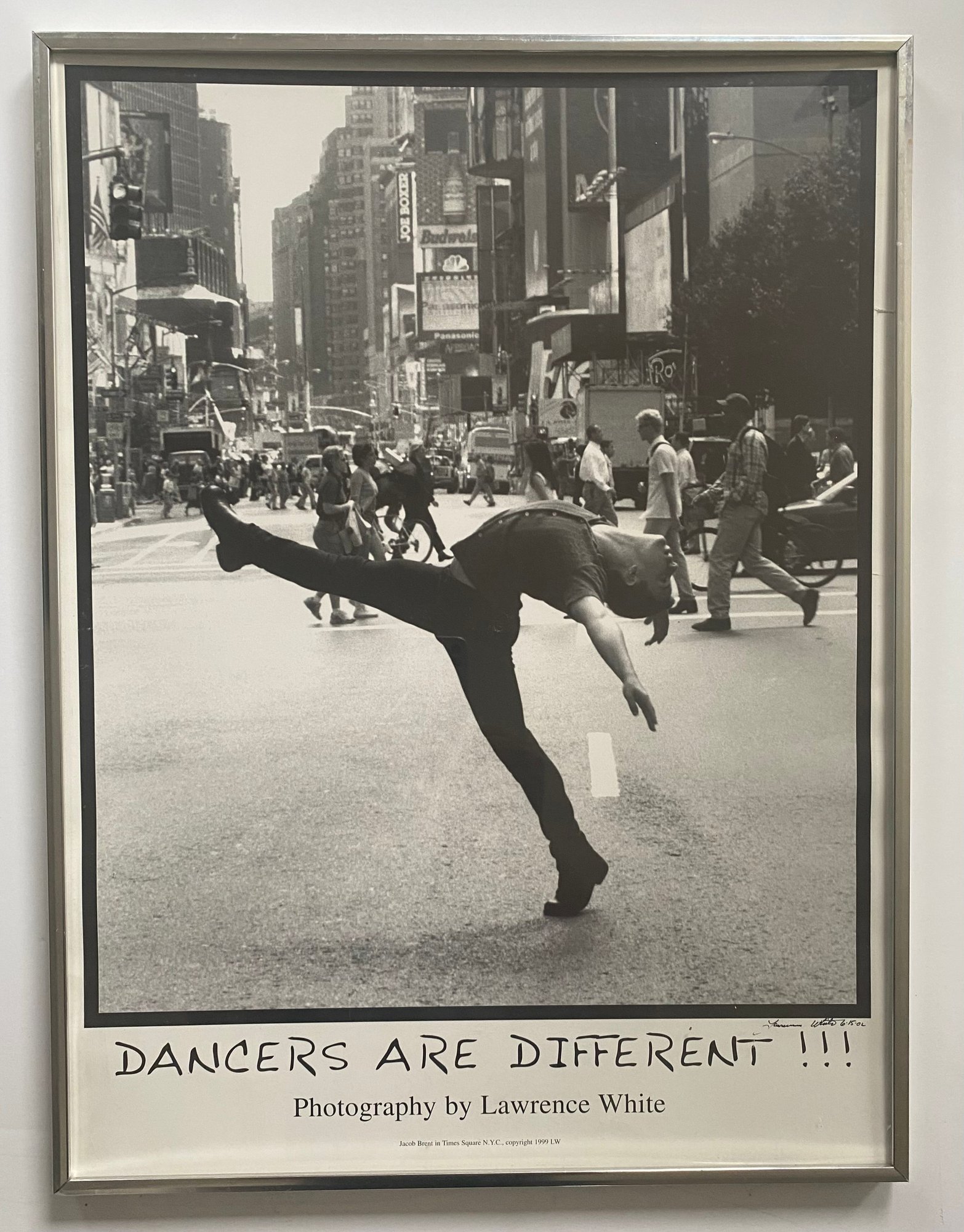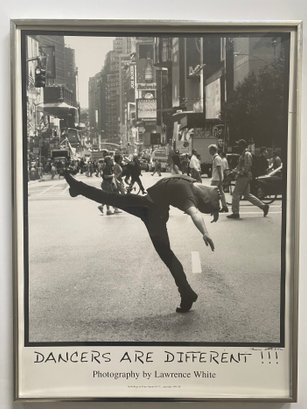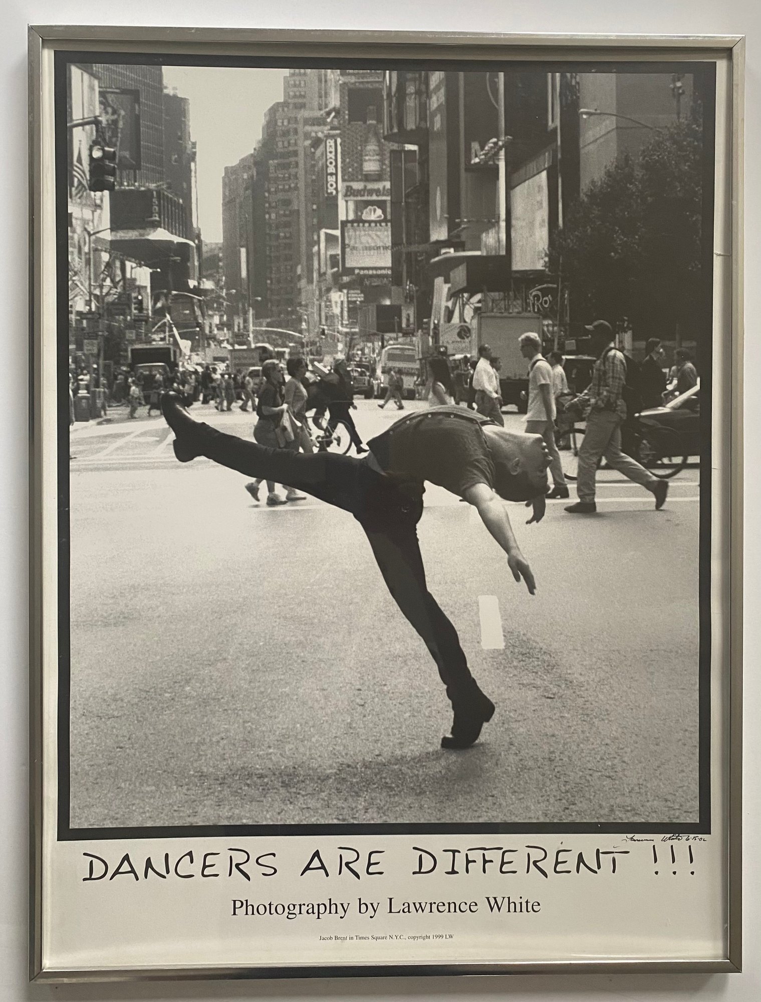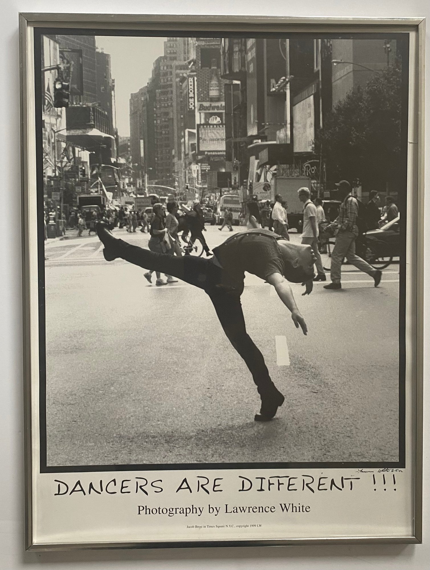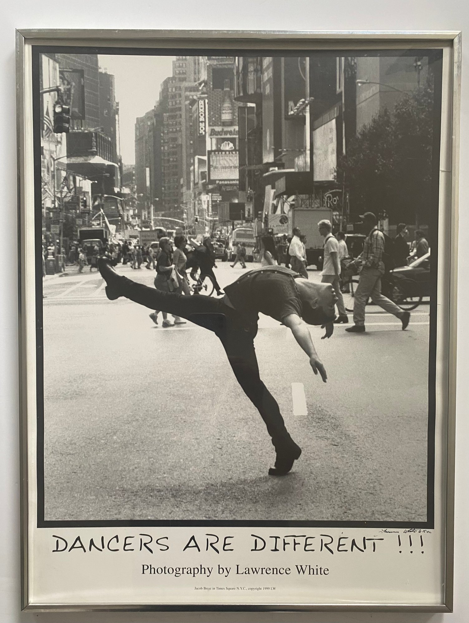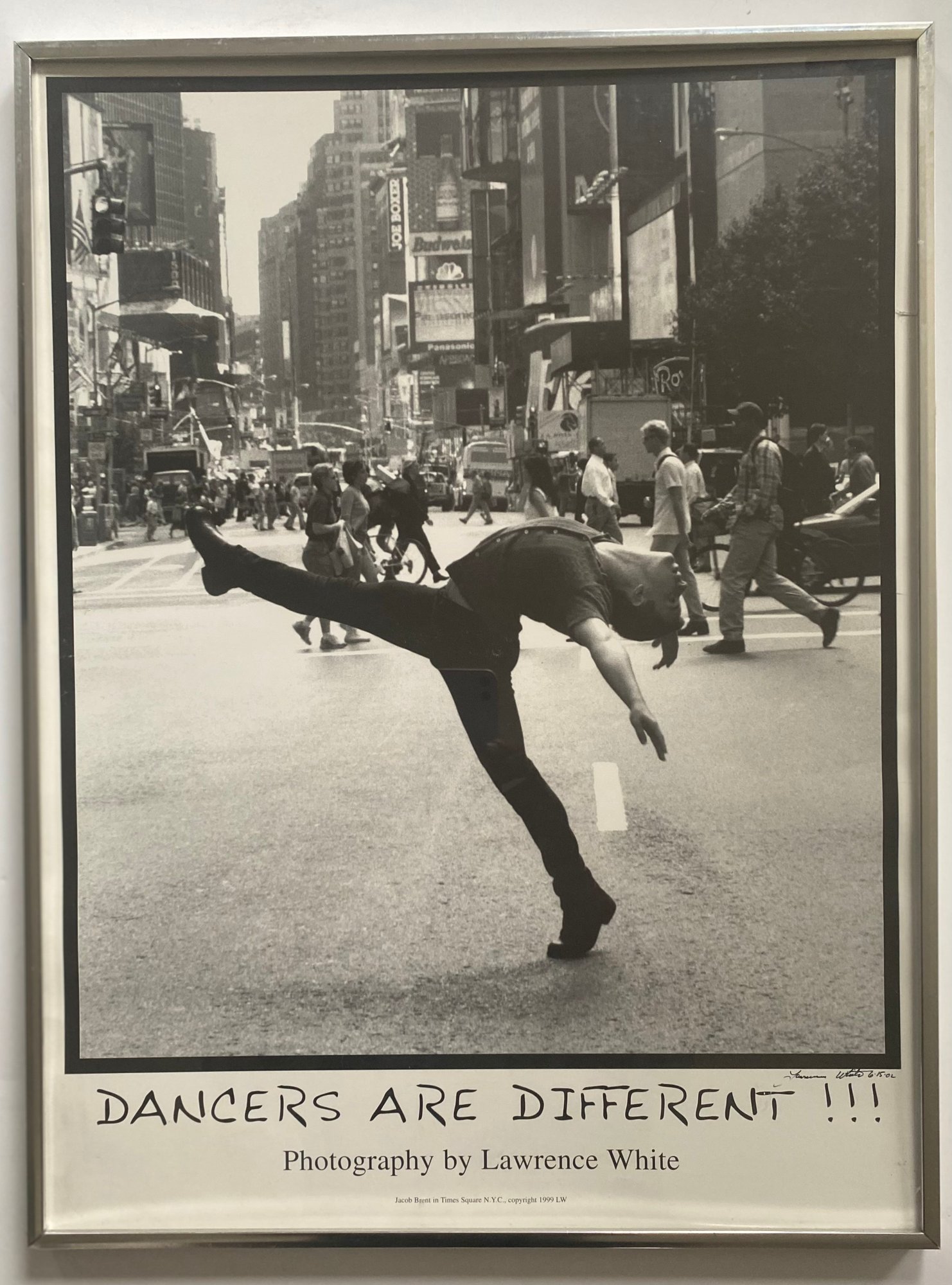 This image is a photograph titled "DANCERS ARE DIFFERENT !!!" by Lawrence White. It features dancer Jacob Brent in Times Square, New York City, and was copyrighted in 1999. The image depicts Brent in a dynamic pose, showcasing the unique physicality and artistry of dancers in an urban setting.