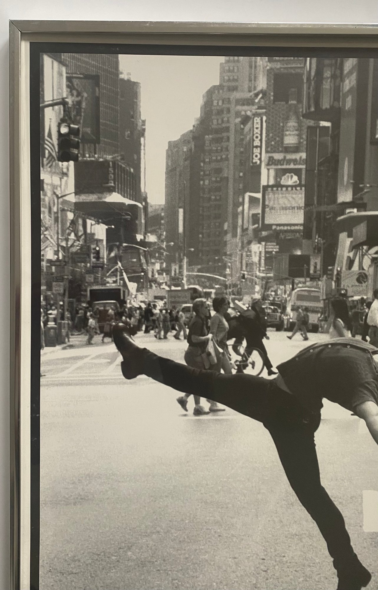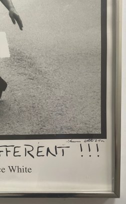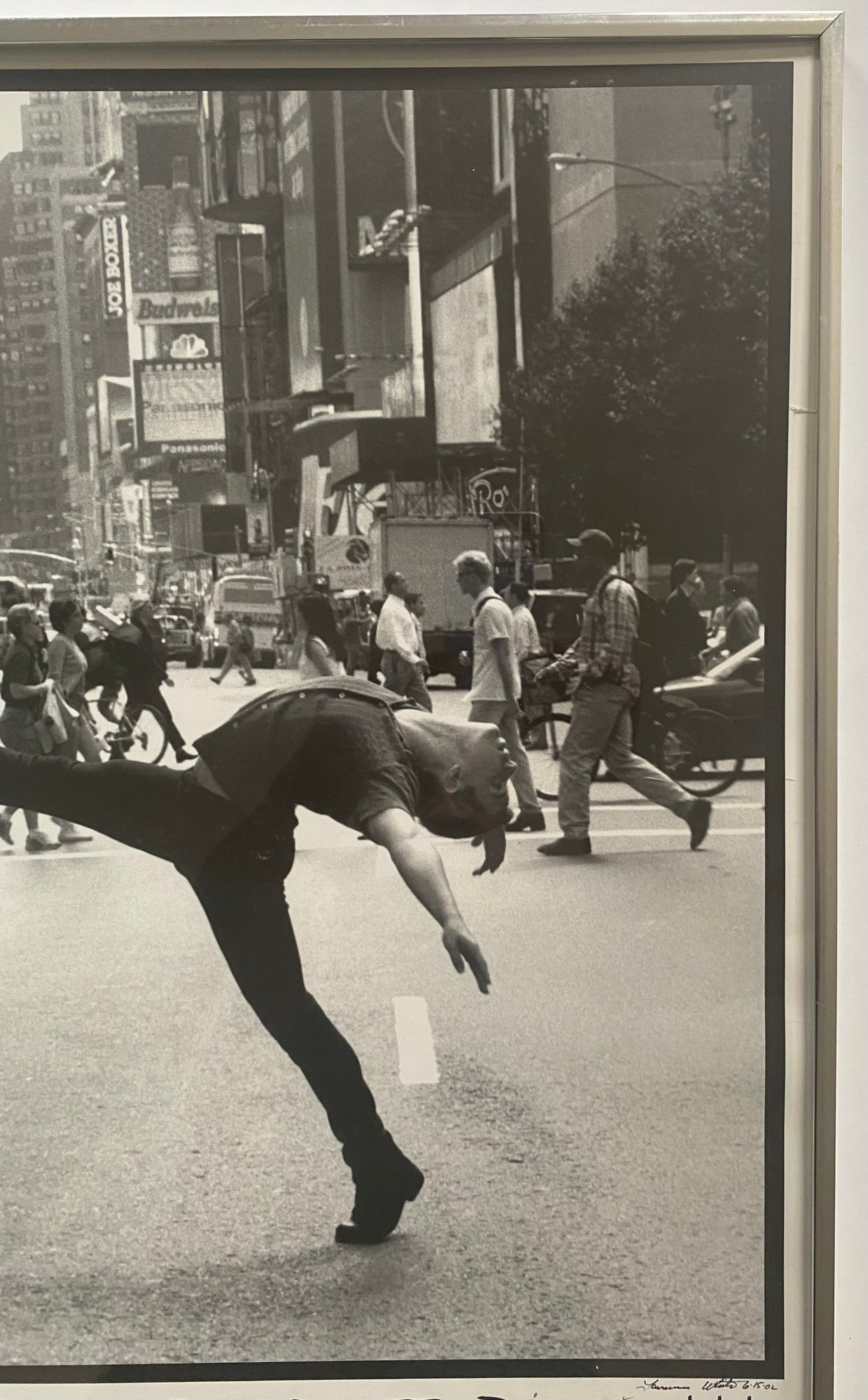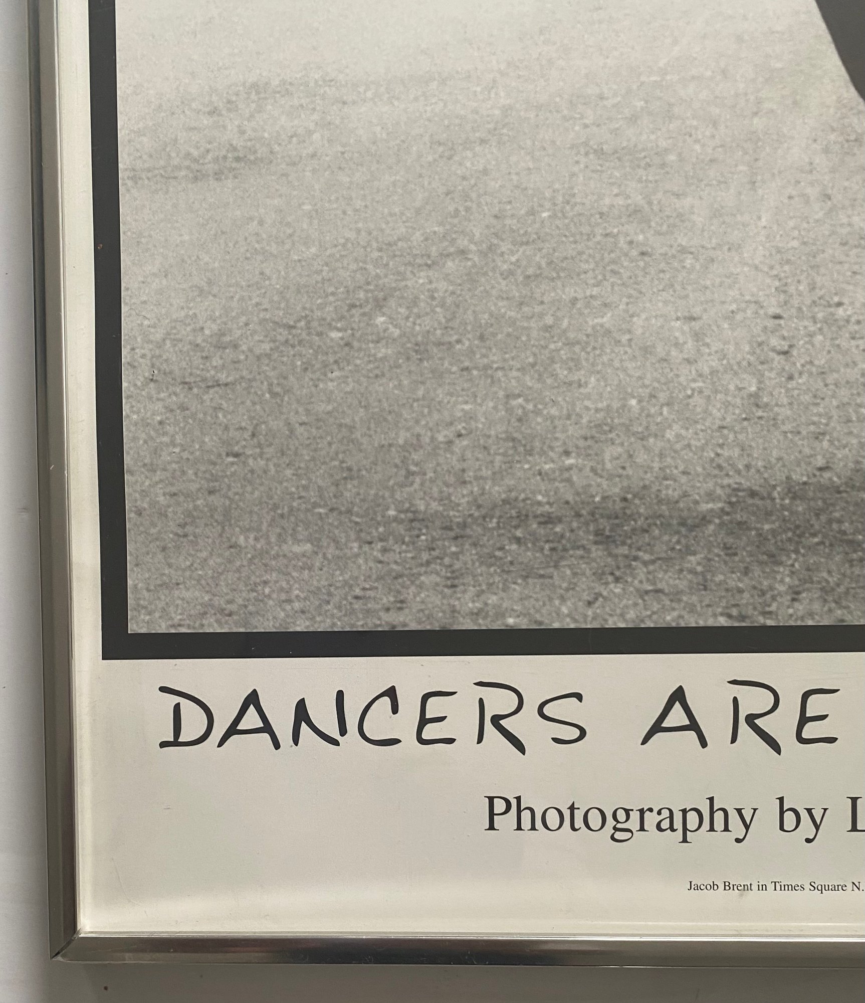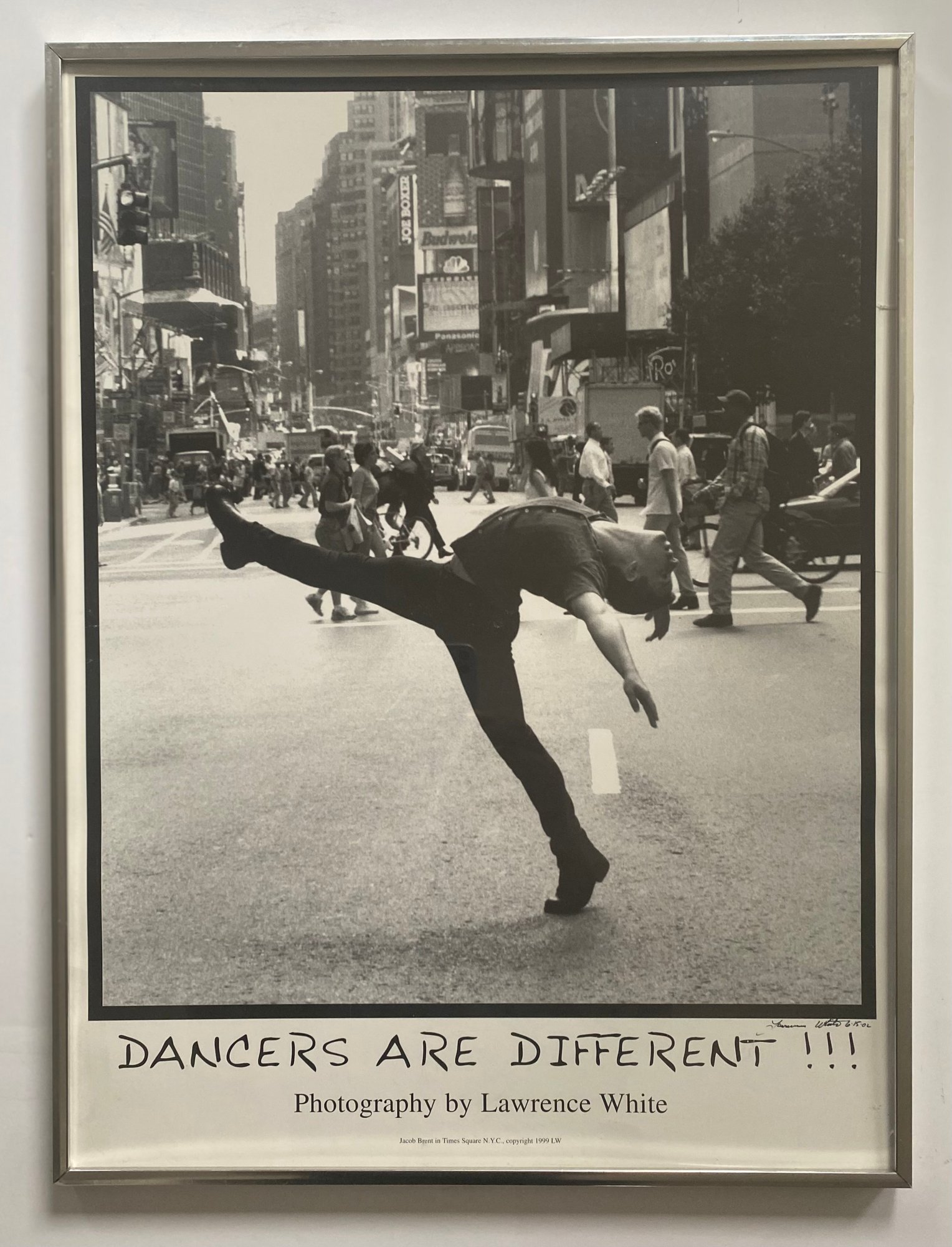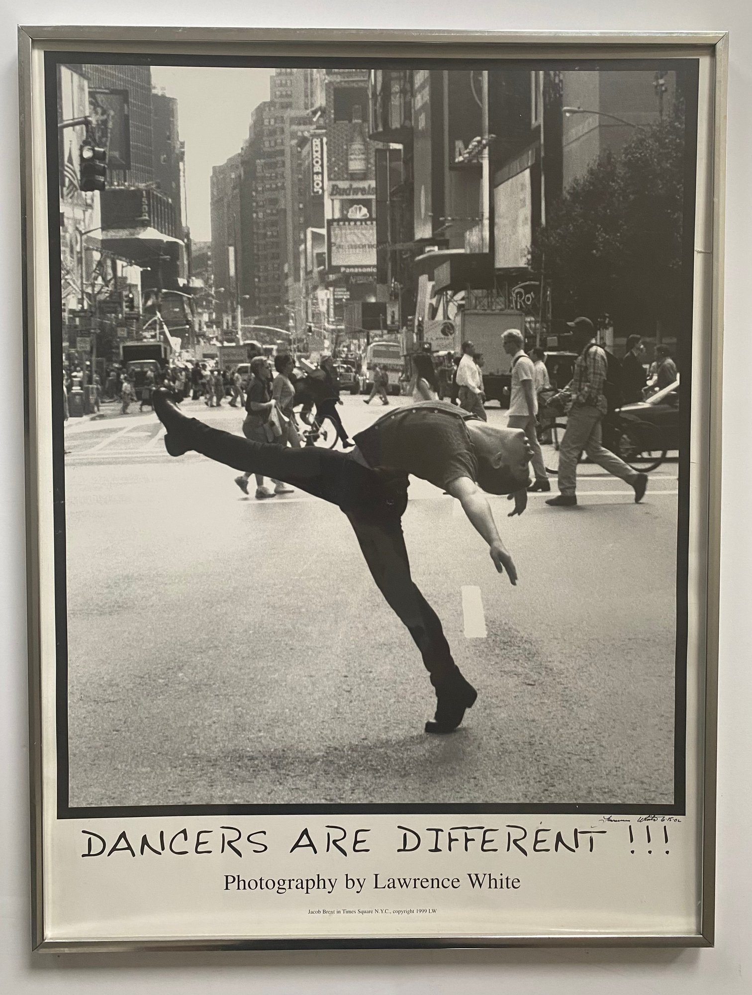 This image is a photograph titled "DANCERS ARE DIFFERENT !!!" by Lawrence White. It features dancer Jacob Brent in Times Square, New York City, and was copyrighted in 1999. The image depicts Brent in a dynamic pose, showcasing the unique physicality and artistry of dancers in an urban setting.