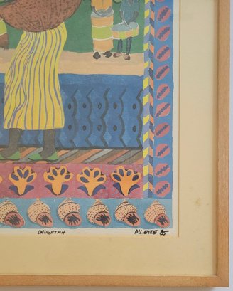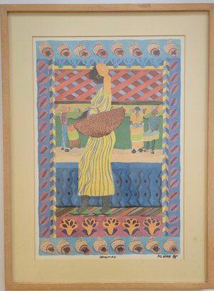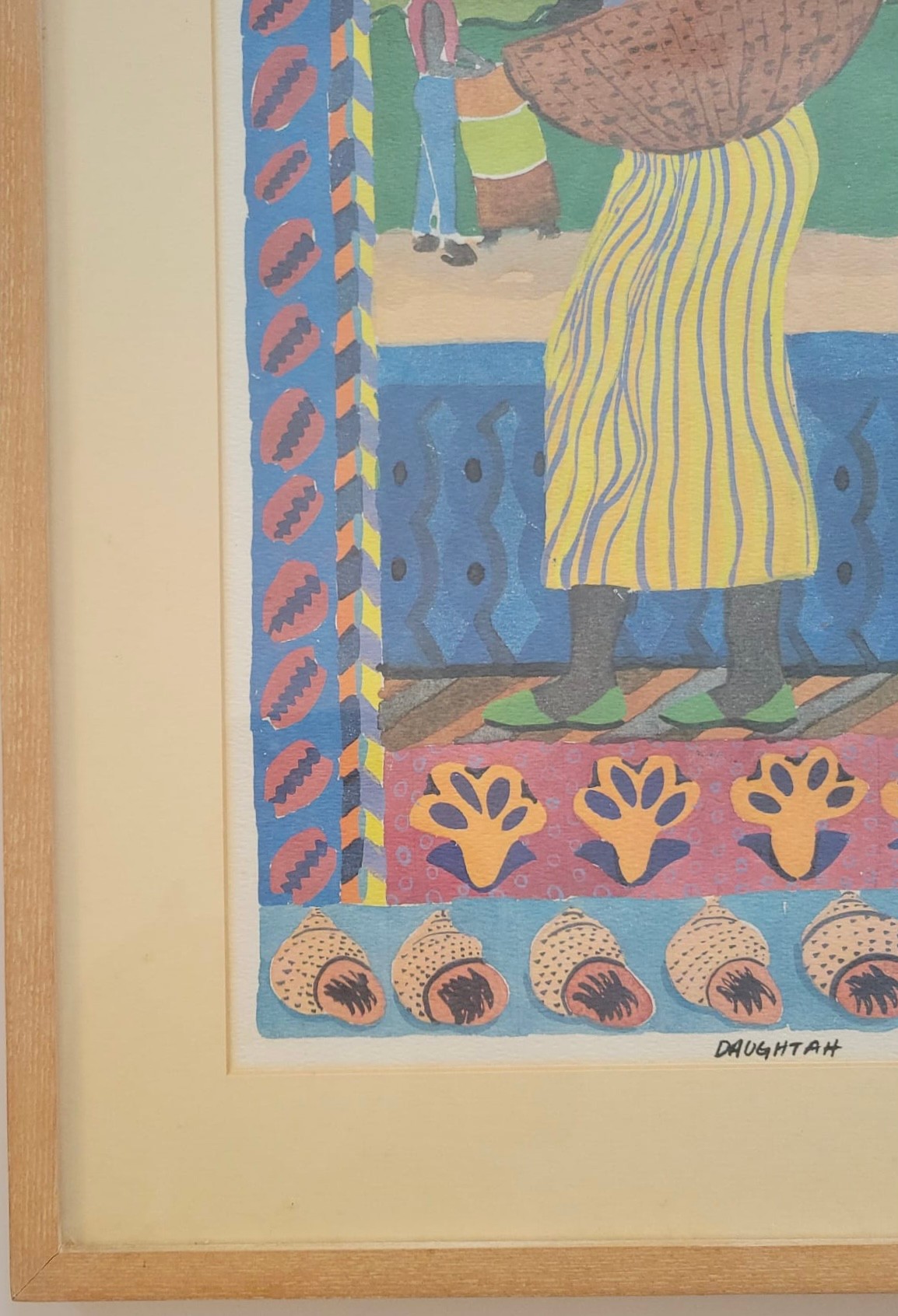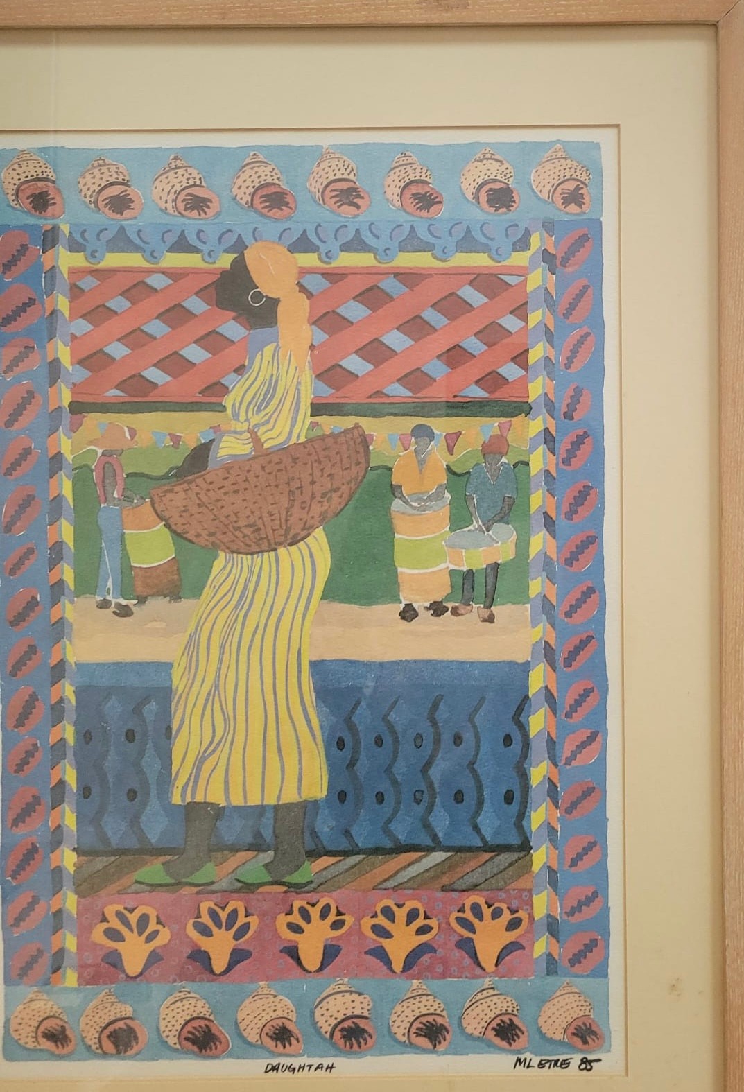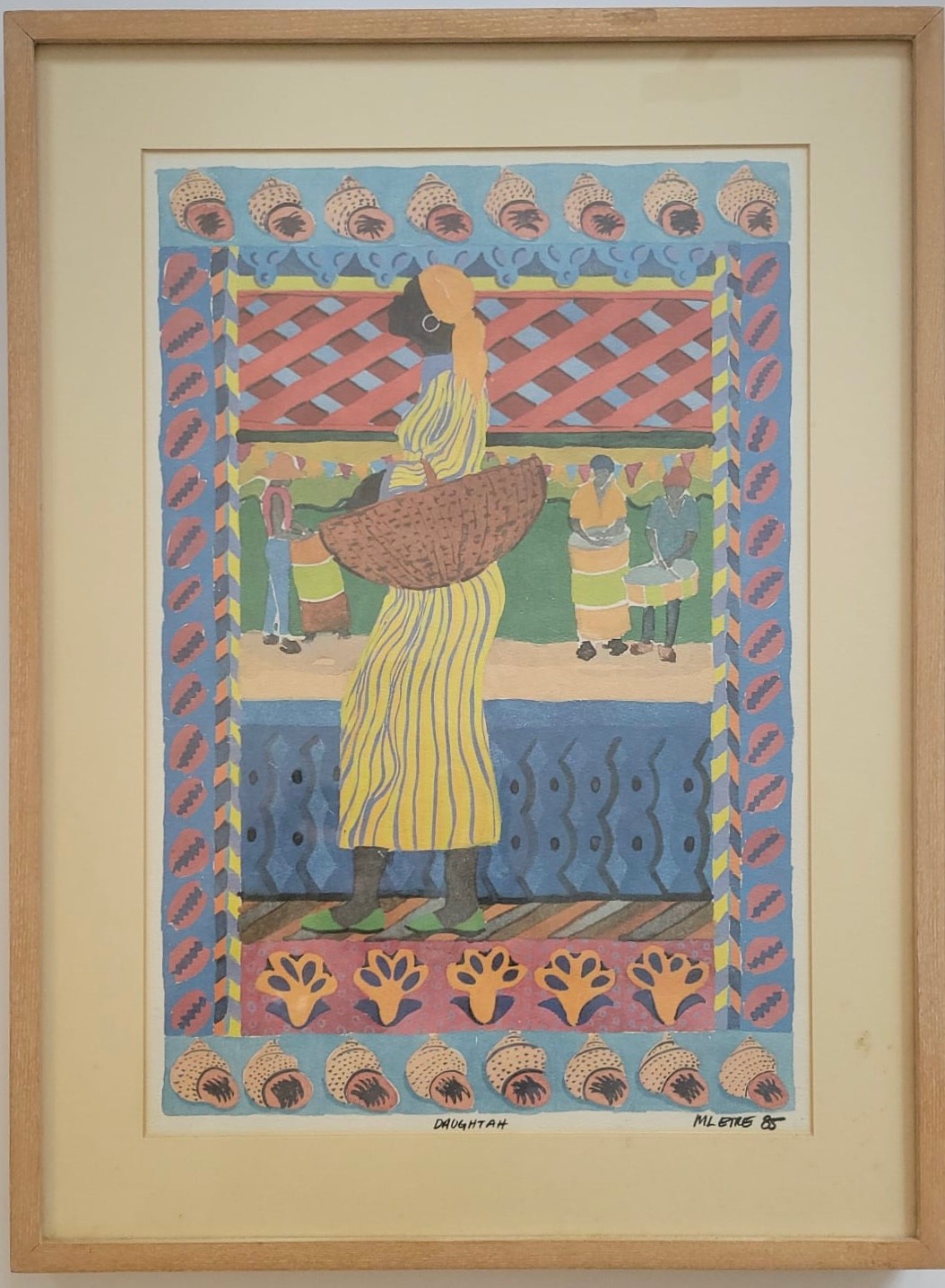 This artwork is a limited edition print titled "Daughtah" by the Virgin Islands artist Lisa Etre. The piece features a vibrant watercolor scene typical of her work, focusing on Caribbean life and culture. It is framed and depicts a figure carrying a basket within a decorated border