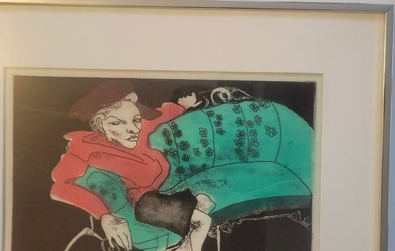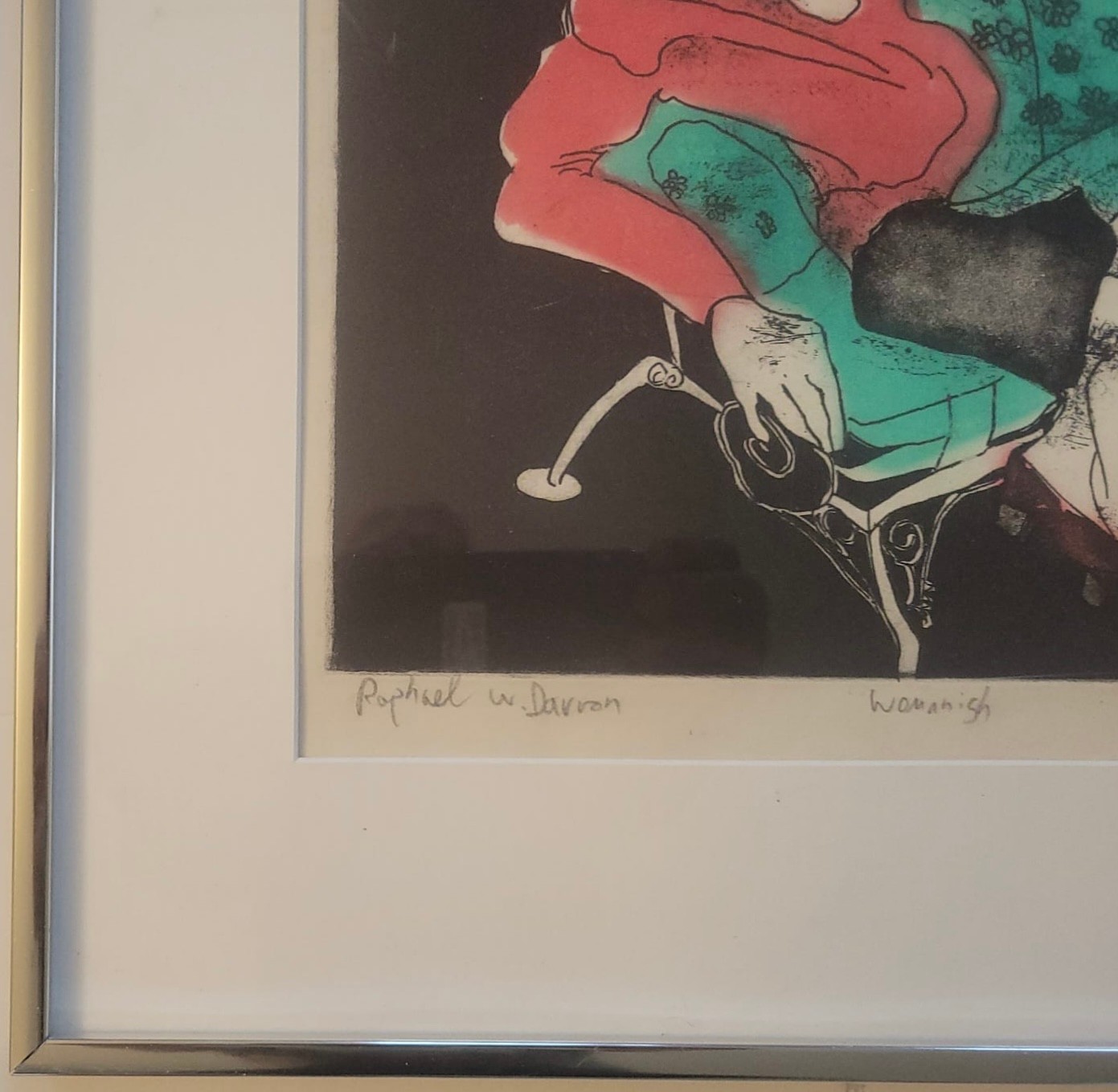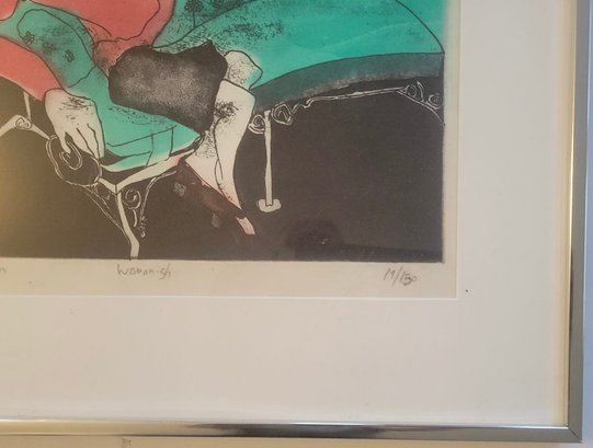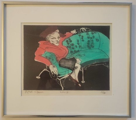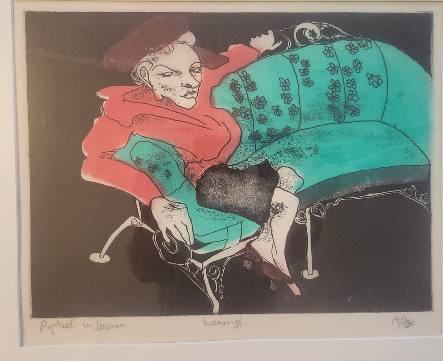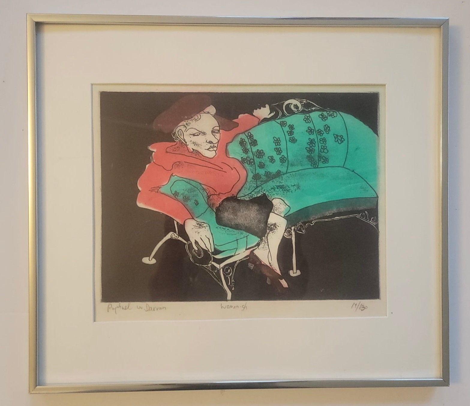 This artwork is a limited edition etching by the 20th-century artist Raphael W. Davron titled "Womannish" (19/150)
