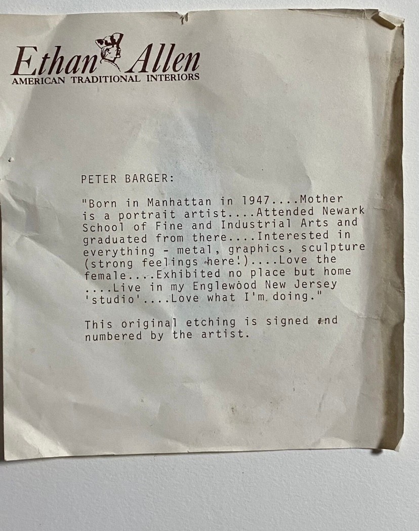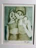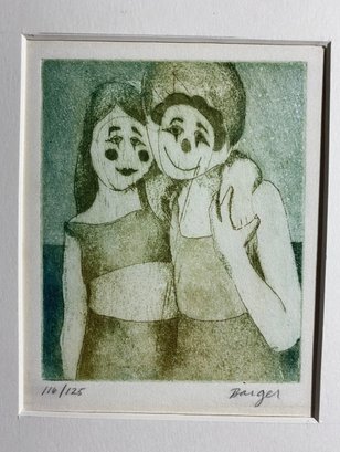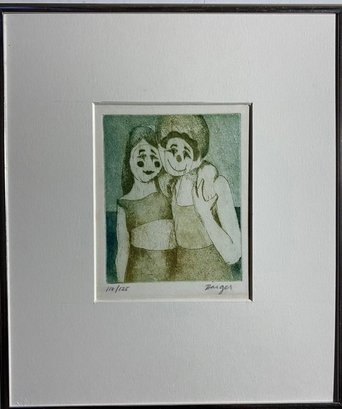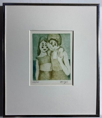 This artwork appears to be an etching or print by artist Peter Barger, titled "Happy Clowns". The piece in the image is numbered 110/125, indicating it is part of a limited edition. The print depicts two stylized figures, possibly clowns, embracing each other.