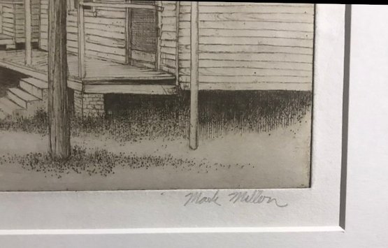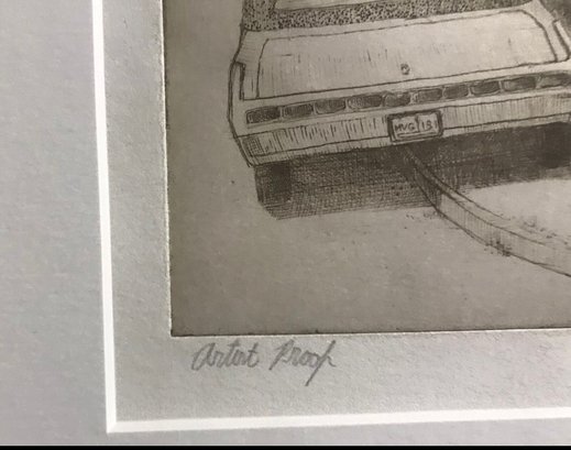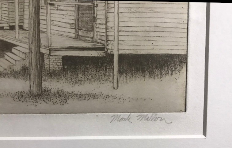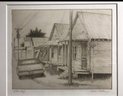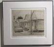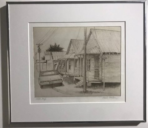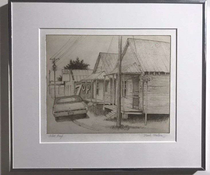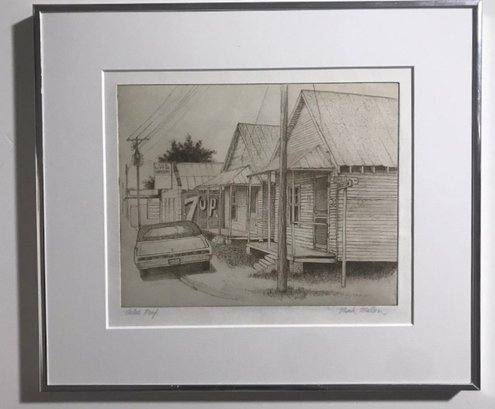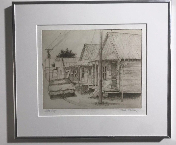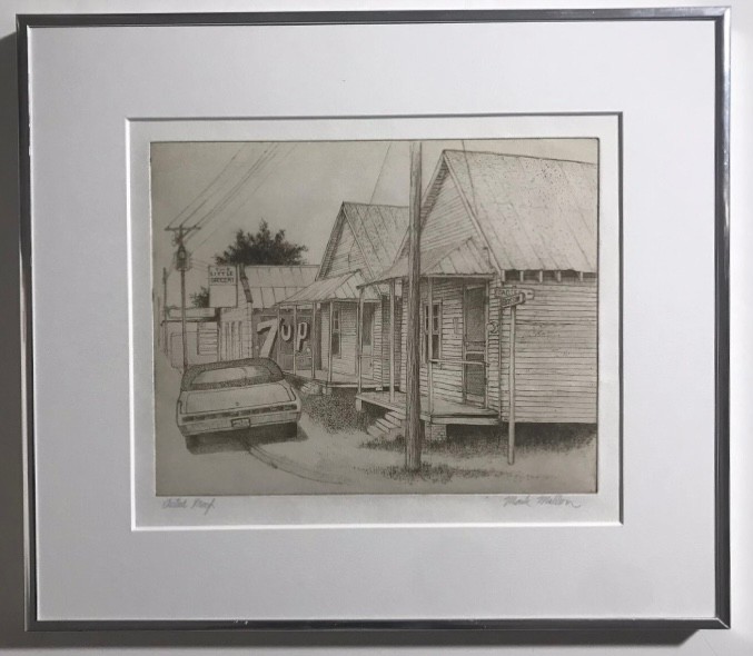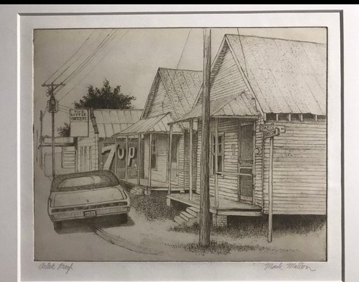 Limited Edition Etching Titled "Row of Houses" by artist Mark Mellon. The image depicts a street scene with several houses and a car in what appears to be a historic neighborhood. The image contains text that reads "LITTLE GROCERY" on a sign and "CAUSE MISSUR" and "7UP" on other signs. The drawing is signed by the artist and labeled "Artist proof."