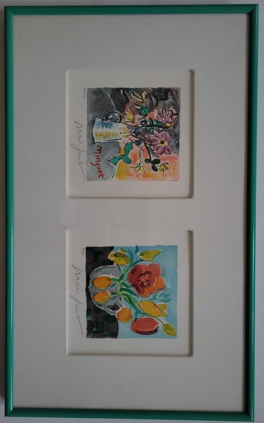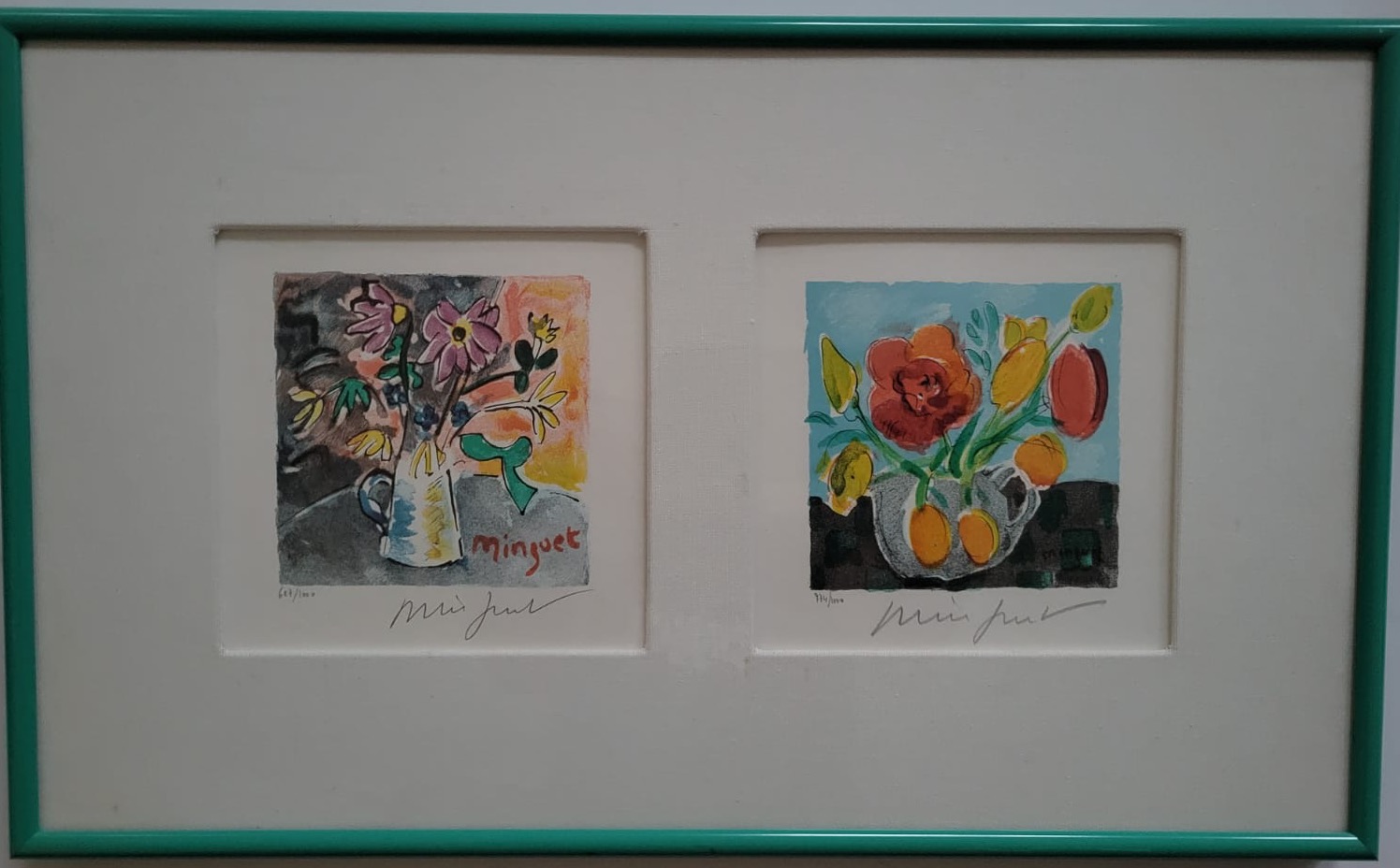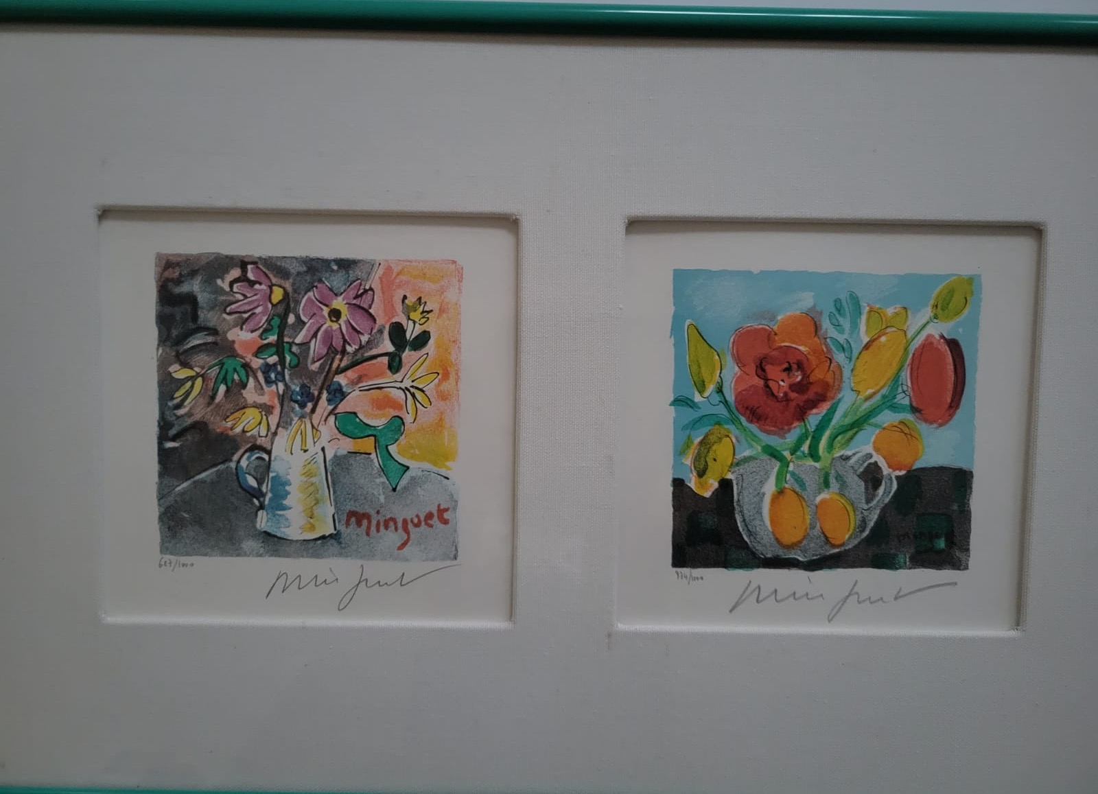 “Celebrate the joy of nature with this exquisite pair of floral prints by Minguet. Each composition bursts with vibrant colors and lively brushwork, evoking the freshness and elegance of a blooming bouquet. These limited-edition prints, signed and numbered by the artist, are beautifully framed with a chic green border, adding a touch of modern sophistication. Perfect for brightening your home or gifting to a loved one, this artwork combines charm, creativity, and timeless appeal.”