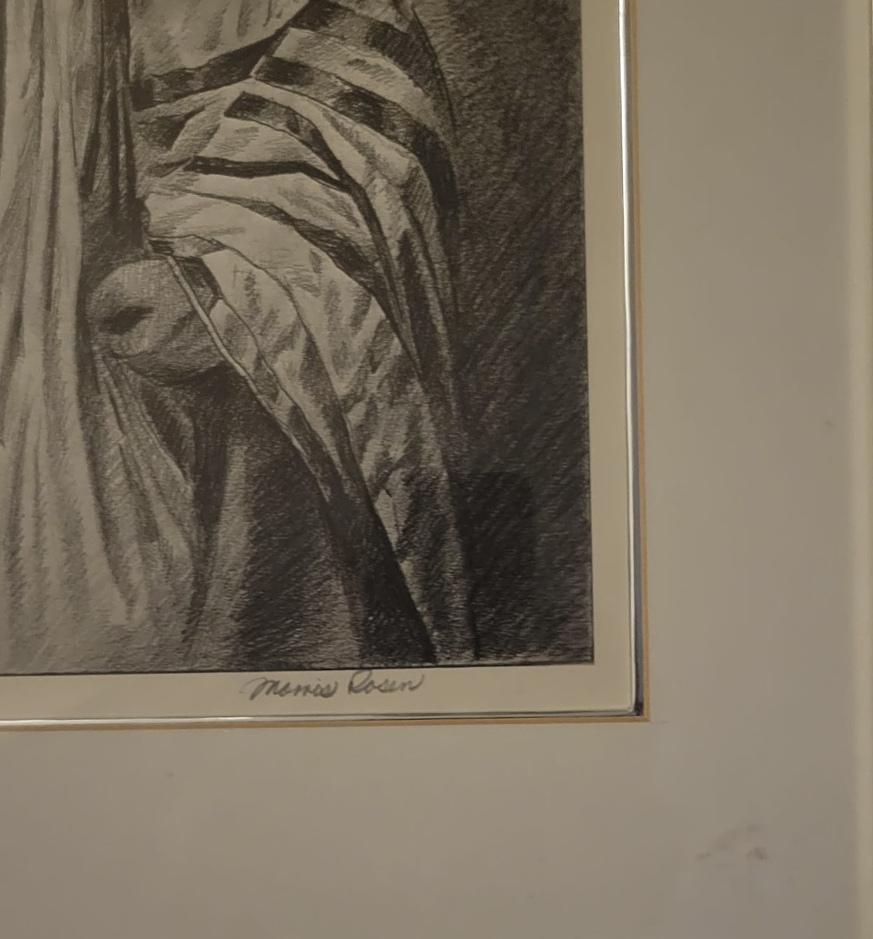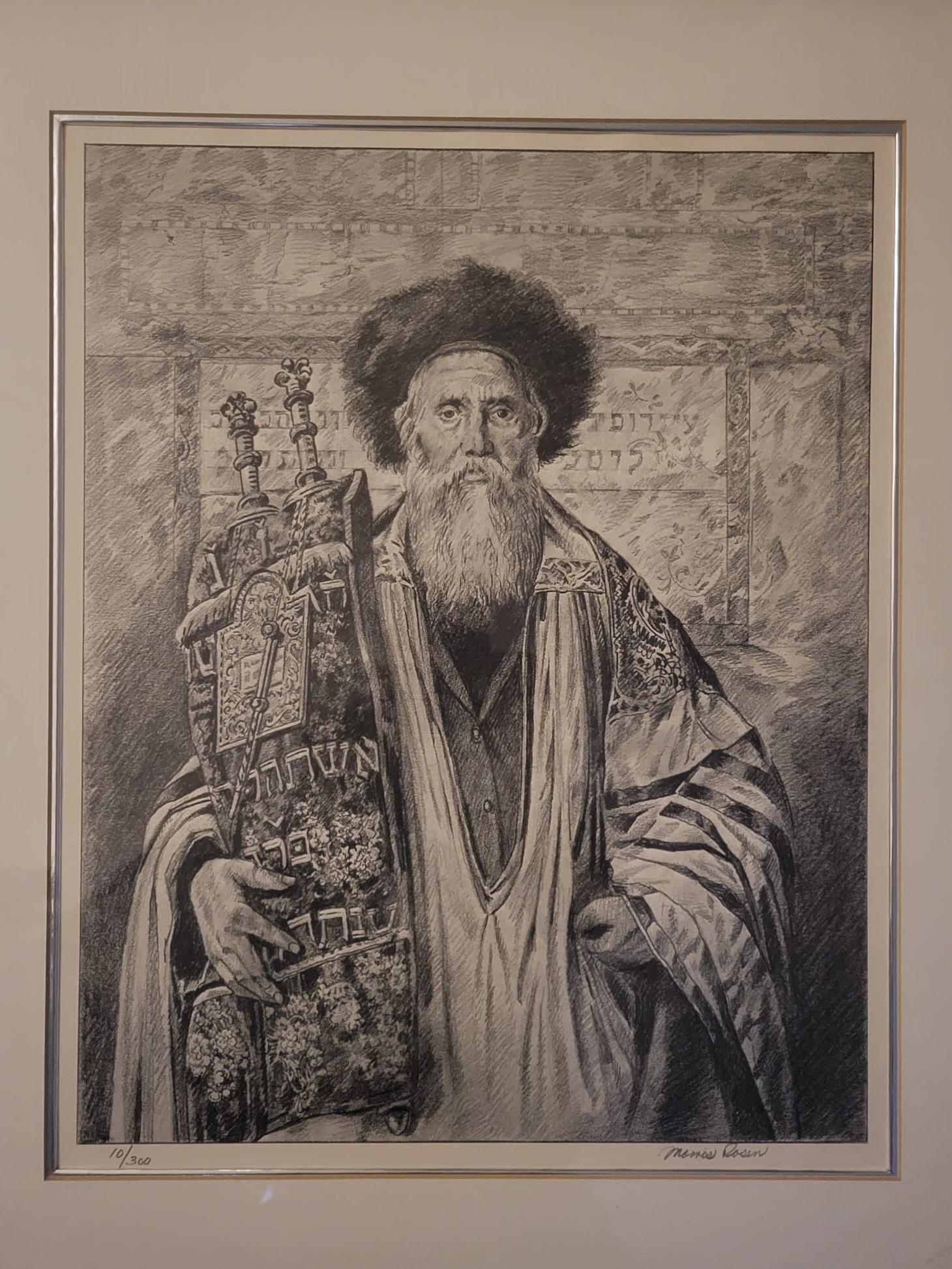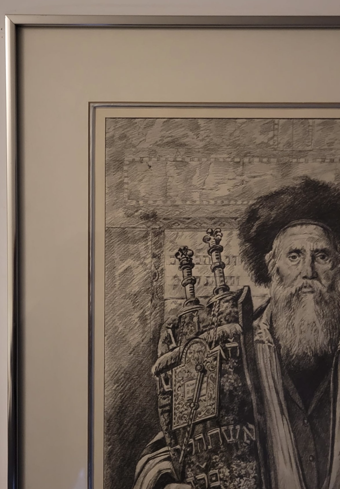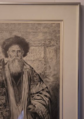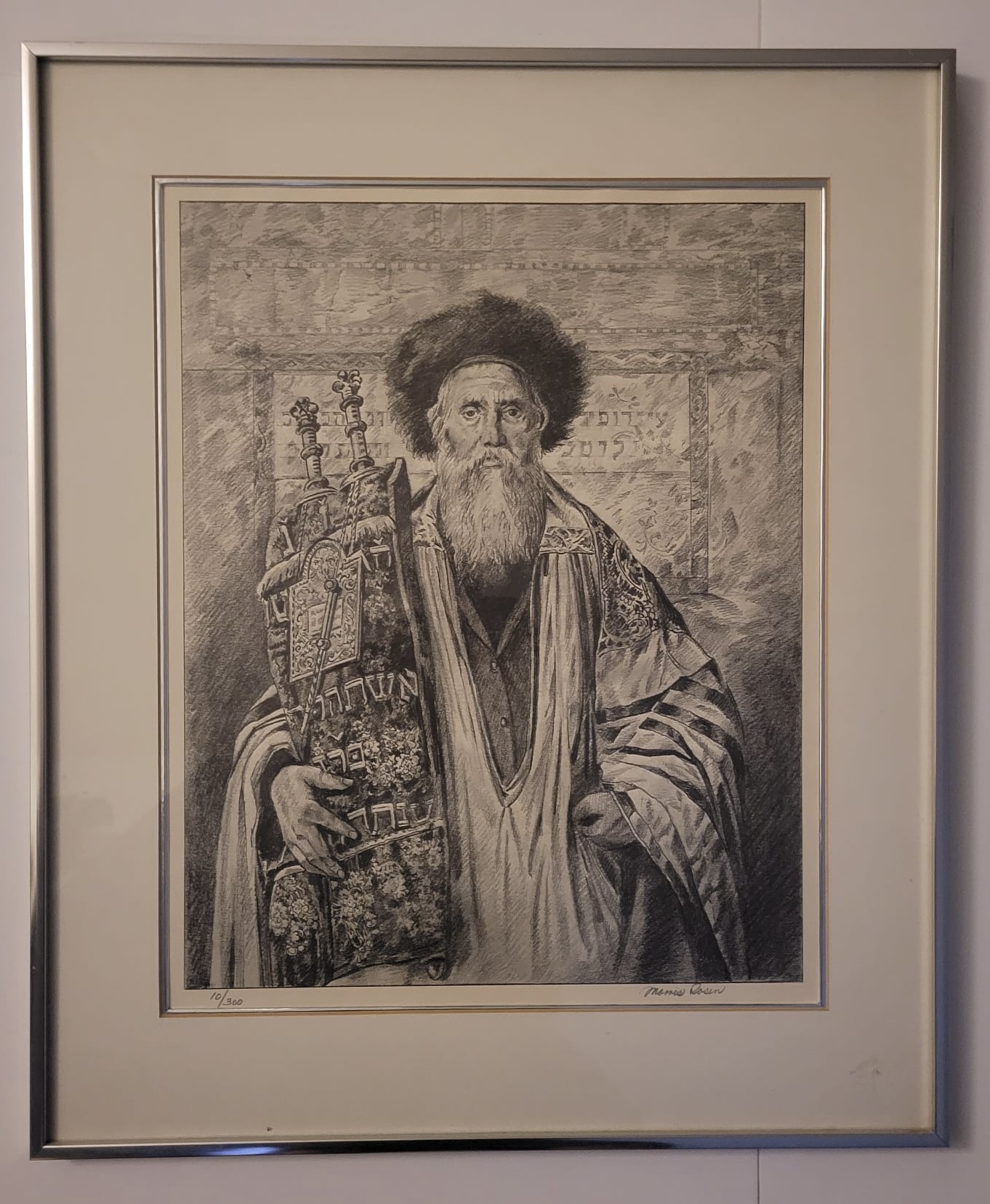 The image shows a detailed black-and-white artwork of an elderly man holding a Torah scroll. He is depicted wearing traditional clothing, including a tallit (prayer shawl) and a fur hat. The background features inscriptions in Hebrew, adding to the cultural and religious significance of the piece.