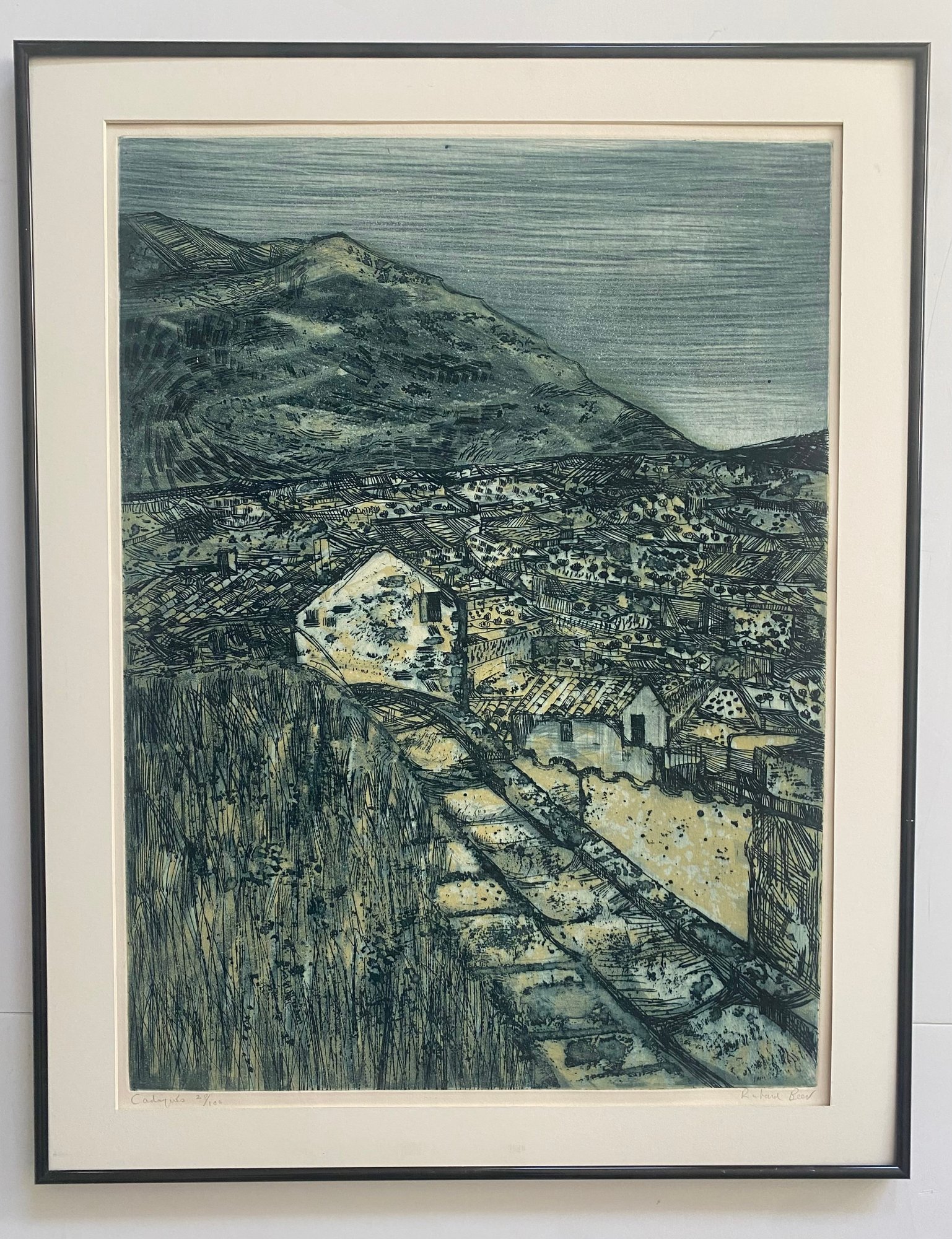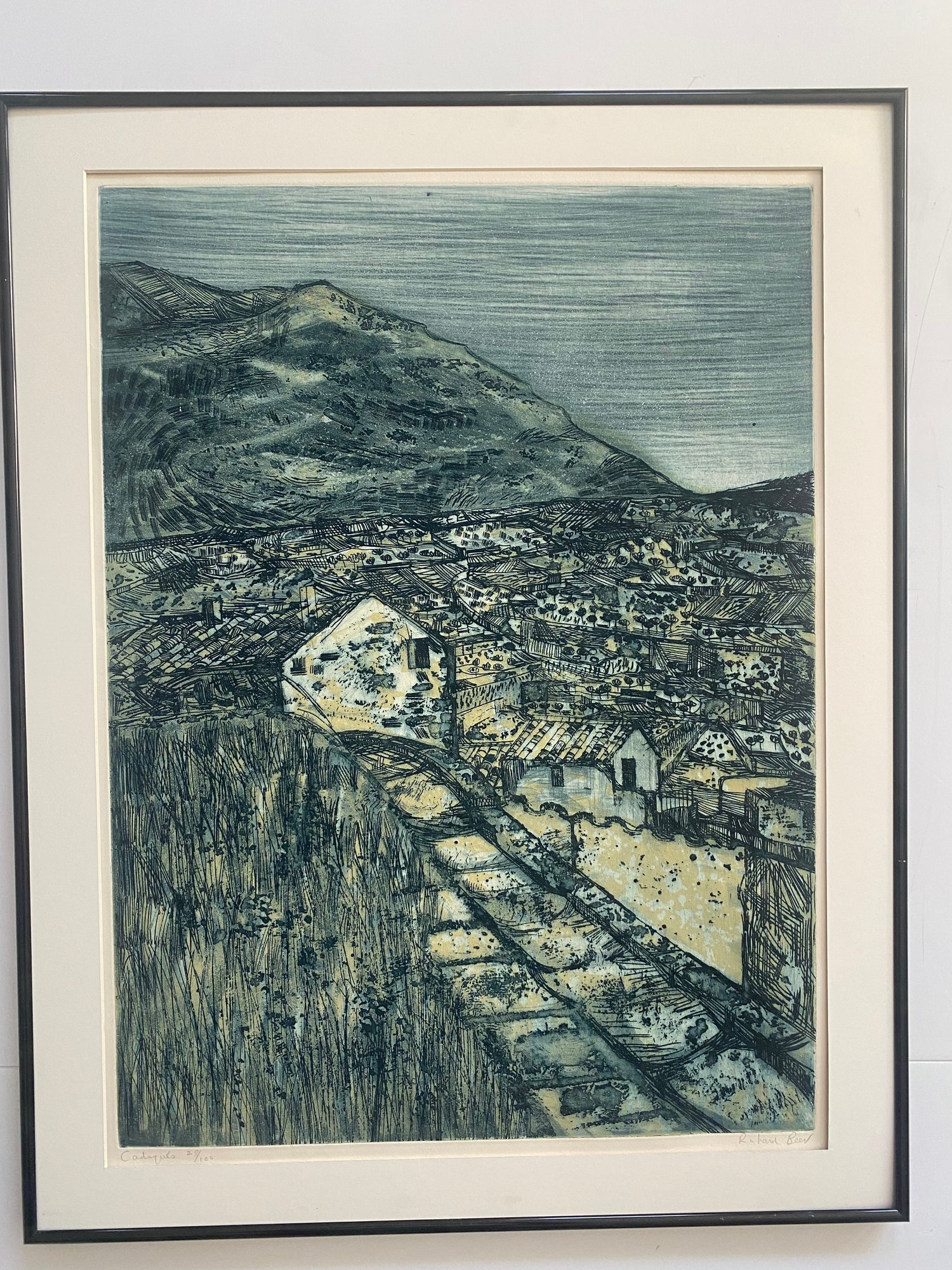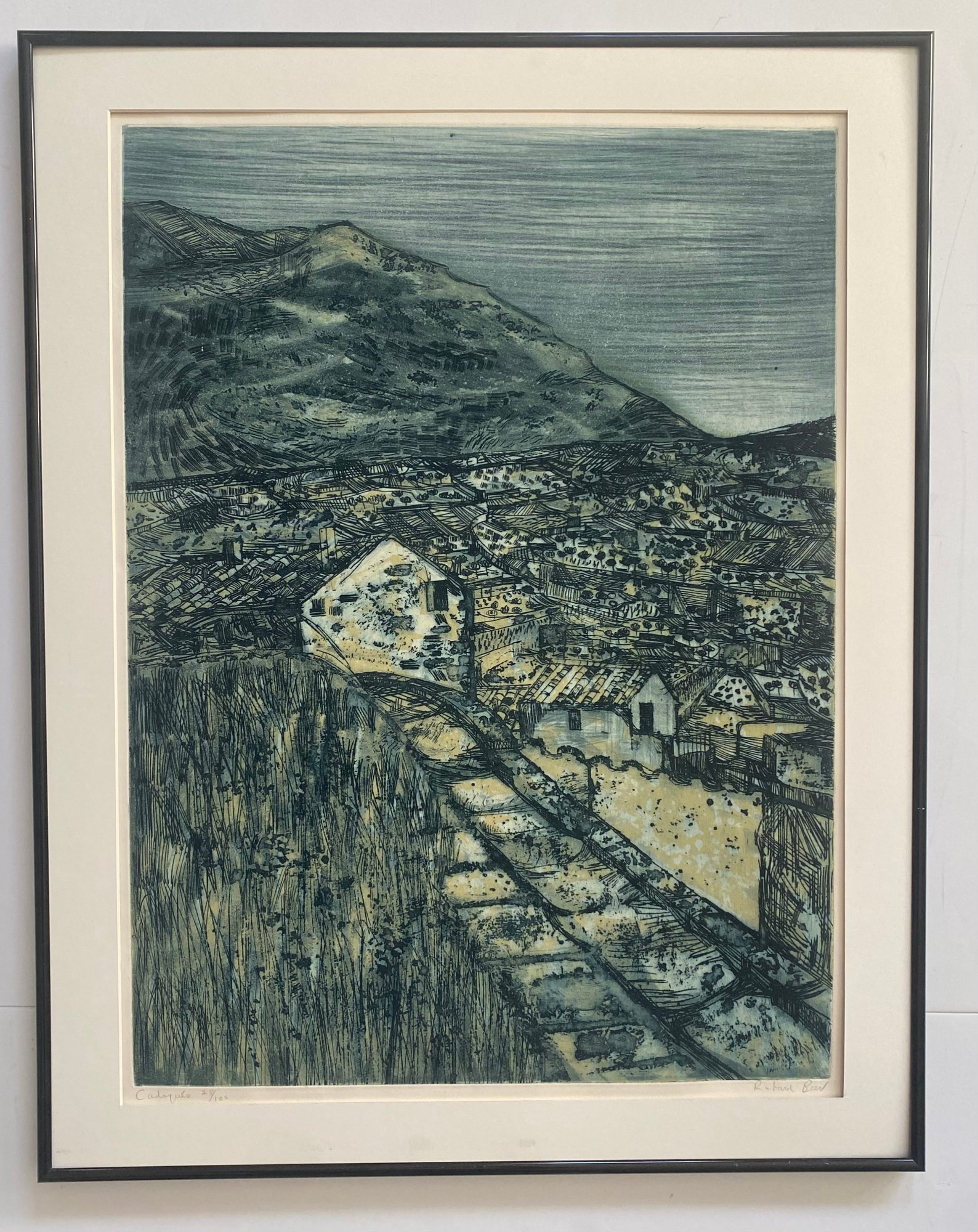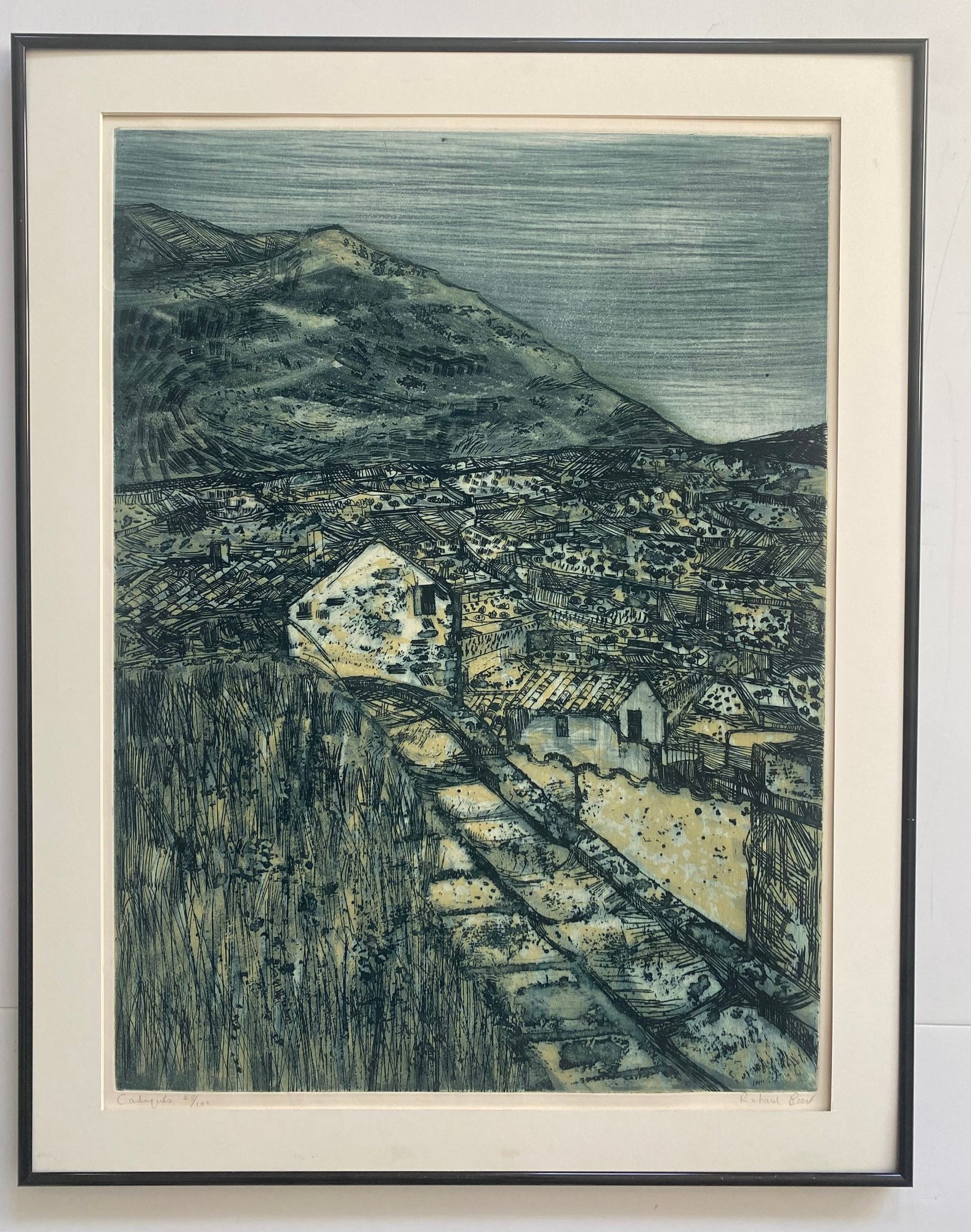 This image depicts a framed limited edition color etching and aquatint print titled "Cadaqués" by the British artist Richard Beer (1928-2017).