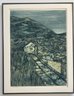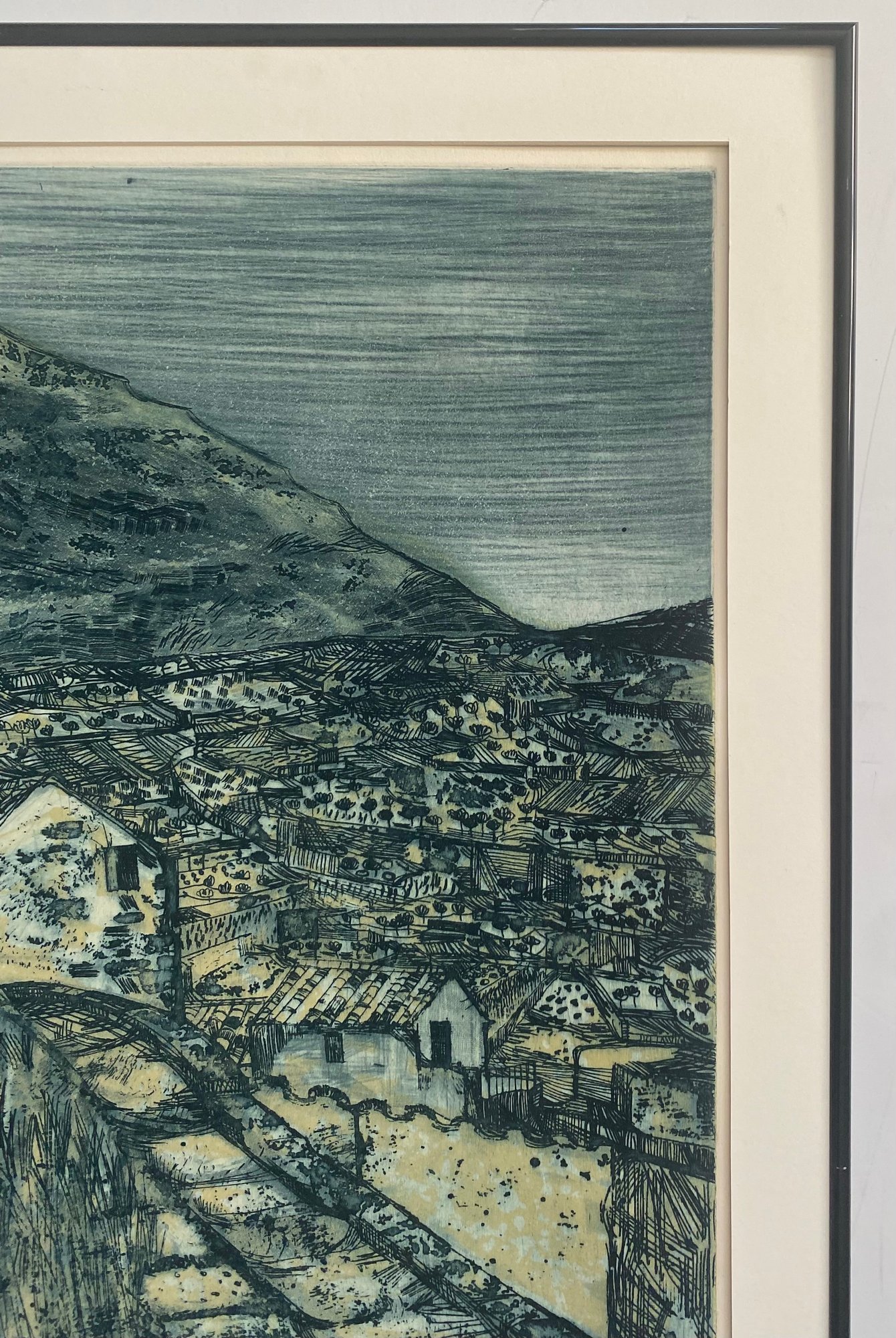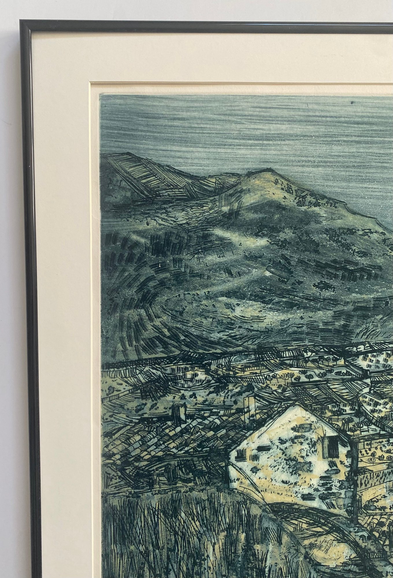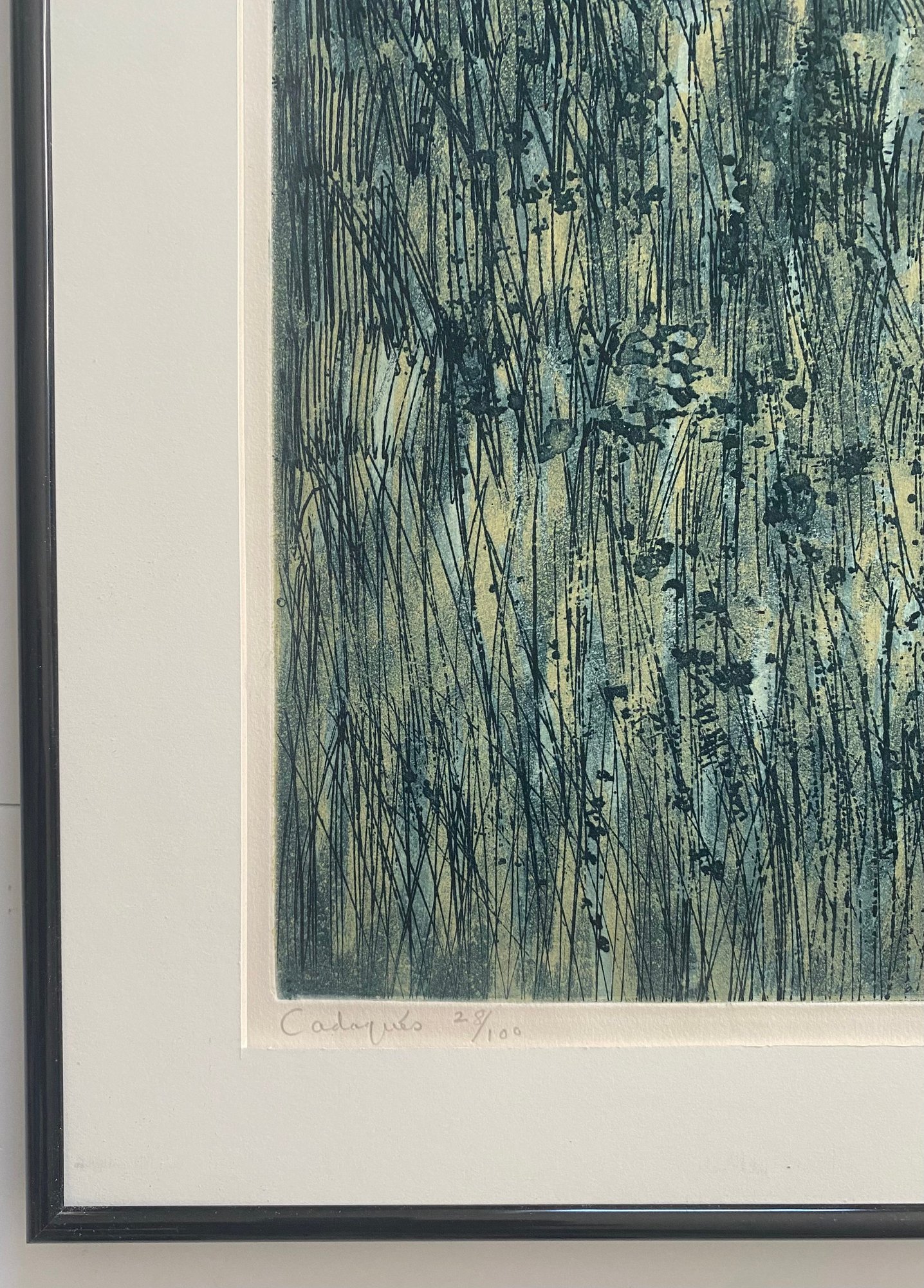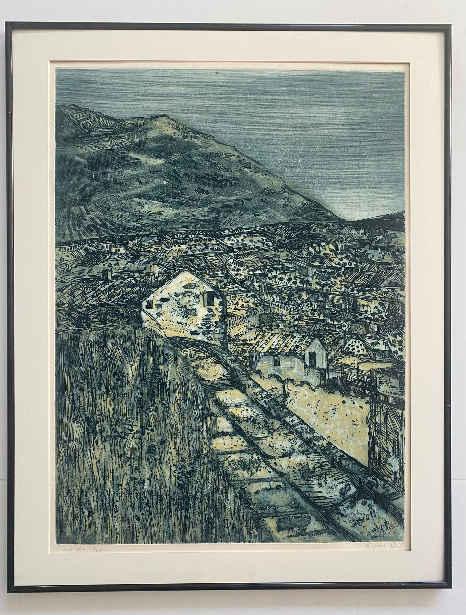 This image depicts a framed limited edition color etching and aquatint print titled "Cadaqués" by the British artist Richard Beer (1928-2017).