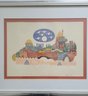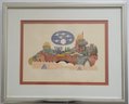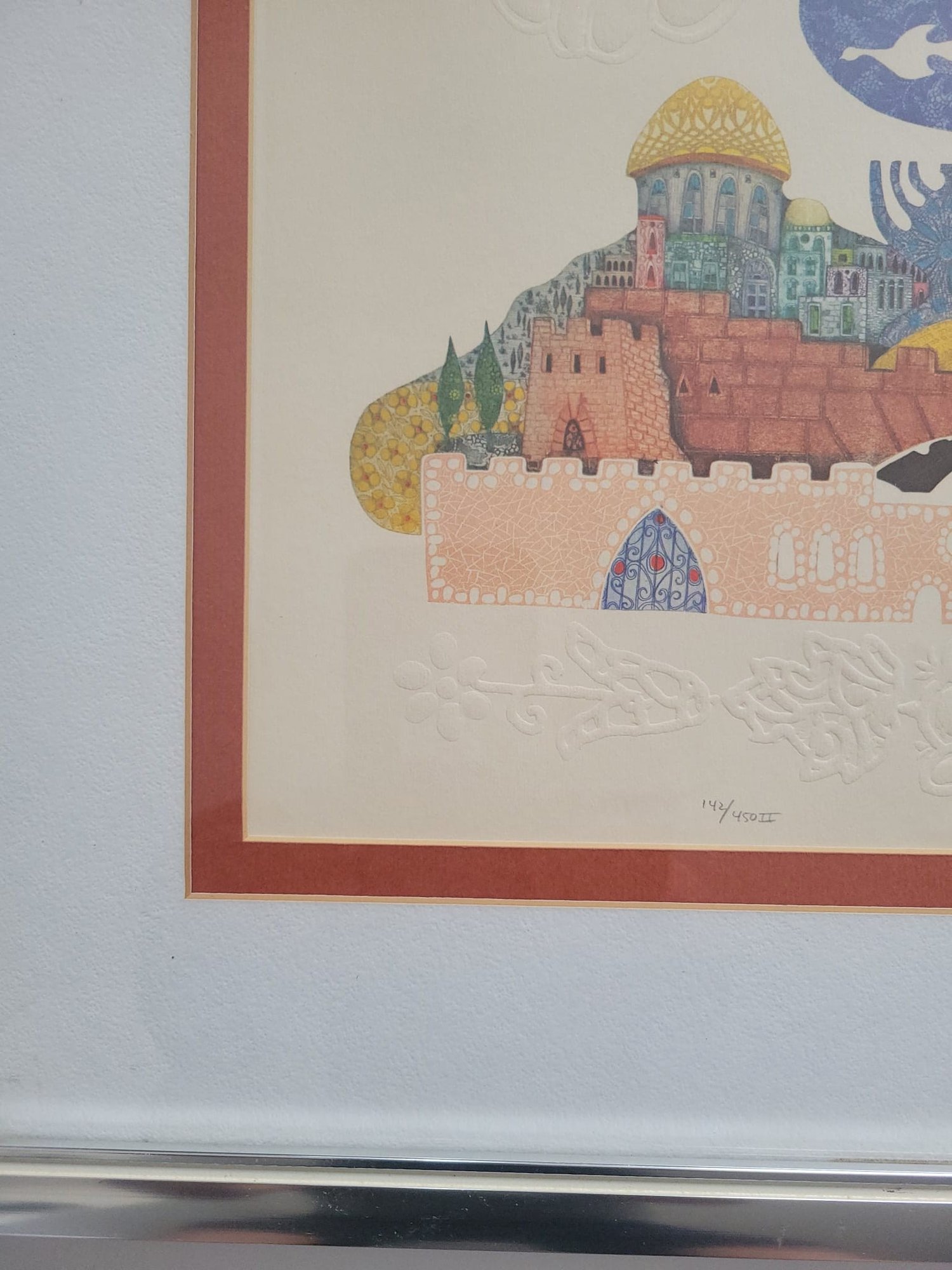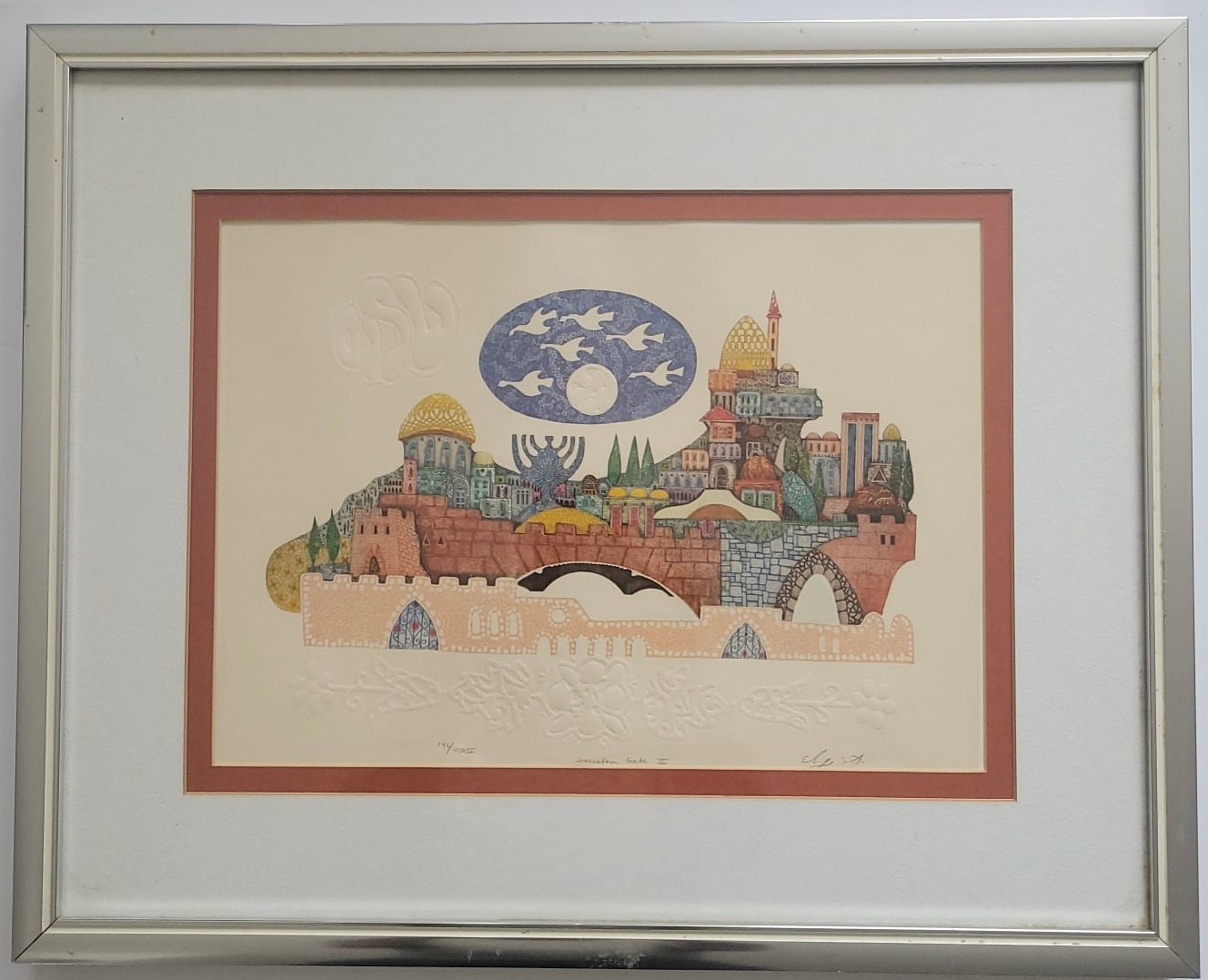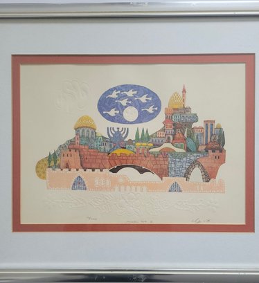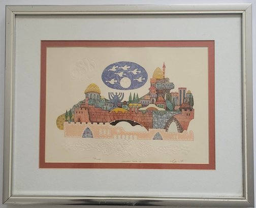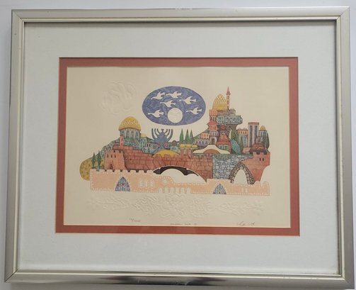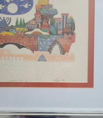 Limited Edition Print Titled "Jerusalem Gate II by Amram Ebgi. It features intricate details and bright, warm colors, depicting a stylized view of the city of Jerusalem. Amram Ebgi is a Moroccan-born Israeli artist master printer and craftsman known for his symbolic Judaic art.