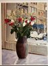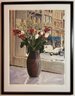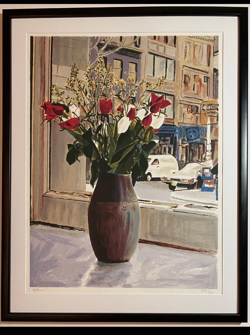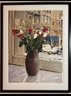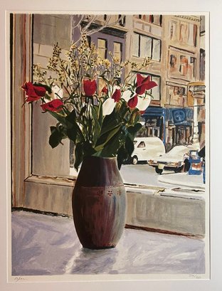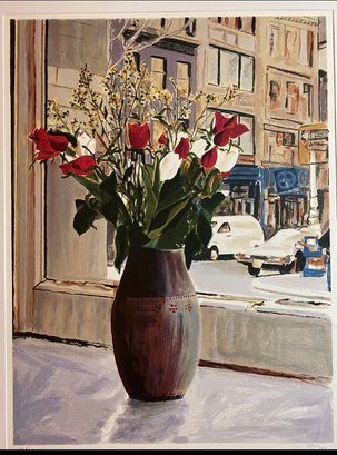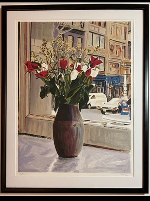 It depicts a vase of red and white flowers on a windowsill, with a blurred cityscape visible through the window in the background. The scene includes buildings and what appears to be a street with vehicles. The piece is a limited edition on paper, hand-signed and numbered by the artist.