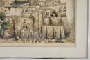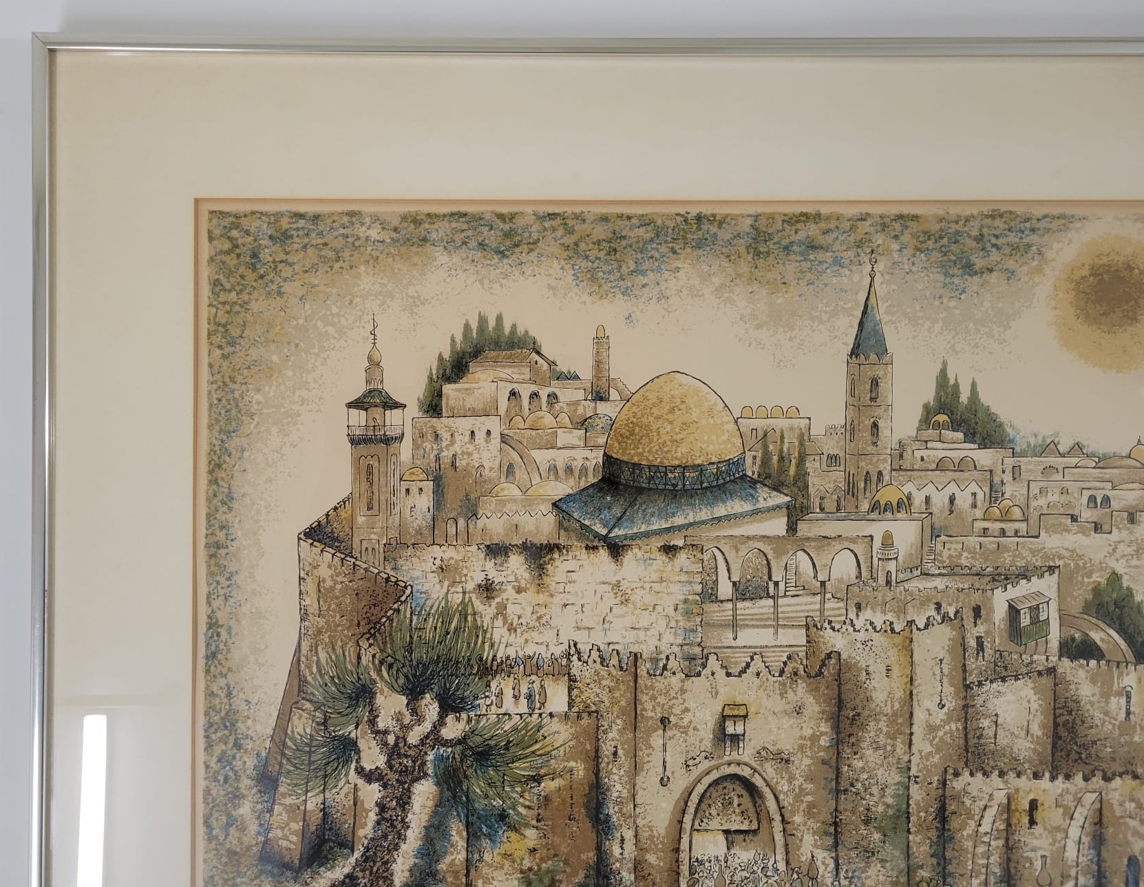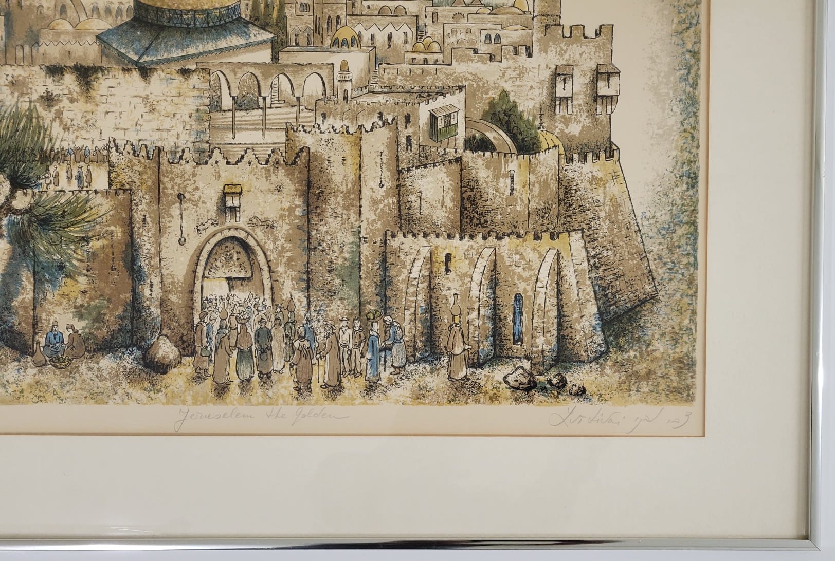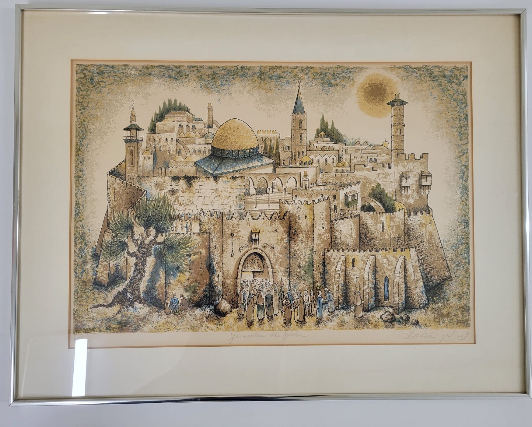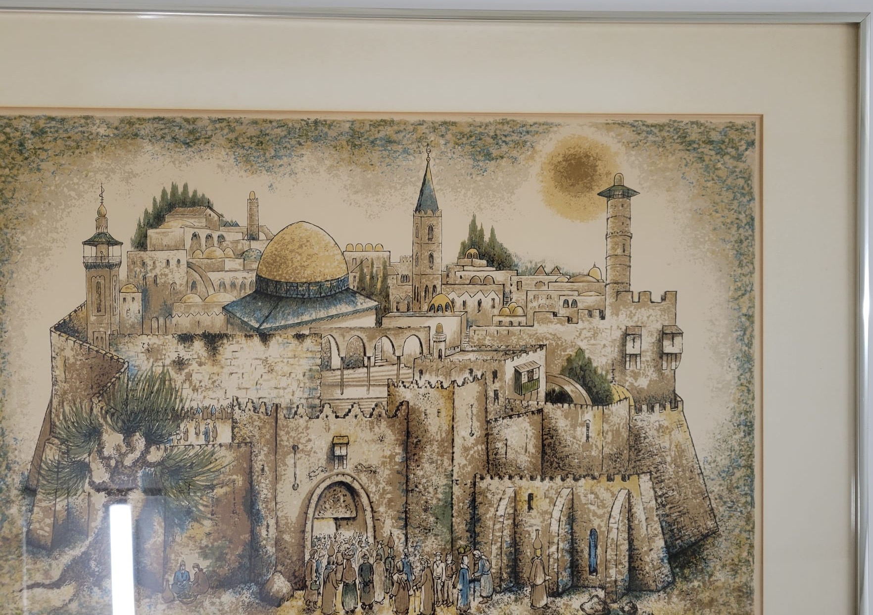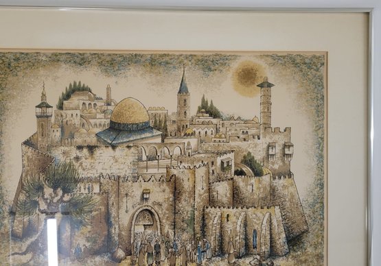 This artwork depicts a scenic view of historic city, likely inspired by Jerusalem, featuring a prominent dome, towers, and ancient architecture. The detailed foreground includes figures, adding a sence of scale and life to the scene. The color palette and style suggest a blend of realism and artistic interpretation.