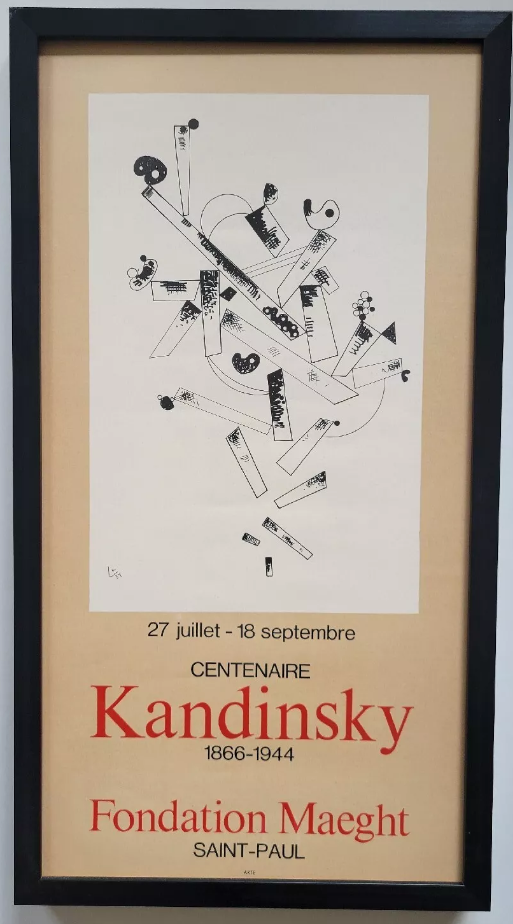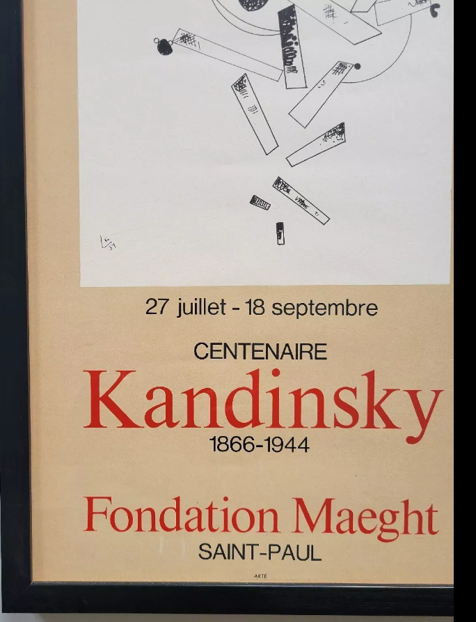 This lithographic art print by Kandinsky is a beautiful piece from the Galery Maeght in Paris. The print features a captivating theme of Paris and is sure to add a touch of artistry to any home or office. Its vibrant colors and intricate details bring the city to life in a unique way that is sure to capture the attention of any art enthusiast. Whether you're looking to add to your collection or simply looking for a stunning piece to display, this Kandinsky print is a must-have. Lithographic Art Print By KANDINSKY From Galery Maeght in Paris. Good condition. No mat, black wood frame. Frame size ( 13 × 24 )