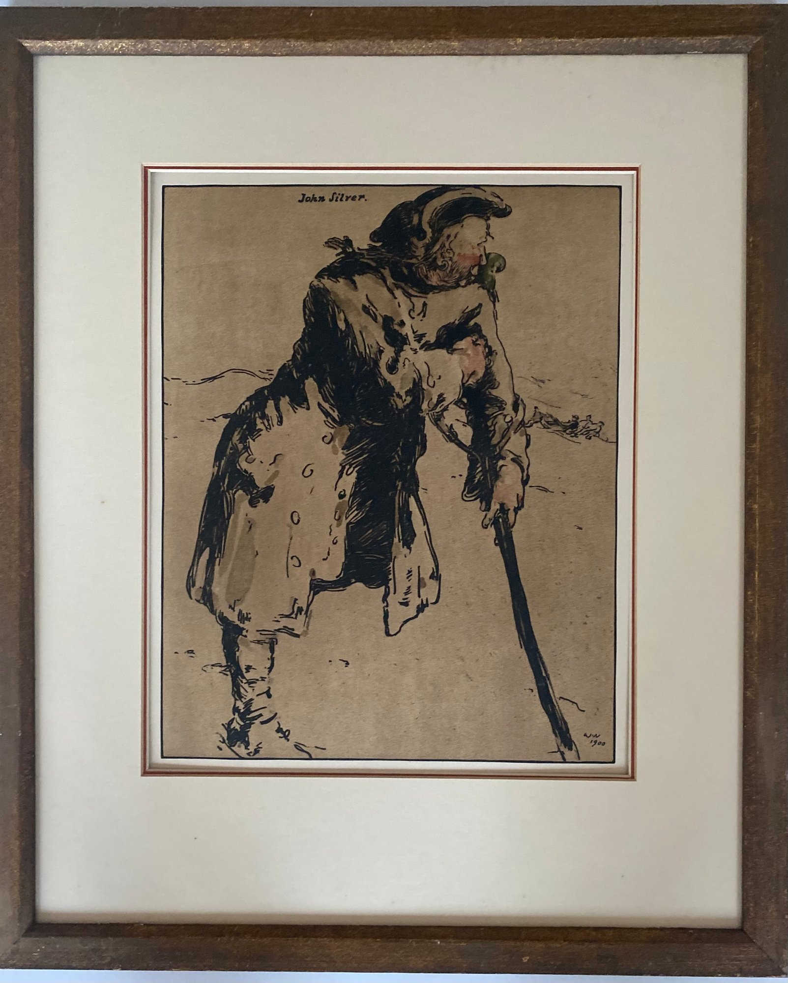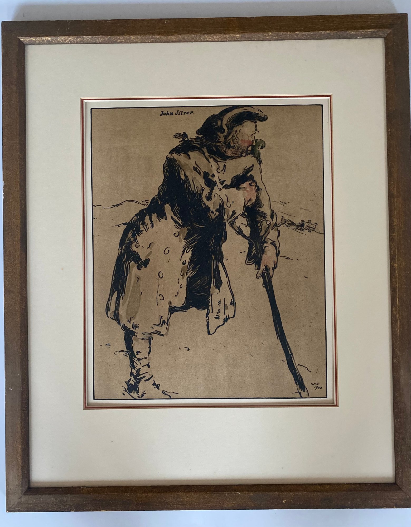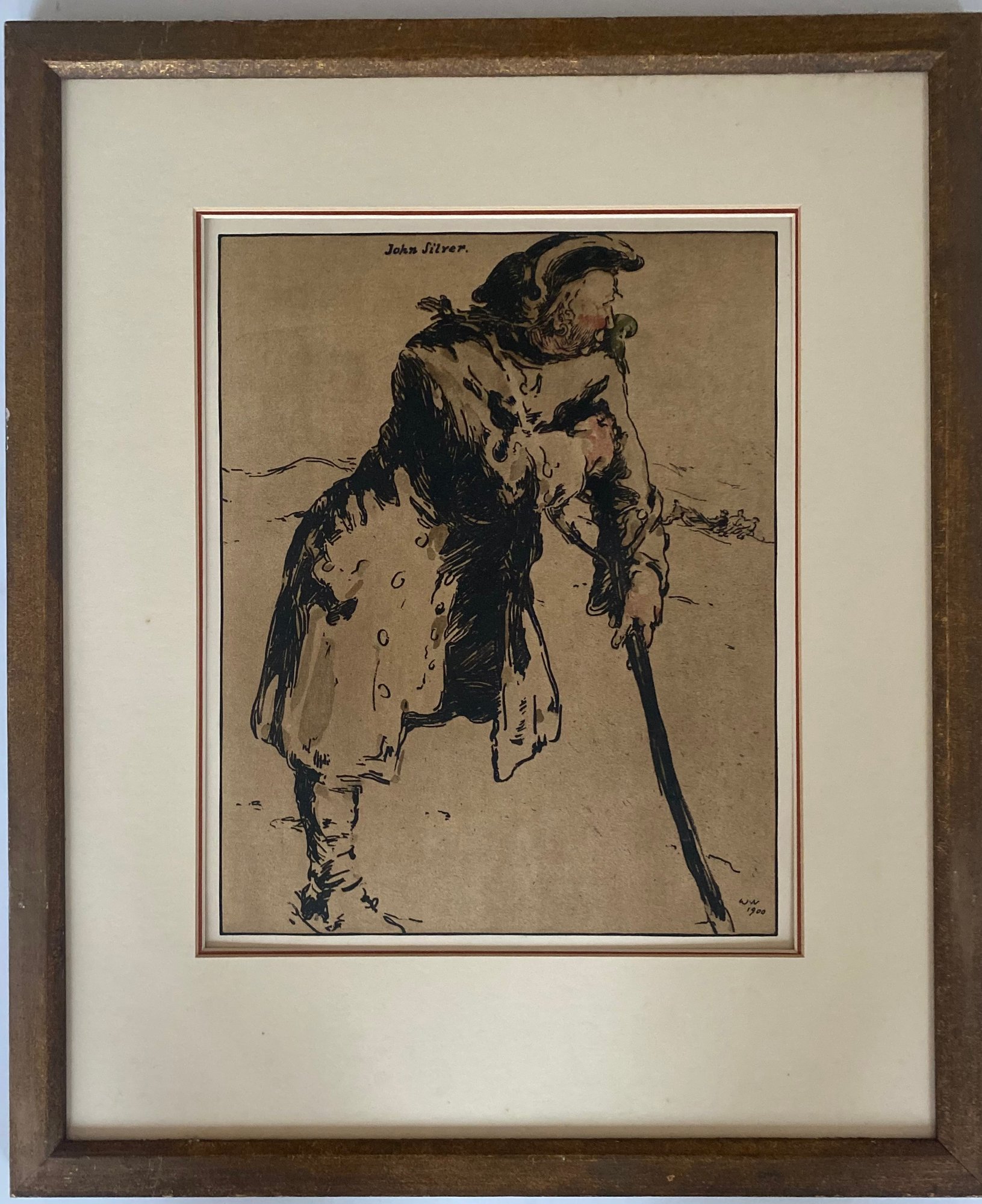 The image is an illustration of the fictional pirate John Silver. It was created by British artist William Nicholson in 1900. The work is a colour lithograph and is part of a series titled Characters of Romance.