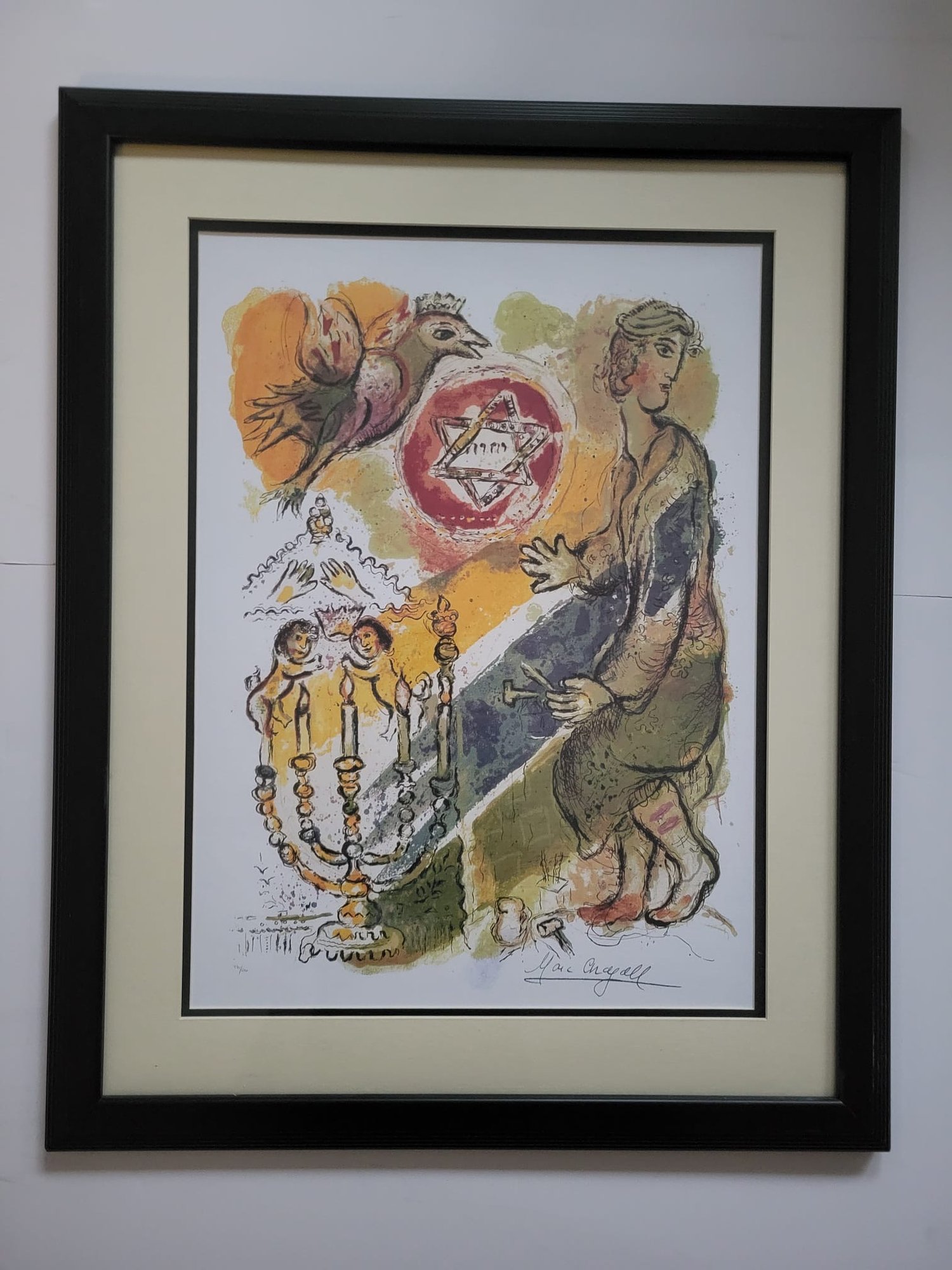Celebrate culture, spirituality, and artistic mastery with this enchanting composition. Featuring symbolic elements such as the Star of David, a menorah, and a contemplative figure, this vibrant piece resonates with themes of tradition and hope. The expressive strokes and bold colors evoke a sense of wonder and connection to heritage. Framed in a sleek black border and signed by the artist, this work is an exquisite centerpiece for any collection, perfect for those who appreciate meaningful art with a touch of mysticism.