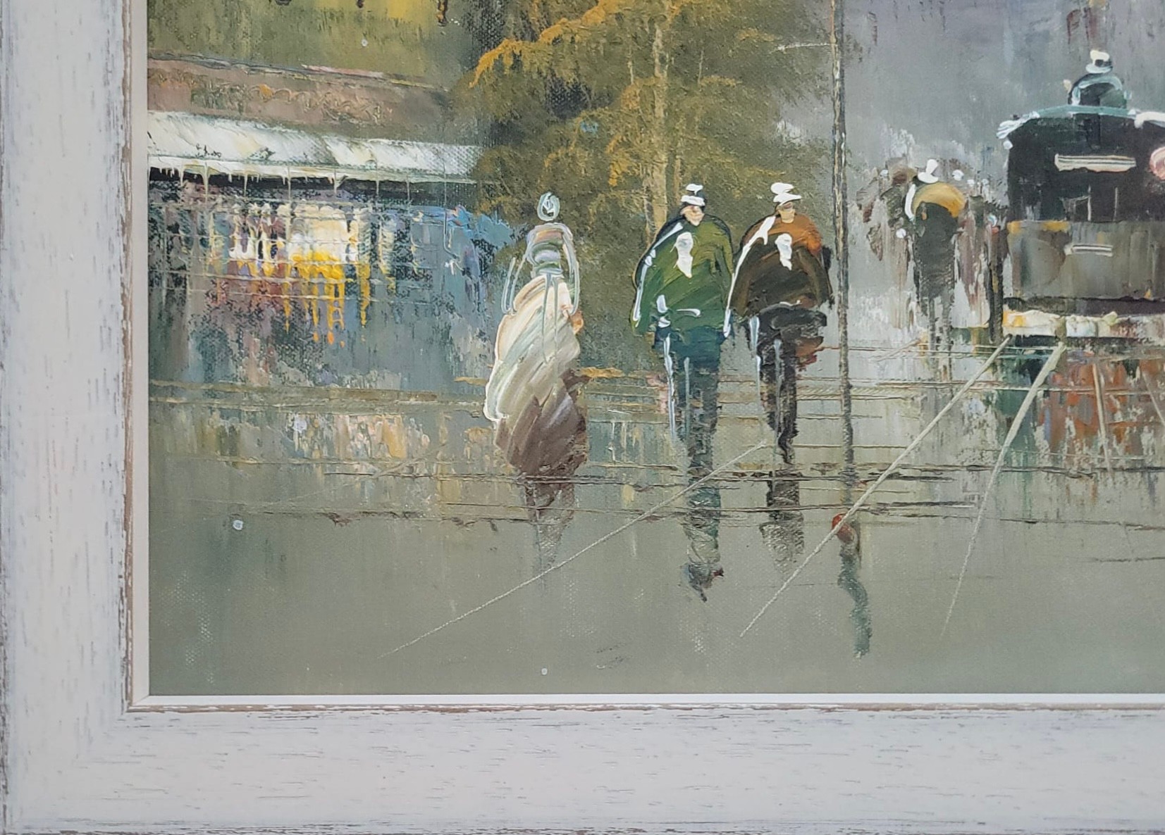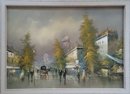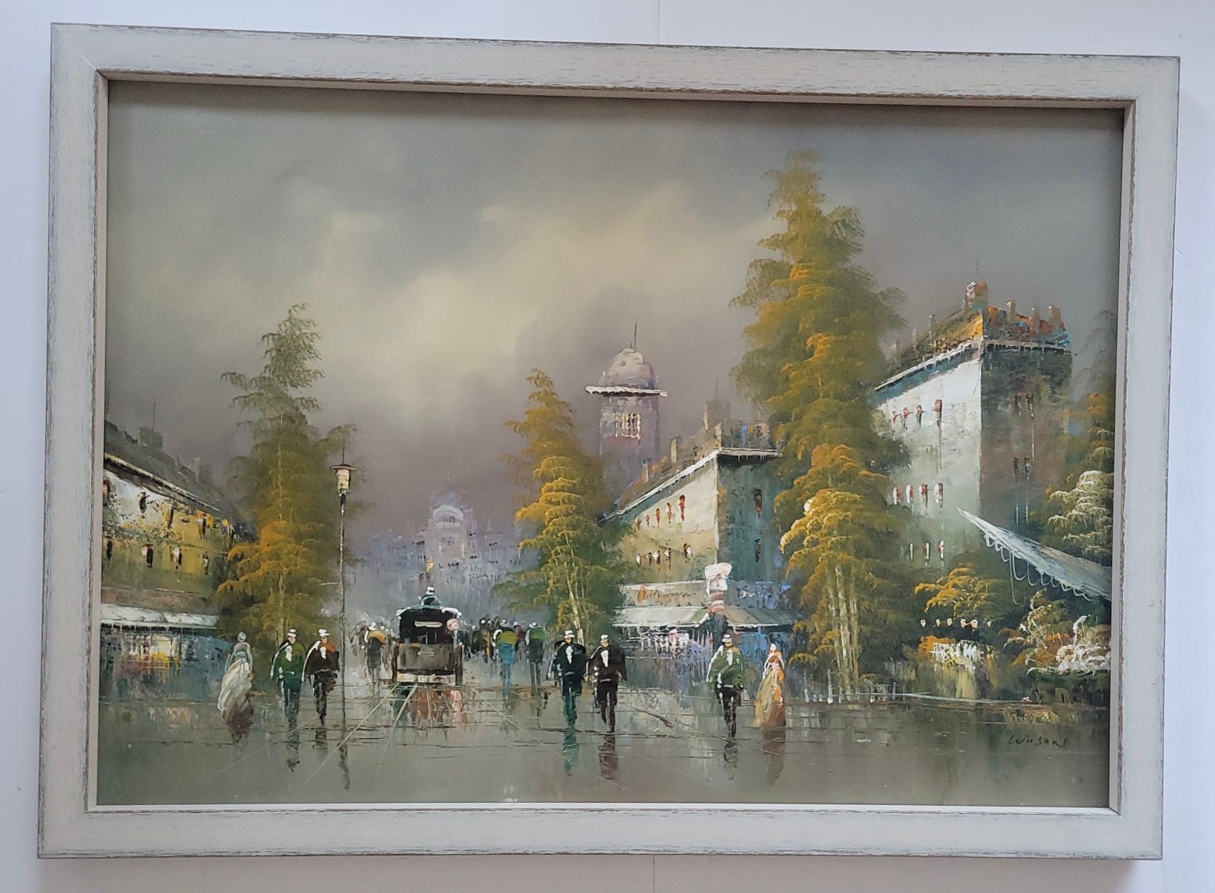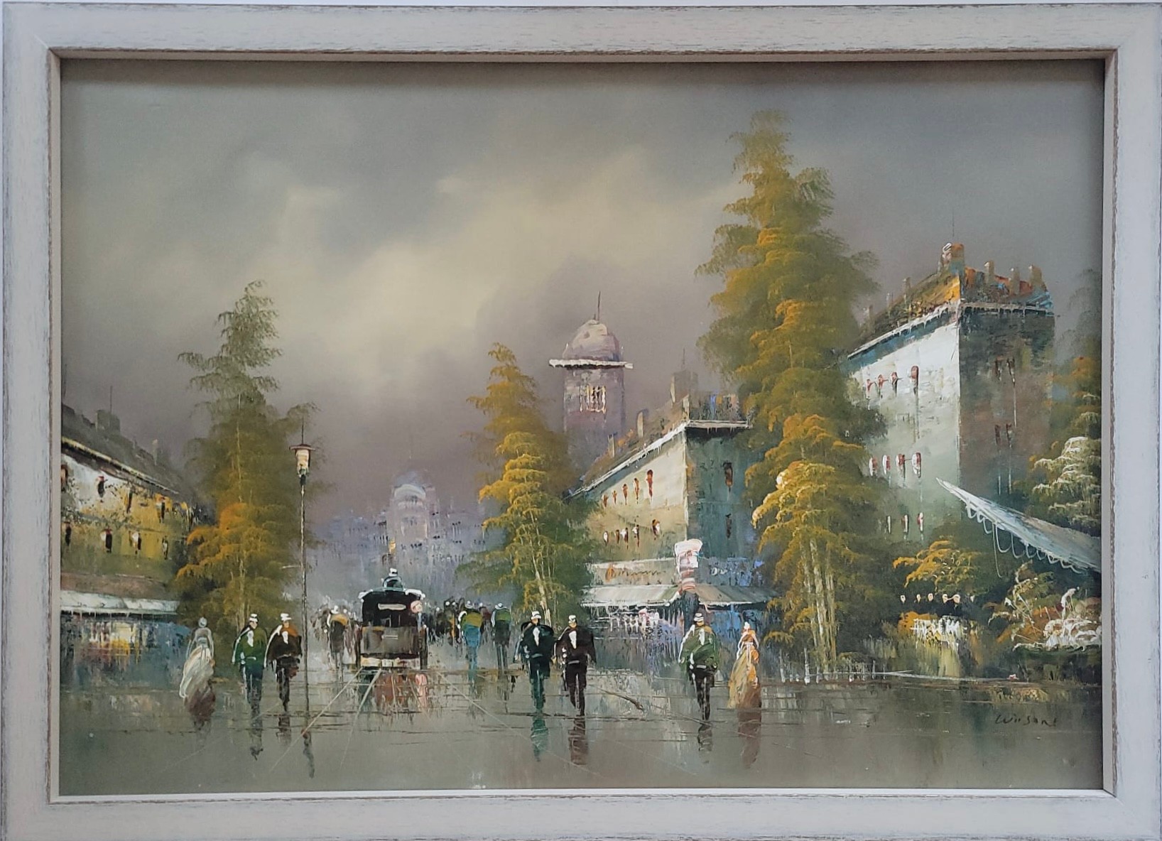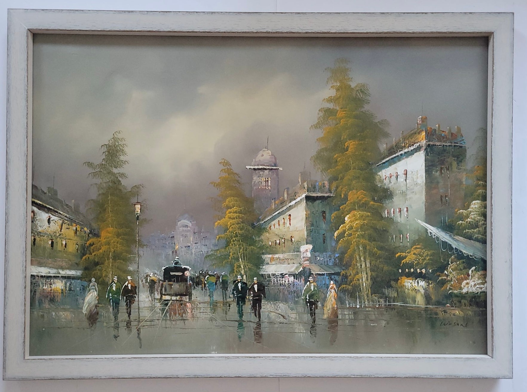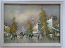 Impressionist oil painting on canvas depicting a rainy Parisian street scene, signed.