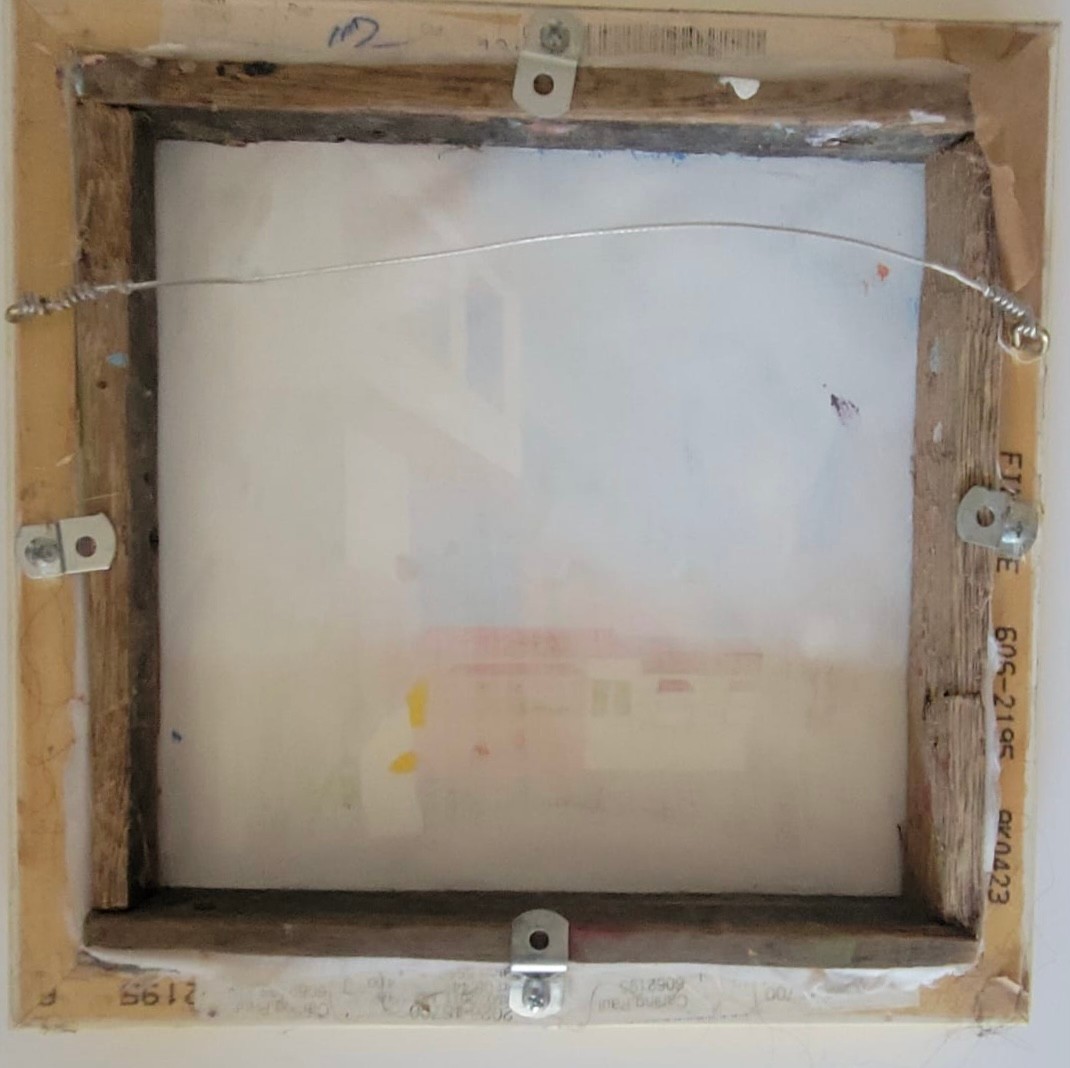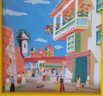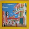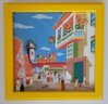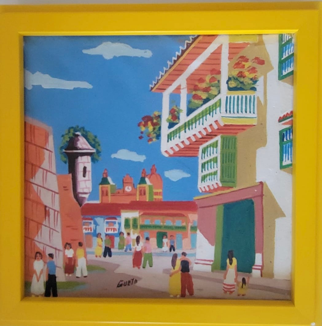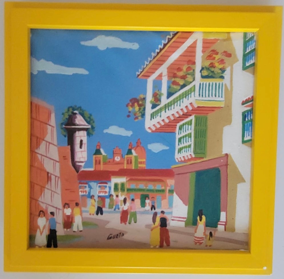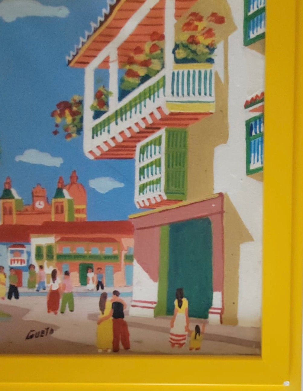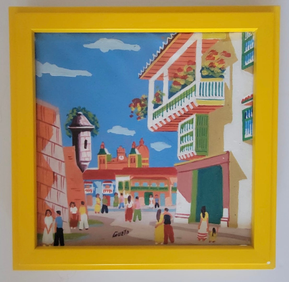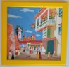 It depicts a lively scene in a Mexican village, characterized by colorful colonial-style buildings and cobblestone streets. Features: Bright Yellow Frame . Art size (8x8). Frame Size (9 3/4 x 9 3/4)