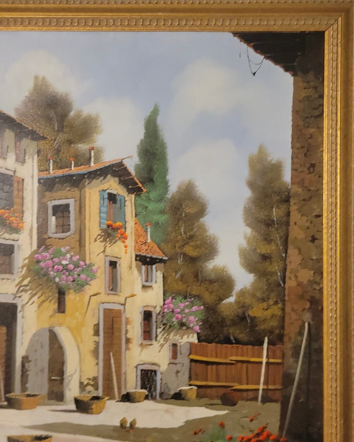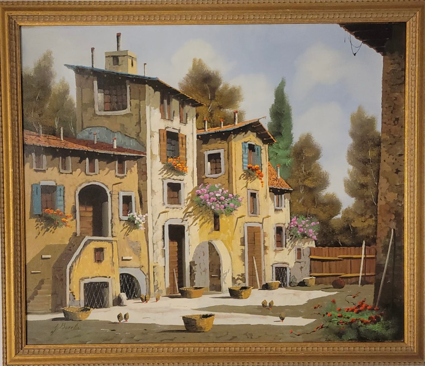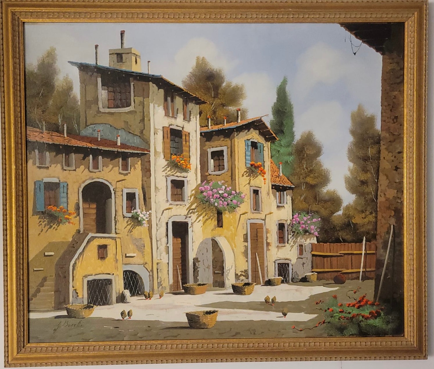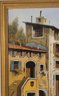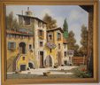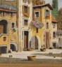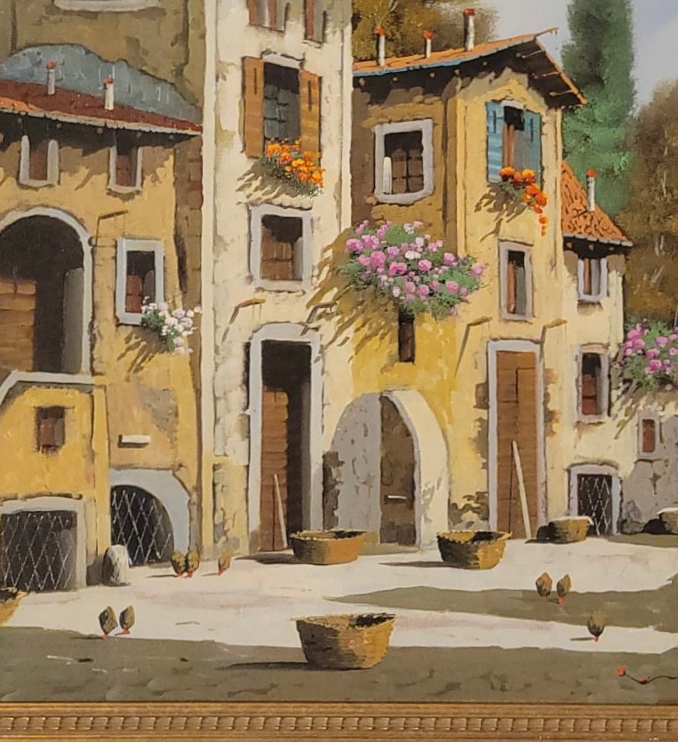 Oil on Canvas of Italian Village by Italian artist Guido Borelli. Guido Borelli (born 1952), known for painting picturesque Italian village scenes. A rustic courtyard in an old Italian village featuring stone houses, red-tile roofs, and potted flowers.