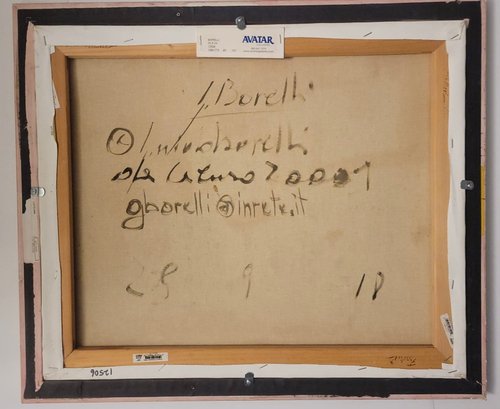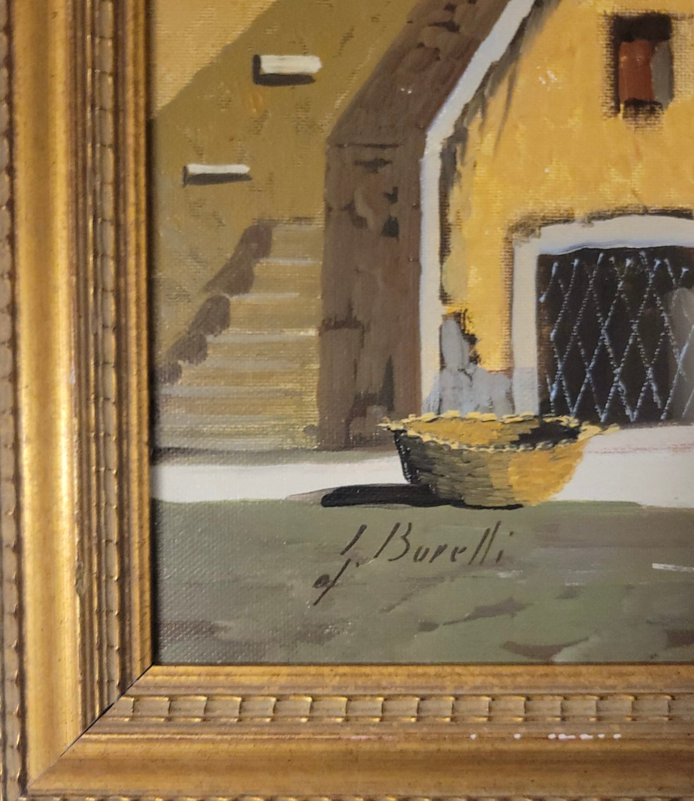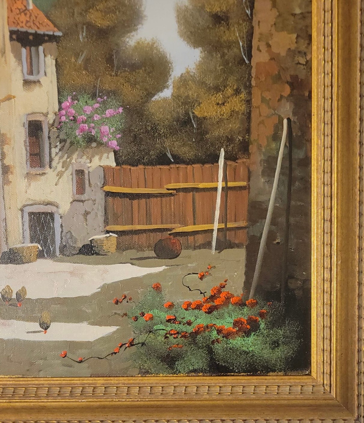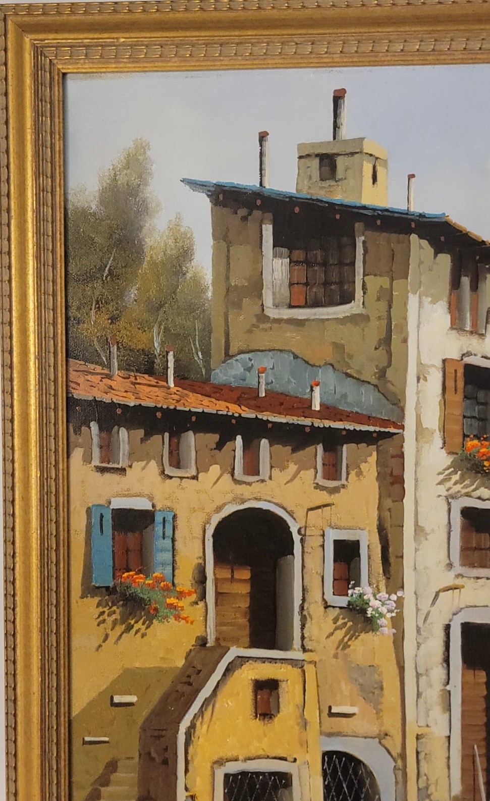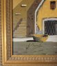 Oil on Canvas of Italian Village by Italian artist Guido Borelli. Guido Borelli (born 1952), known for painting picturesque Italian village scenes. A rustic courtyard in an old Italian village featuring stone houses, red-tile roofs, and potted flowers.