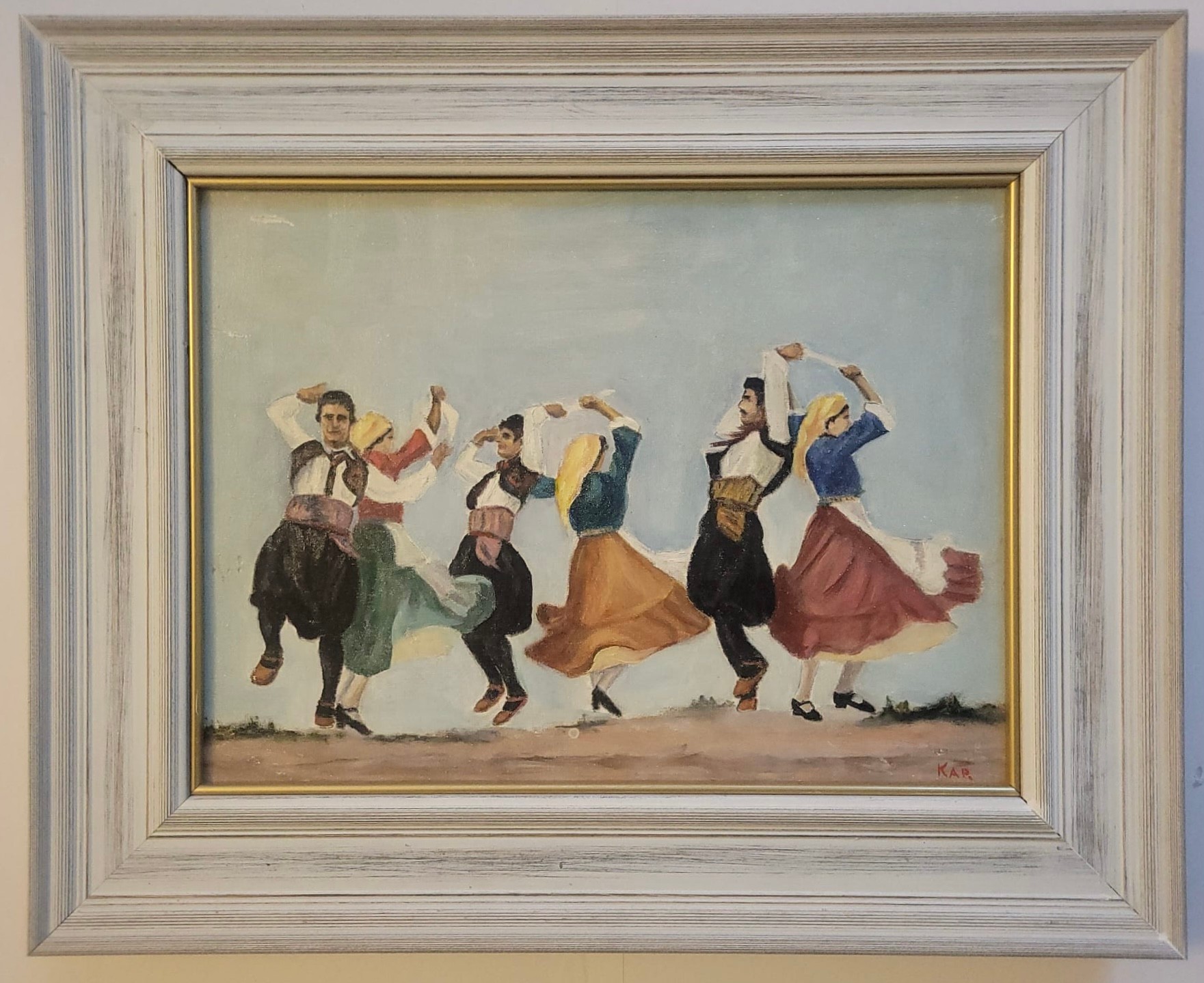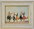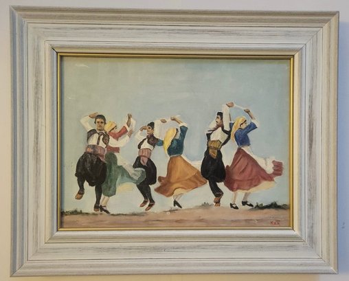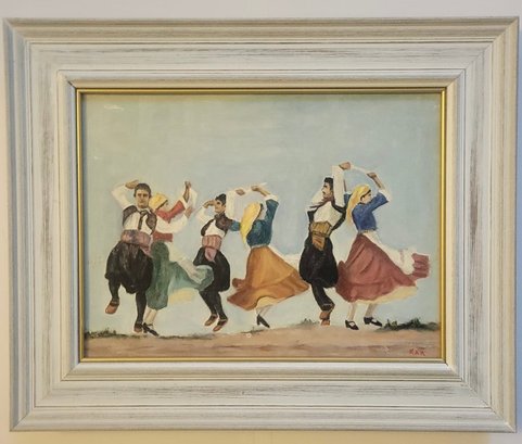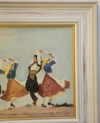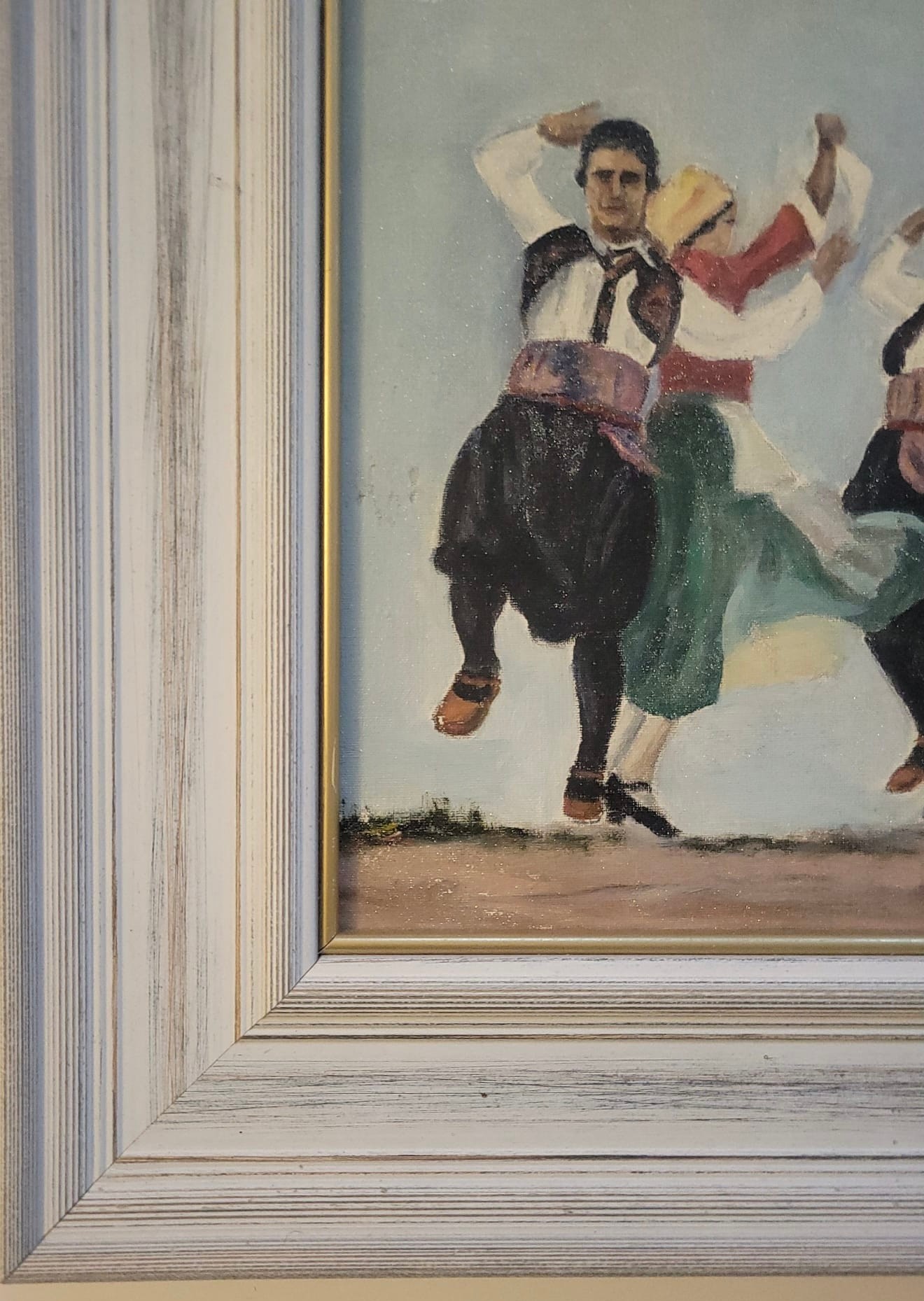 This oil painting on canvas is an original work depicting a group of people performing a traditional folk dance. The painting captures a vibrant, dynamic moment of traditional group dance with all figures actively moving.