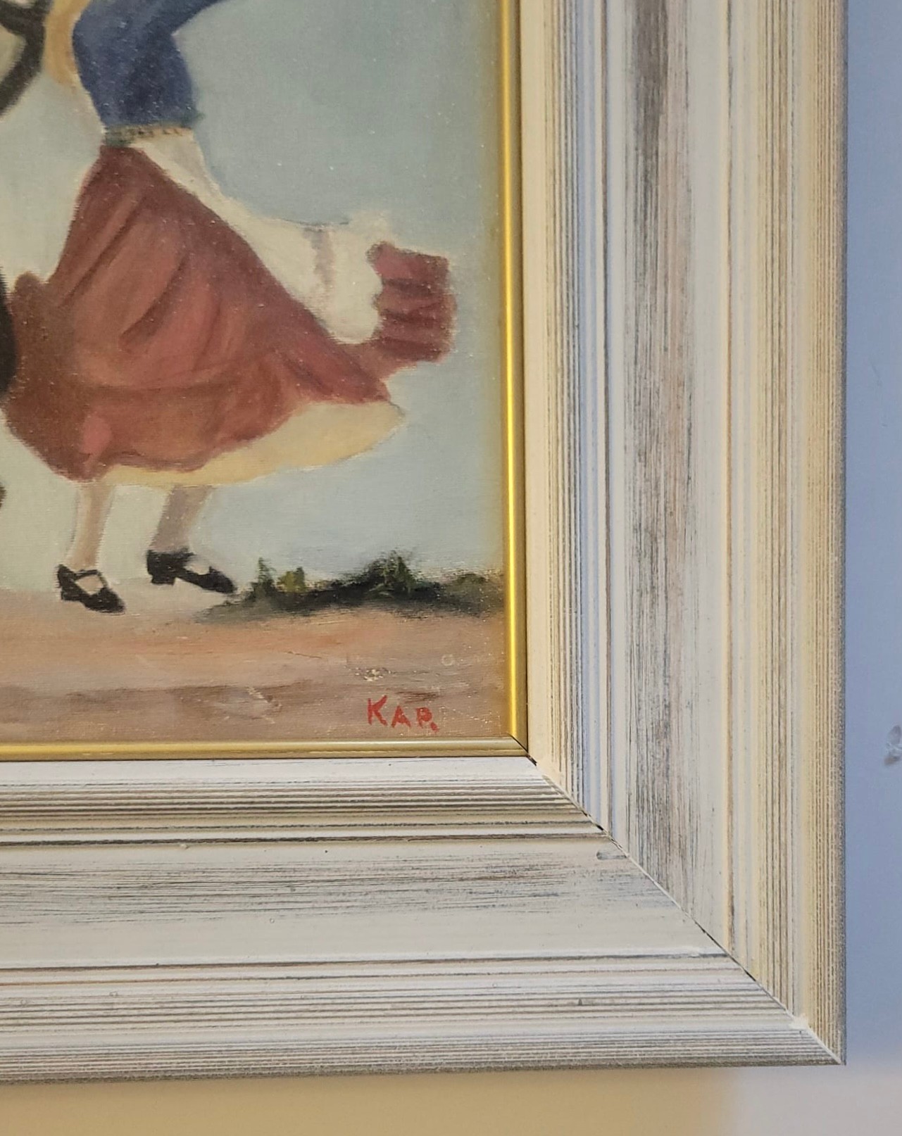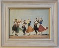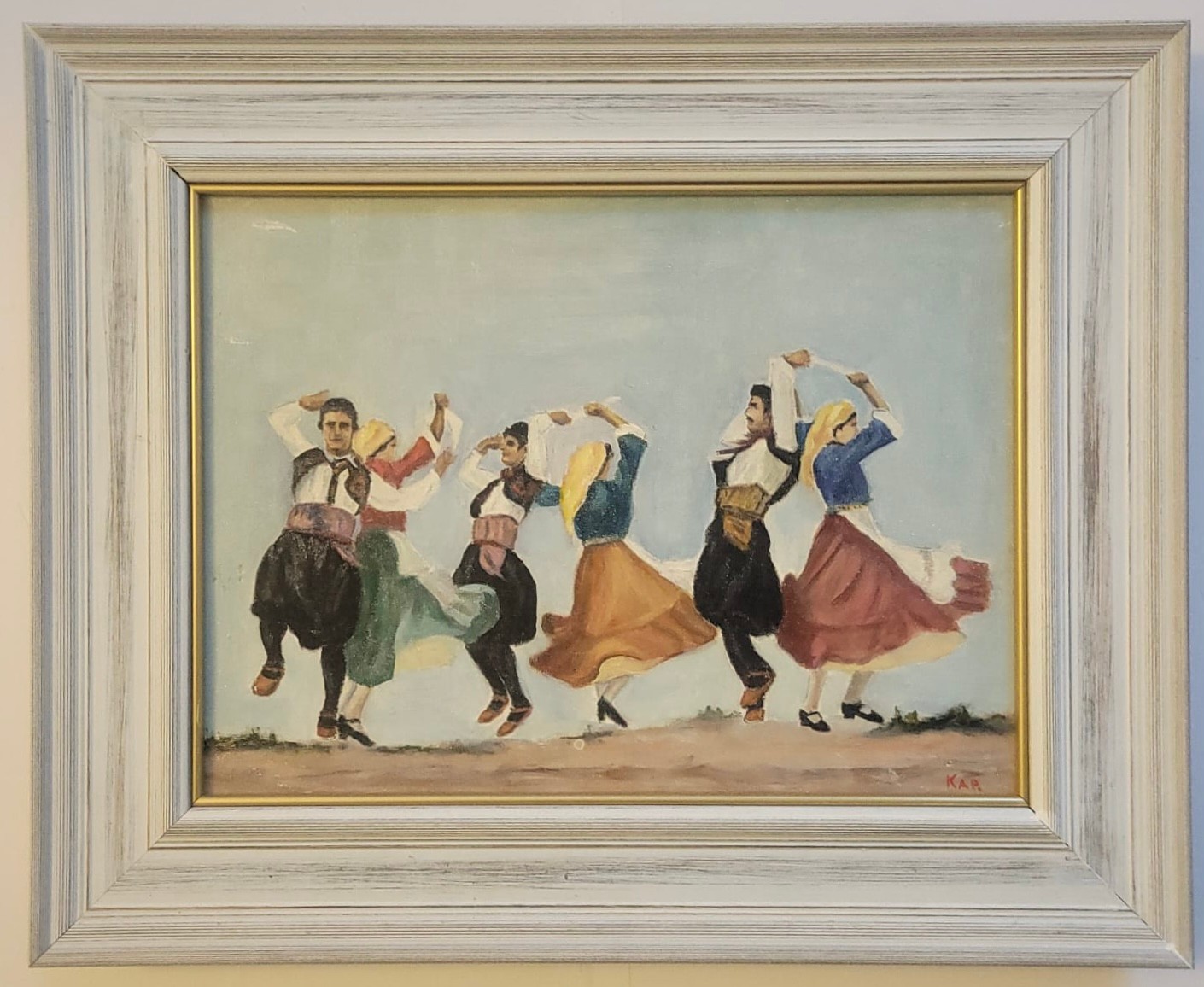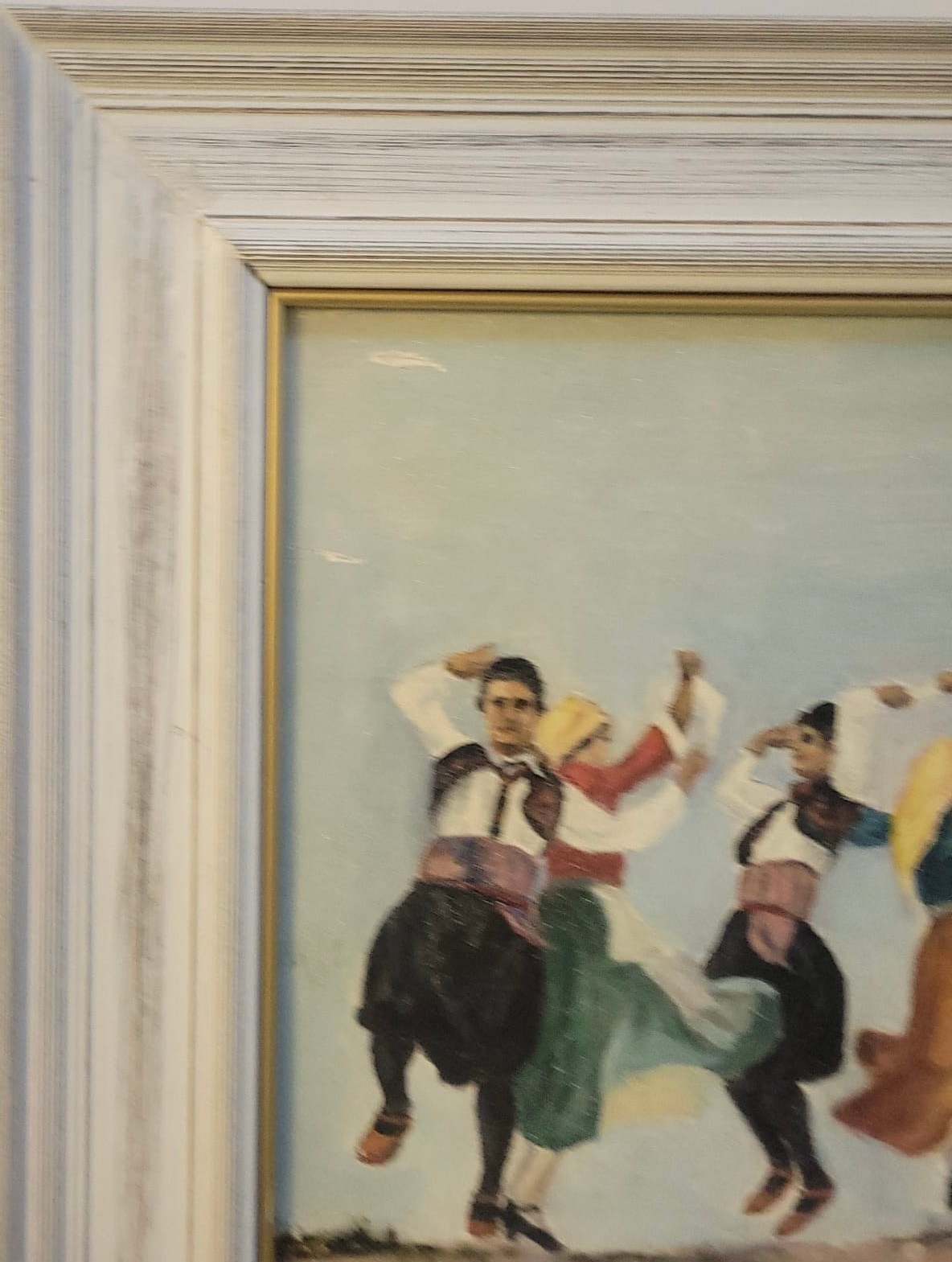 This oil painting on canvas is an original work depicting a group of people performing a traditional folk dance. The painting captures a vibrant, dynamic moment of traditional group dance with all figures actively moving.