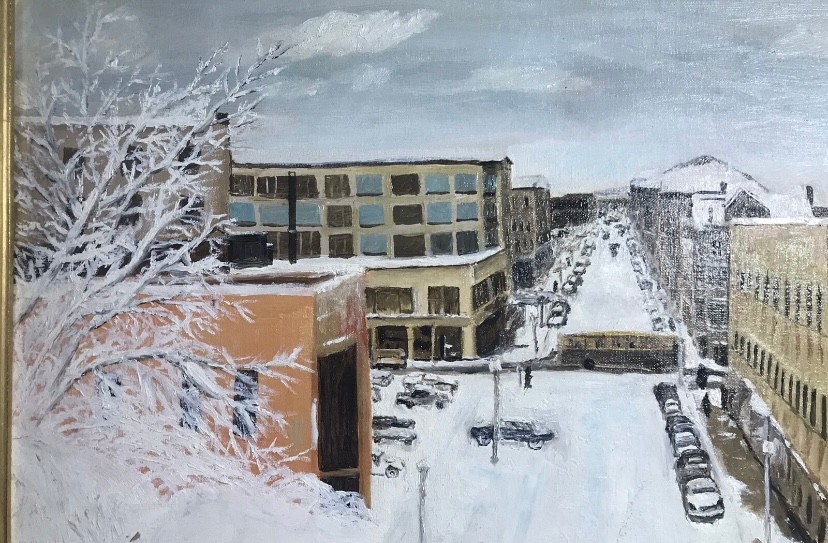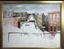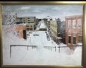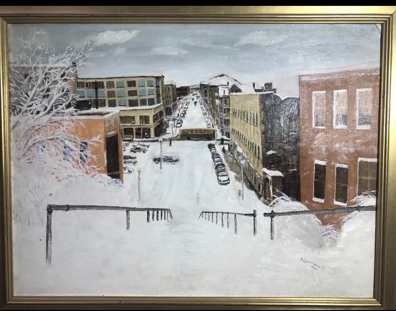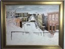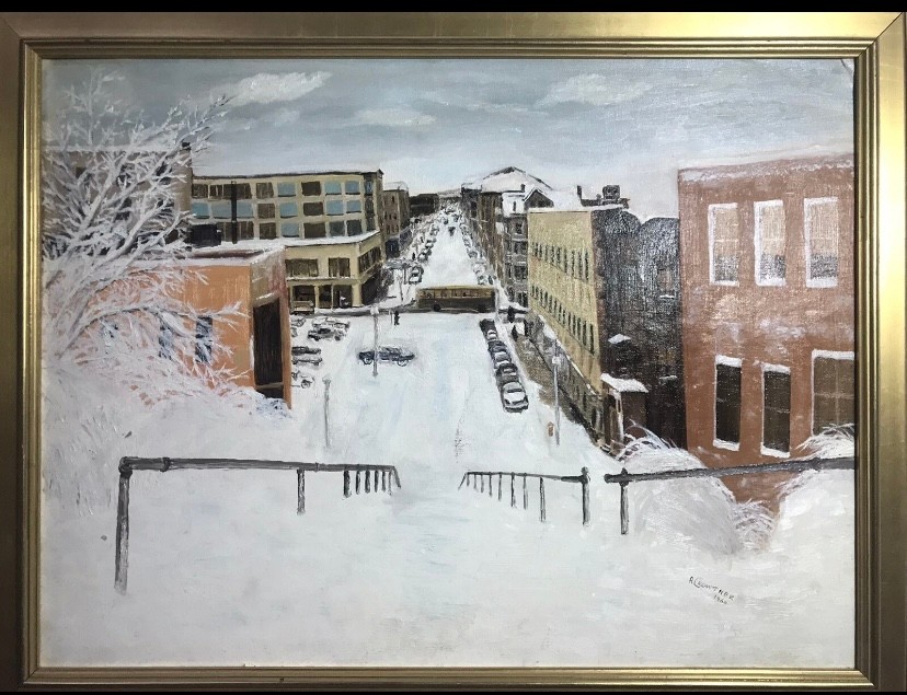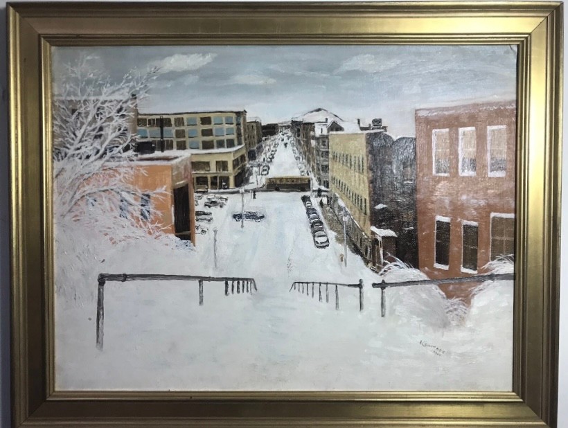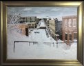 It depicts a snow-covered street scene with buildings and cars. The artist, R. Crowther, is known for winter landscape paintings.