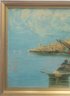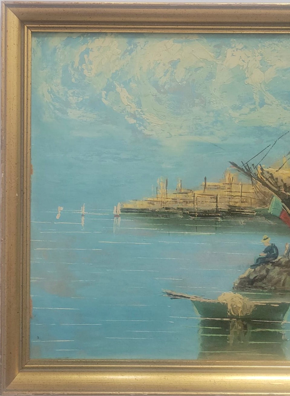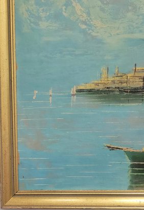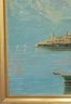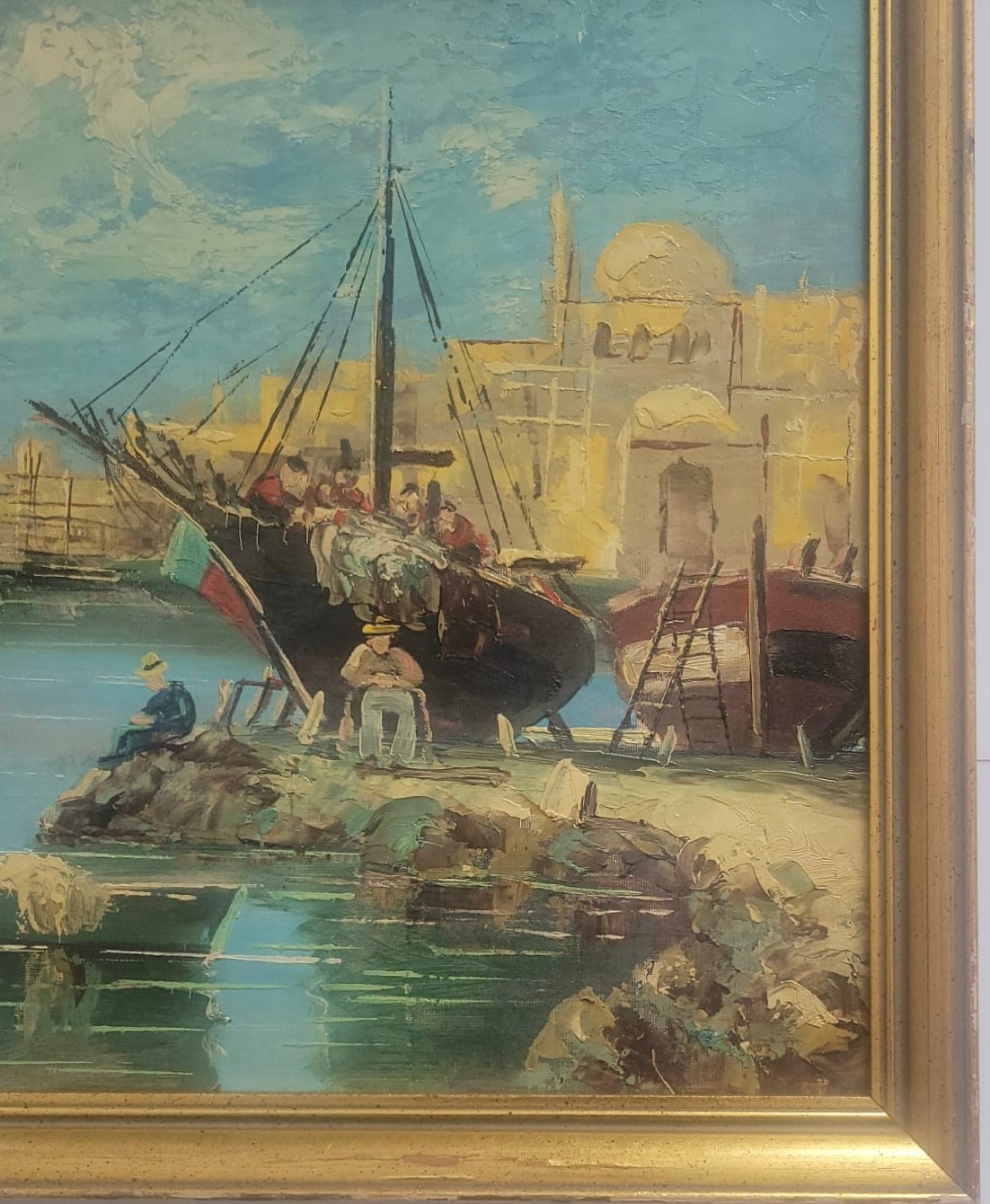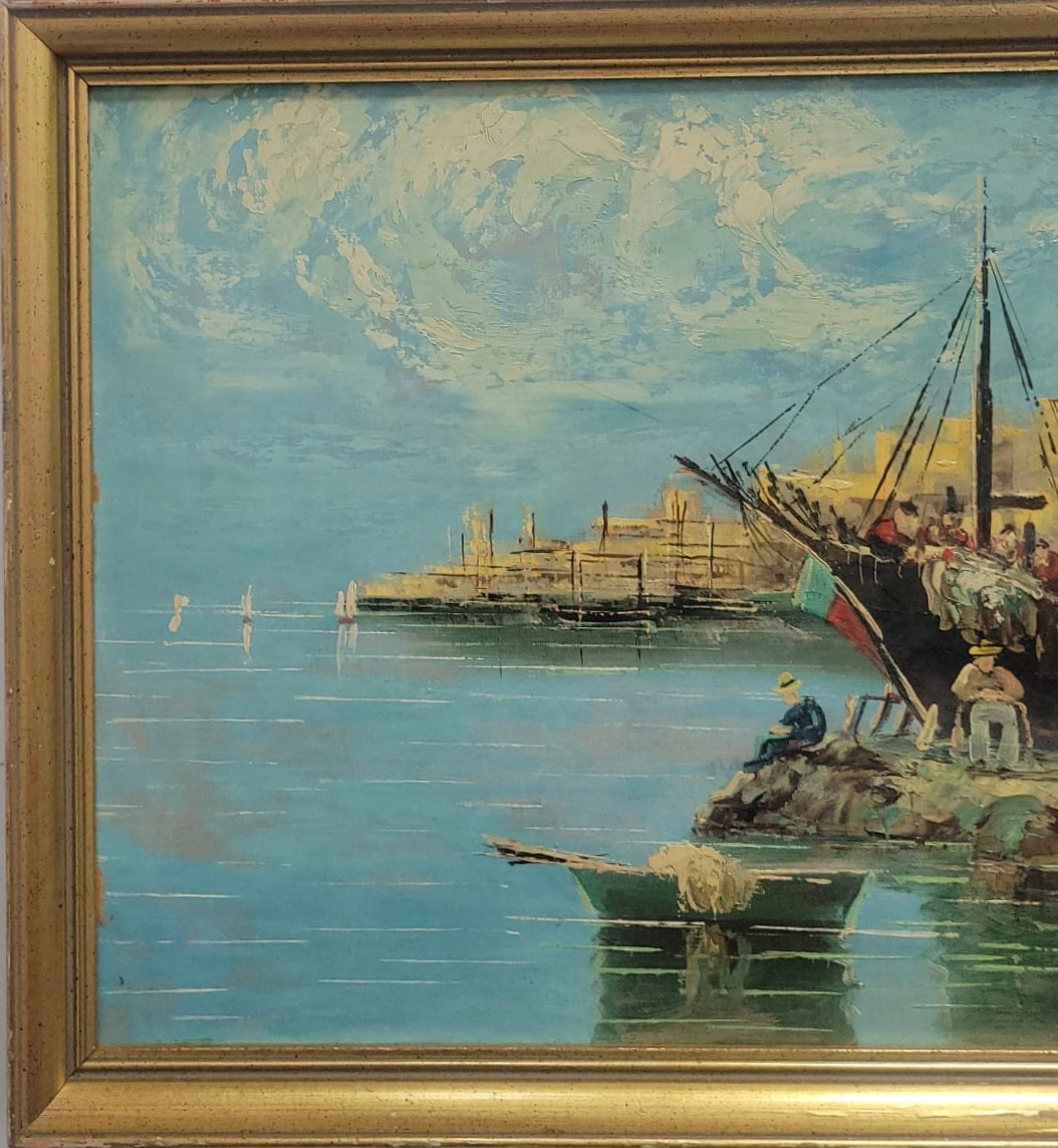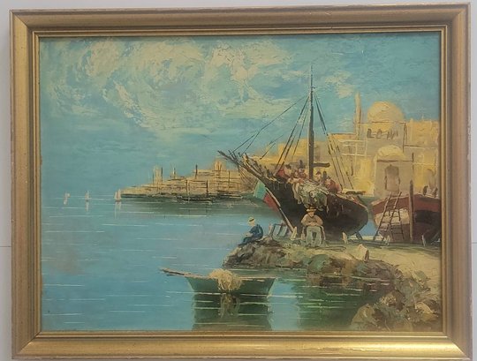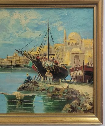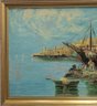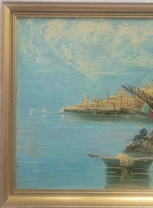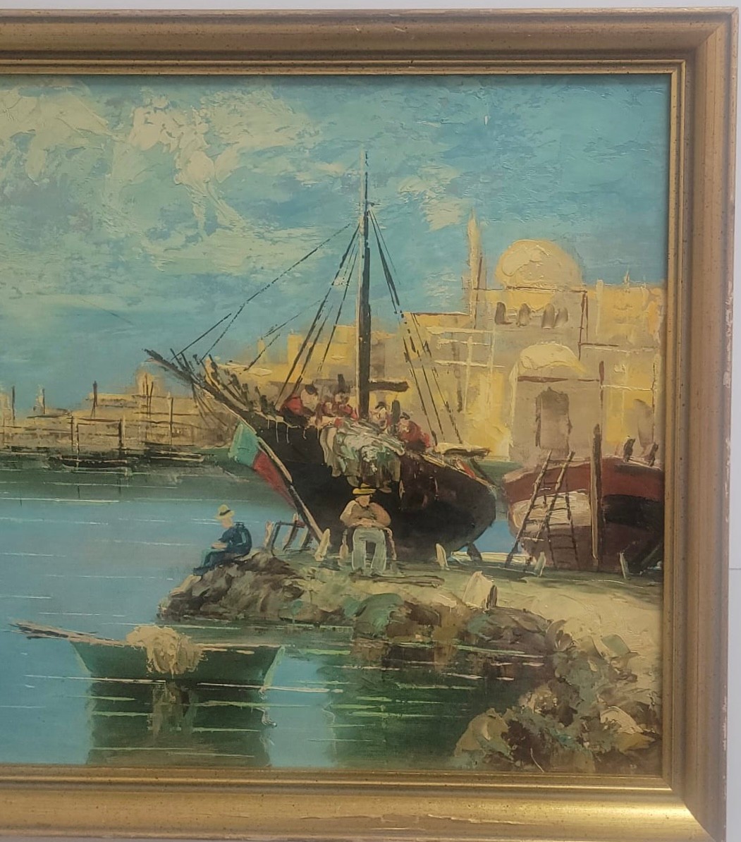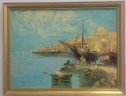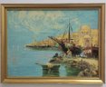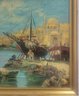 Oil painting depicting a harbor scene with boats and Mediterranean style architecture.