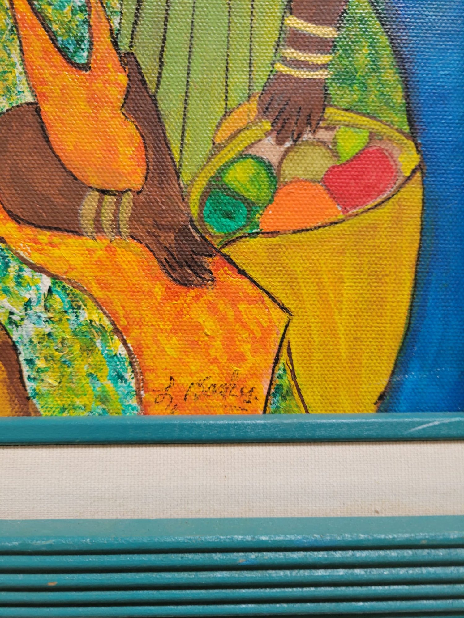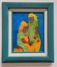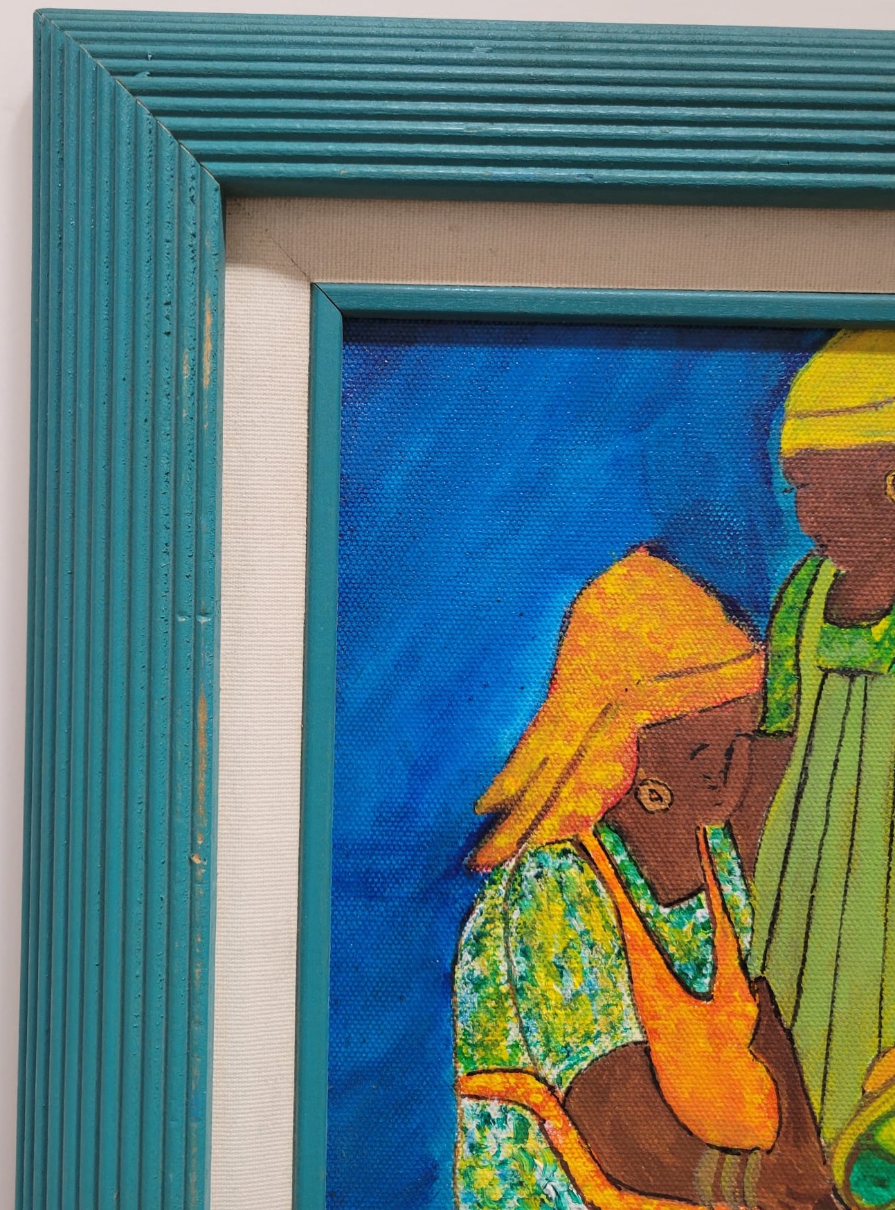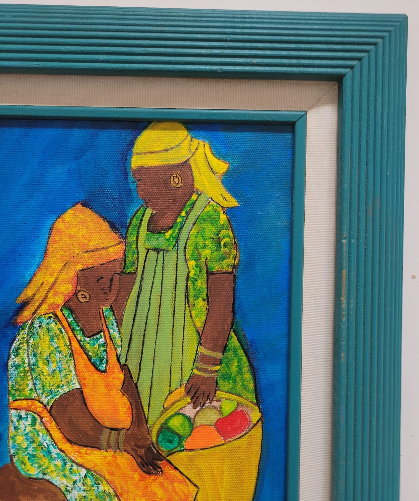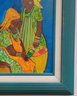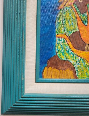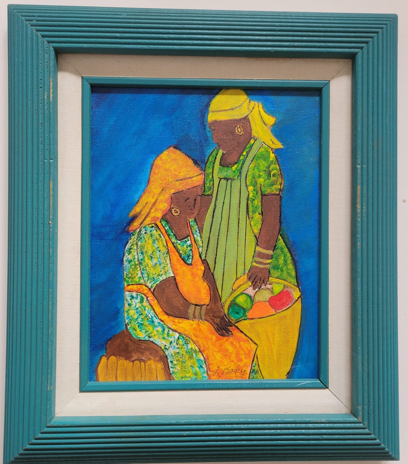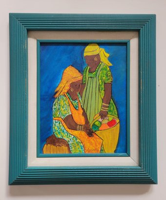 Vibrant and evocative, this painting beautifully captures a moment between two women engaged in daily life, set against a striking cobalt blue background. The artist’s use of rich, warm tones and intricate patterns on their garments draws attention to the culture and resilience of community bonds. The textured strokes and luminous colors give the piece a dynamic, almost tactile quality, while the teal frame complements and enhances its lively palette. Perfect for art lovers seeking a piece that celebrates tradition, connection, and the beauty of everyday moments. Lined with Green Frame. Art Size 8X10. Frame Size 13X15