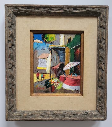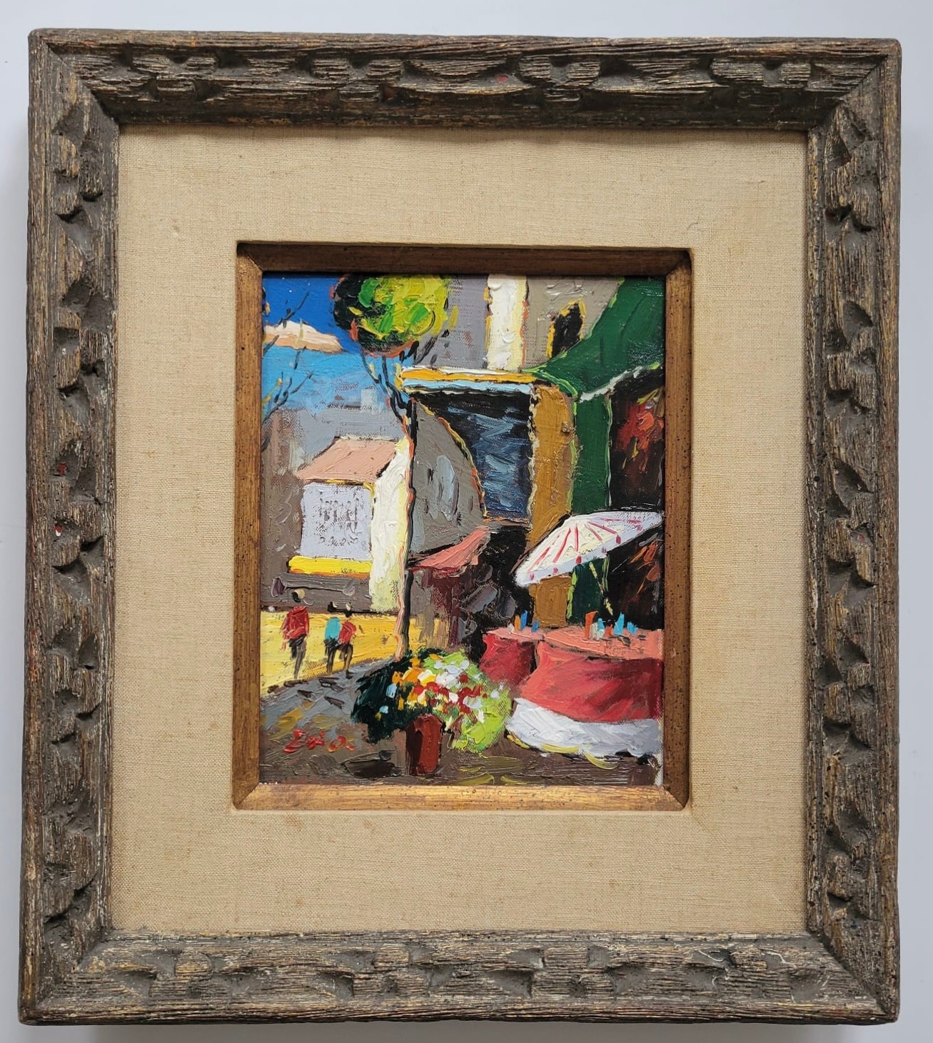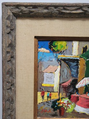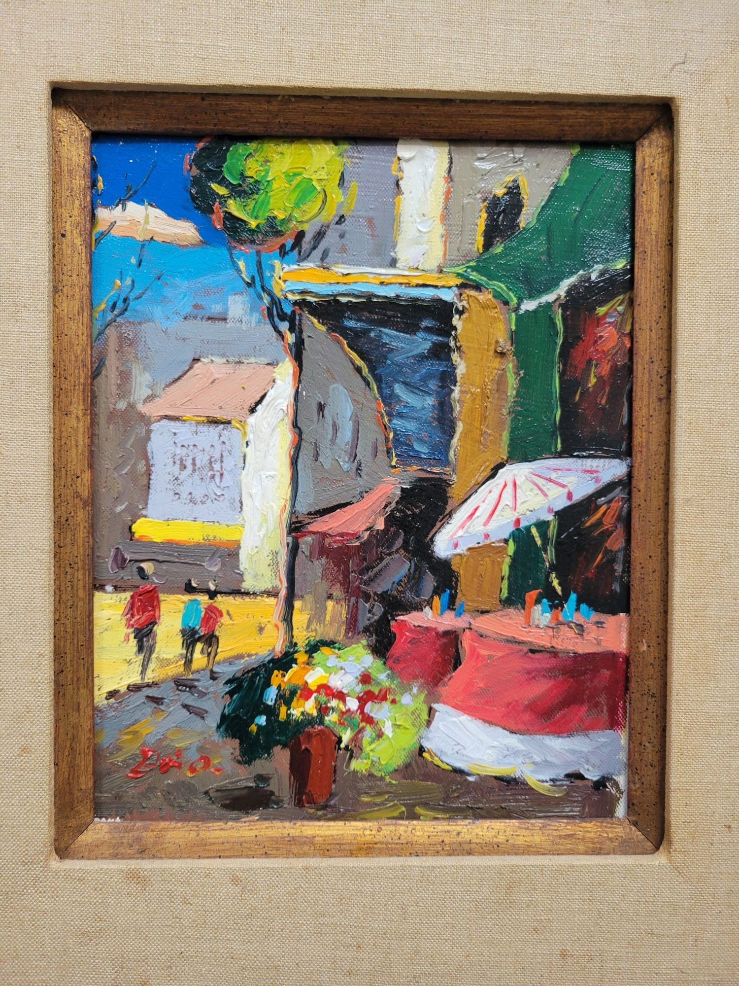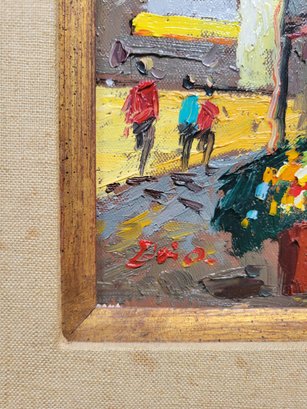 This image shows a vibrant, small painting capturing a lively street scene, likely depicting a market or outdoor setting with people and colorful elements like flowers and umbrellas. The use of bold brushstrokes and bright colors adds to the energetic feel of the artwork.