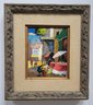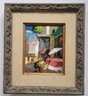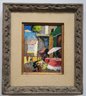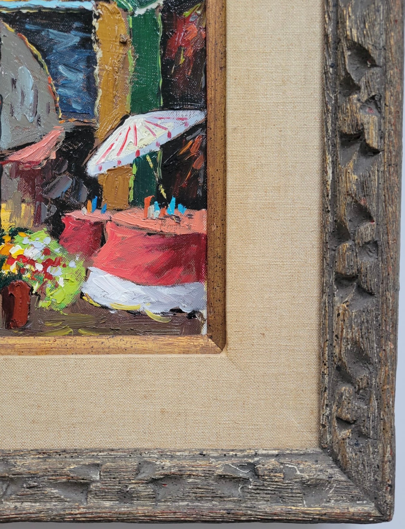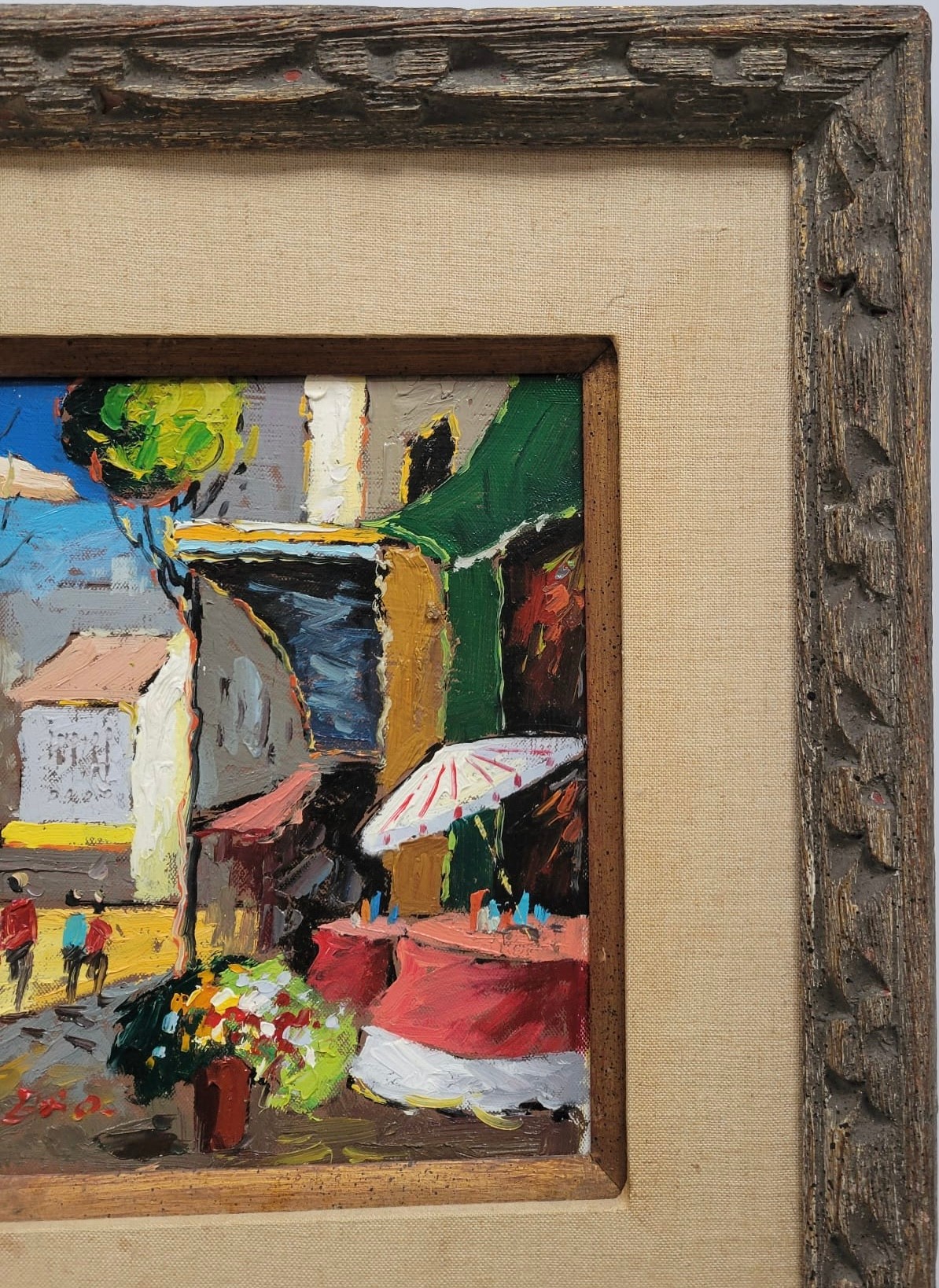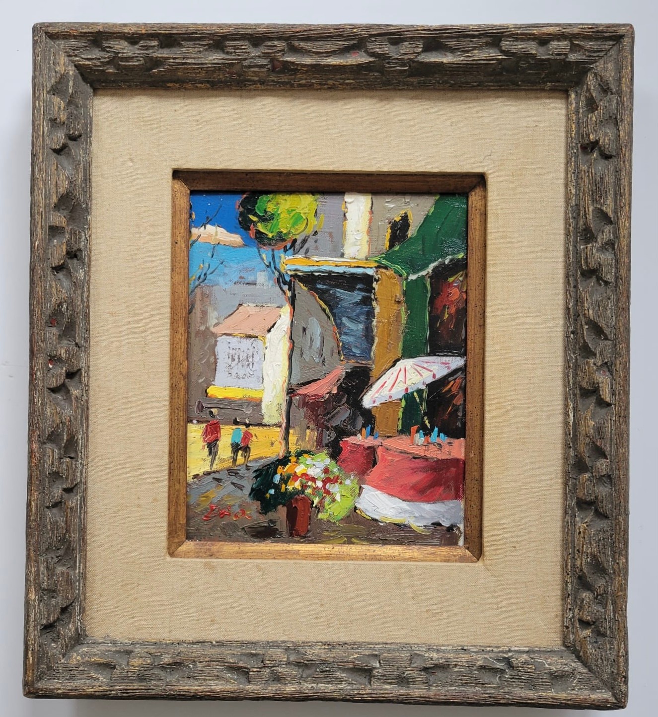 This image shows a vibrant, small painting capturing a lively street scene, likely depicting a market or outdoor setting with people and colorful elements like flowers and umbrellas. The use of bold brushstrokes and bright colors adds to the energetic feel of the artwork.