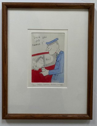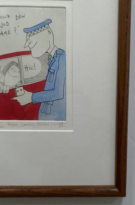 The cartoon depicts a police officer holding a breathalyzer to a person in a car, who appears to be intoxicated, indicated by the "Hic!" speech bubble.