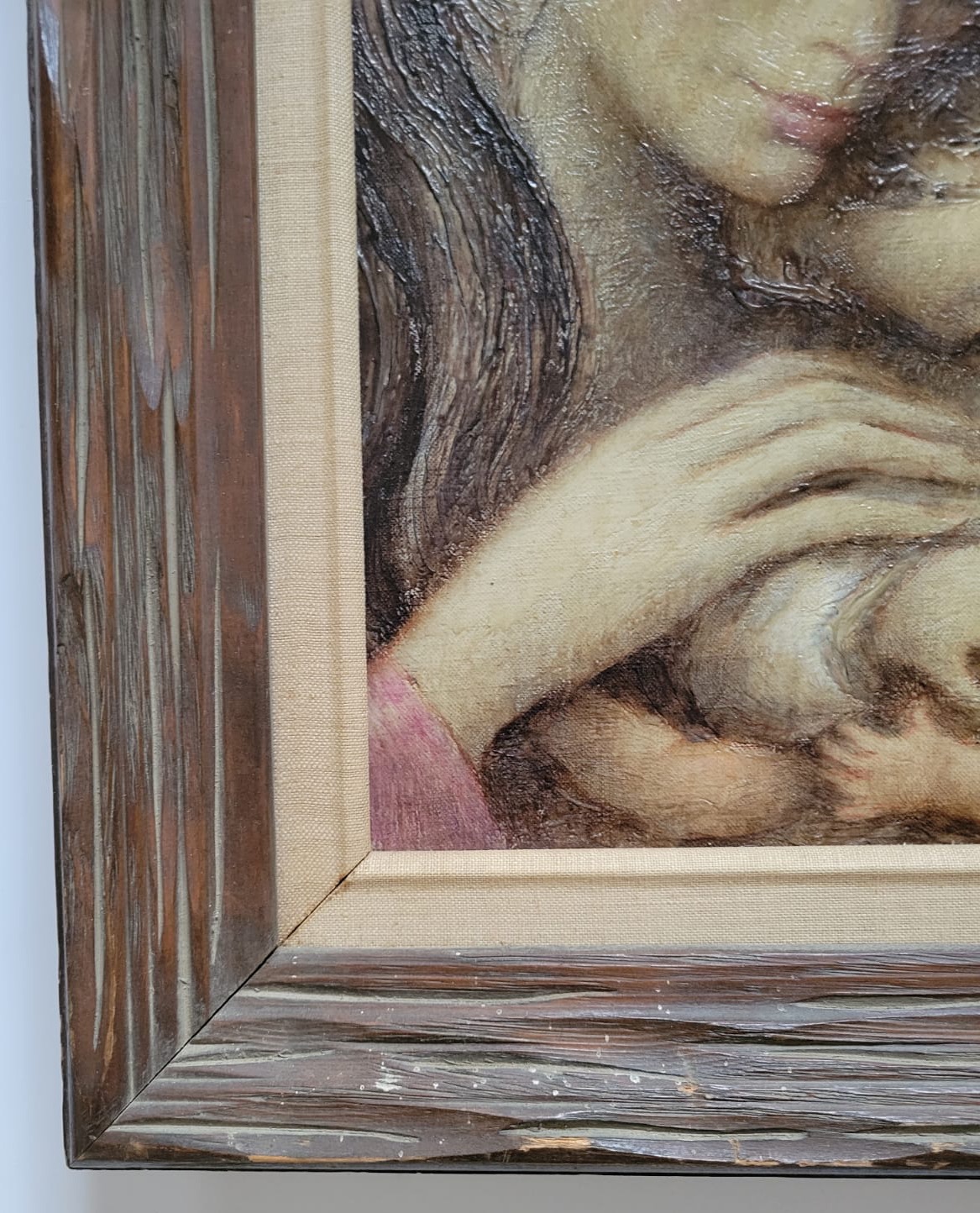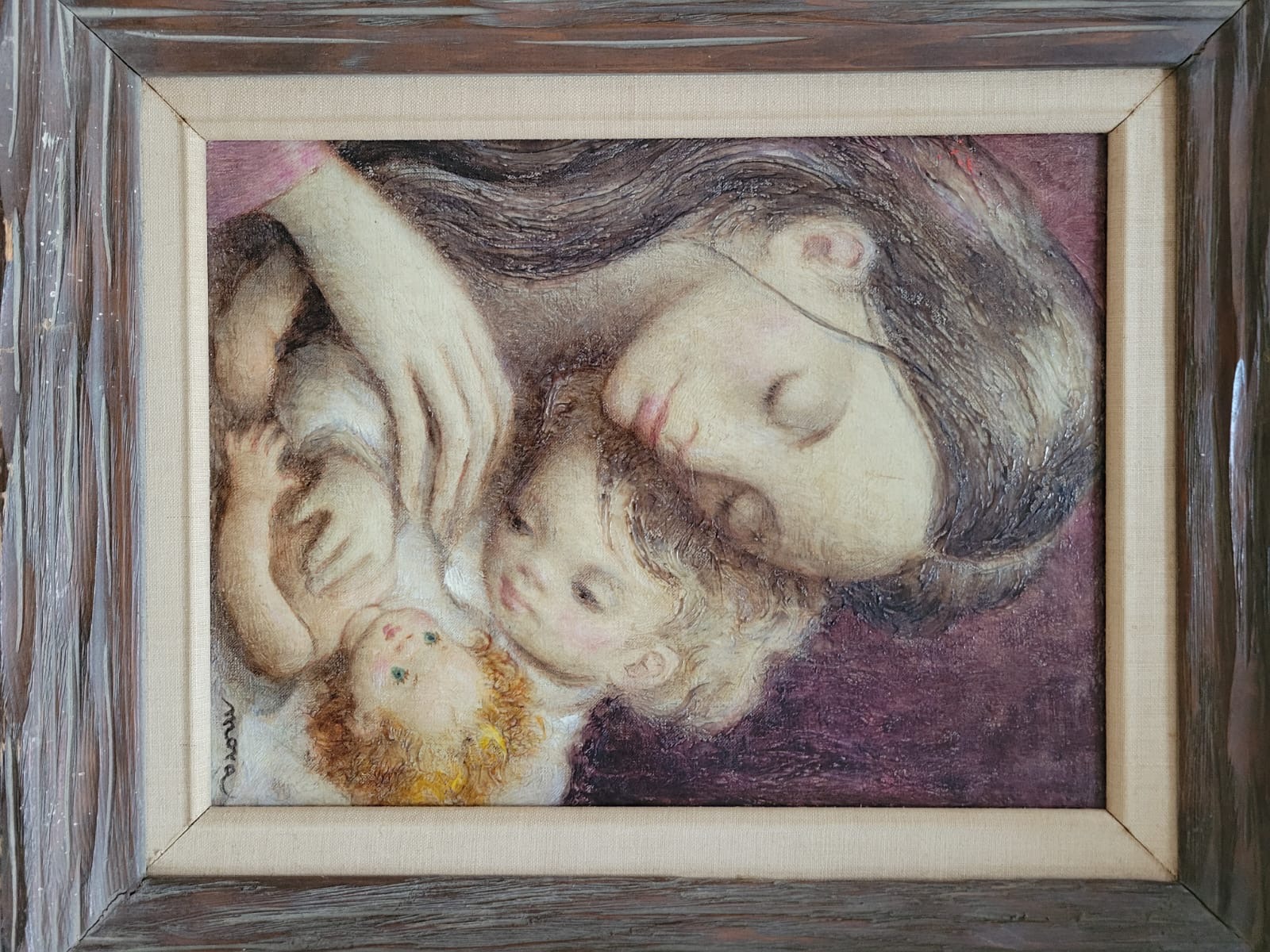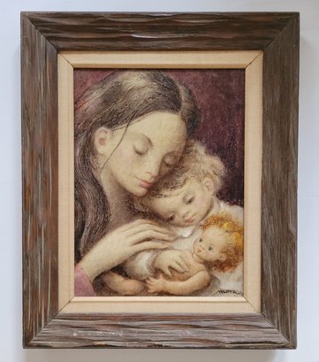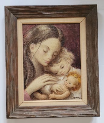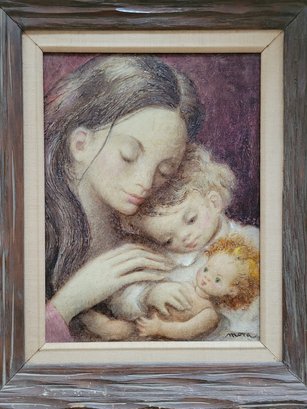 An intimate and tender portrayal of maternal love, this artwork beautifully captures the serene connection between a mother and her children. Rendered with soft, delicate strokes and warm earthy tones, the piece emanates a sense of comfort and familial bond. Framed with rustic wood to enhance its timeless charm, this painting is a perfect embodiment of love, care, and innocence, ideal for adorning cozy spaces or as a heartfelt gift.
