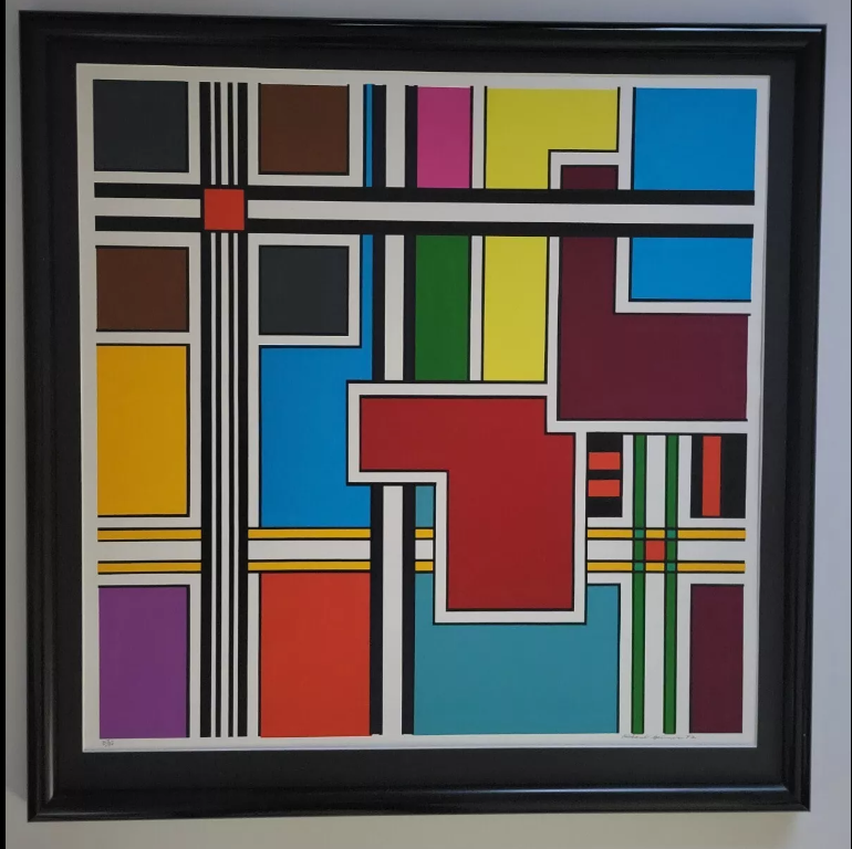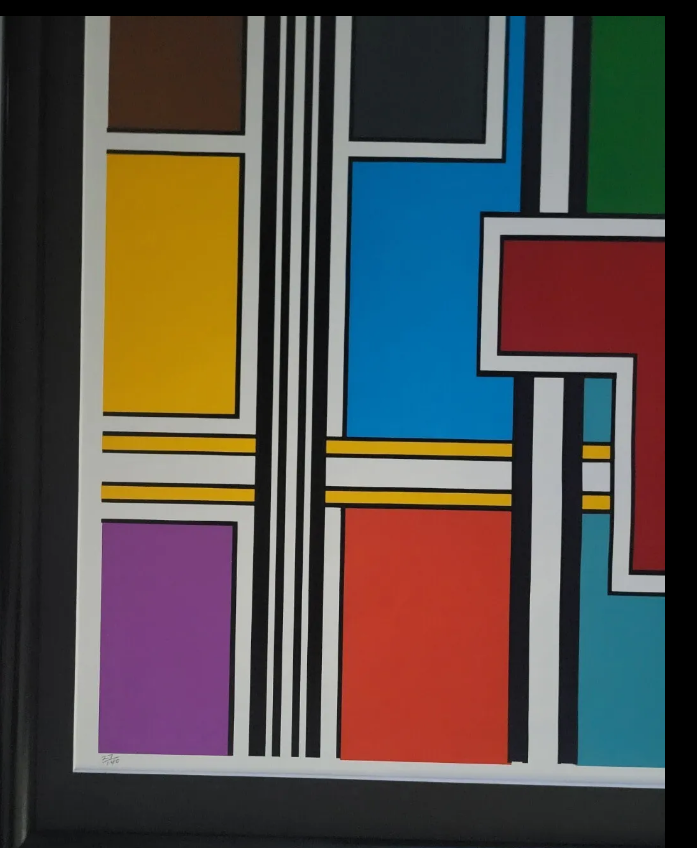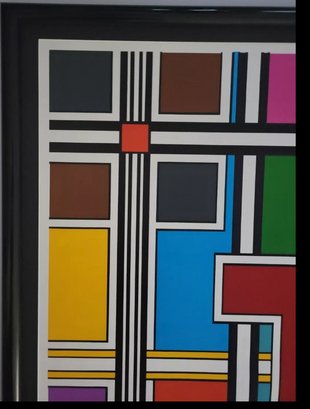This is an absolutely stunning silkscreen titled "Broadway Metric" by graphic tape artist Richard Spinner. The piece is perfect for art collectors or anyone looking to add a unique touch to their home decor. With its vibrant colors and intricate design, it is sure to make a statement in any room. It is important to note that this work of art is a print, and has been professionally produced using high-quality materials. It is an original, licensed reprint, ensuring that you are getting a truly authentic piece of artwork. Single black mat with a shiny black metal frame. Art size ( 24 × 24 ). Frame size ( 28 x 29 )