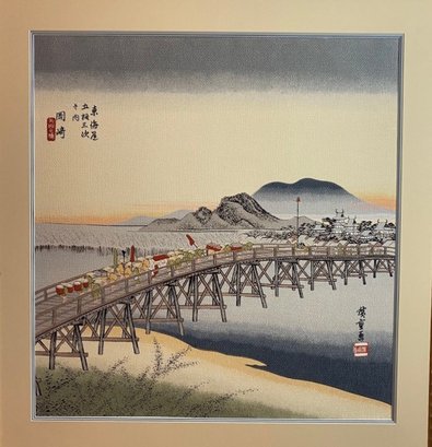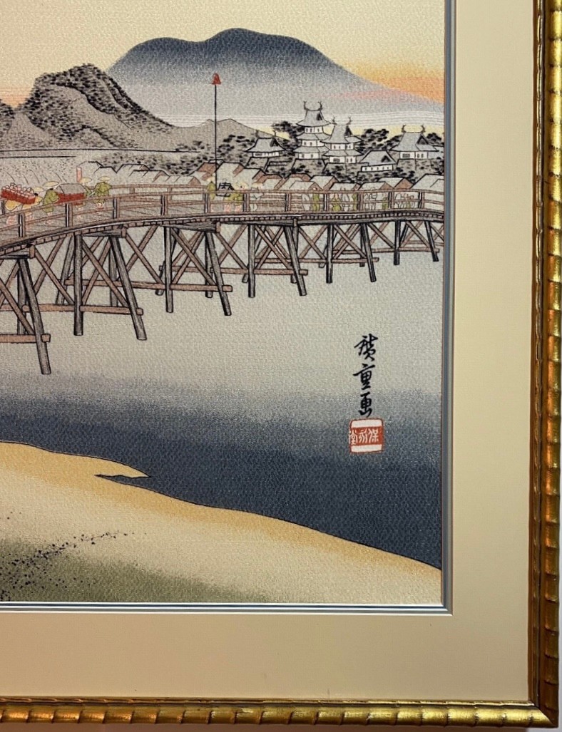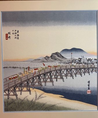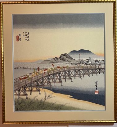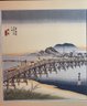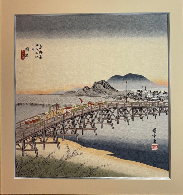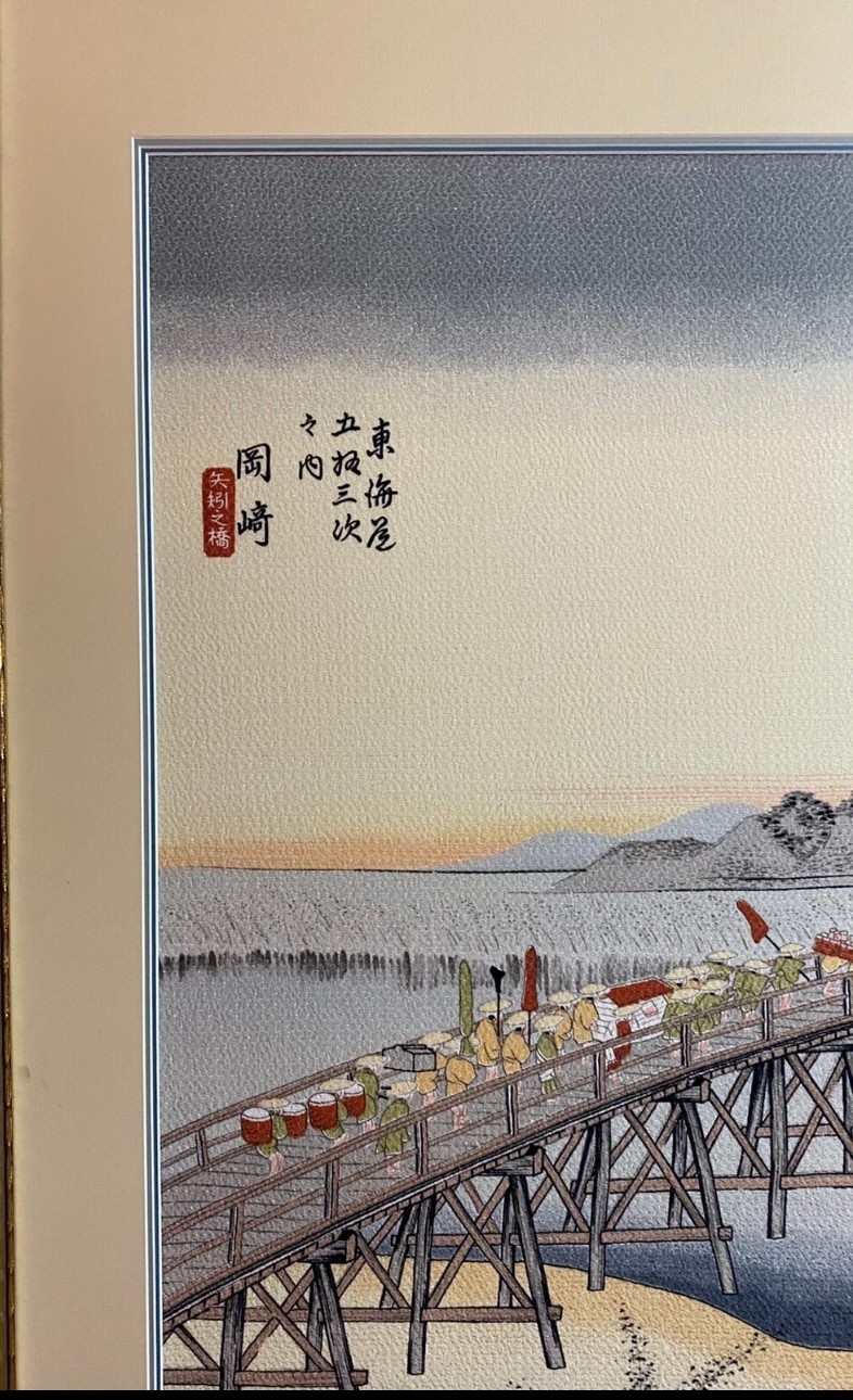 The print depicts the Yahagi Bridge in Okazaki, which was the 39th station on the Tōkaidō road.
