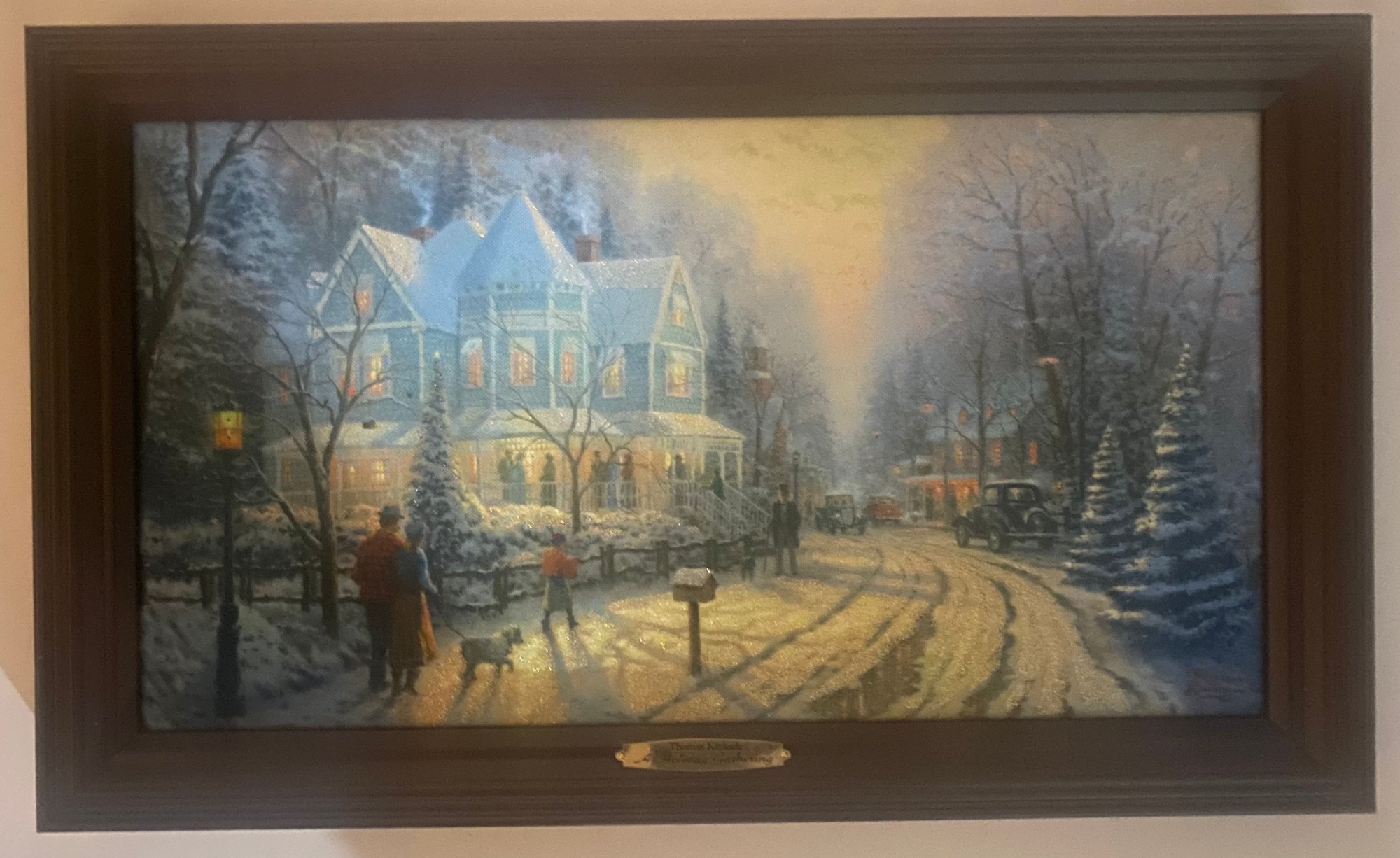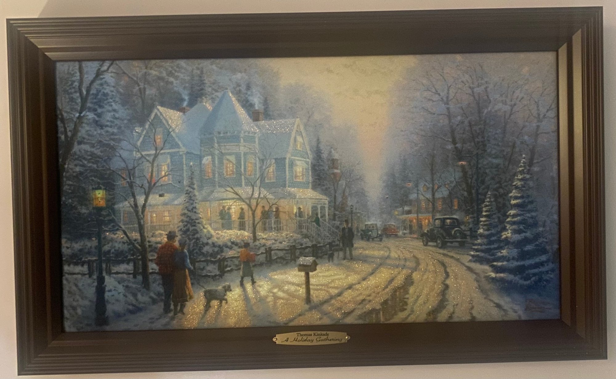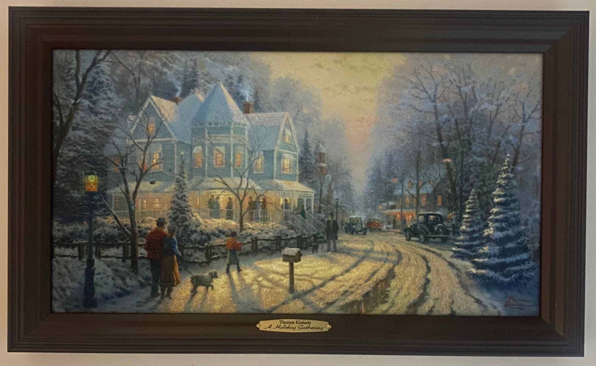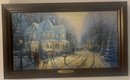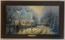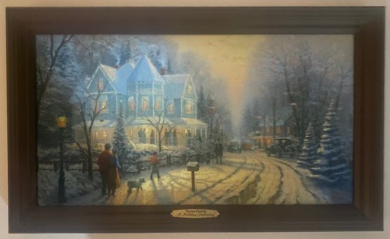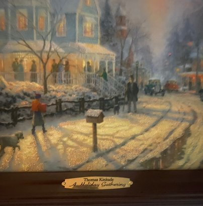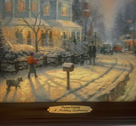 Print Titled "A Holiday Gathering" (also known as Christmas Cottage IX) by the American artist Thomas Kinkade. Kinkade was known as the "Painter of Light" due to his signature use of brilliant illumination and pastel colors in idyllic scenes. Certificate of Authenticity