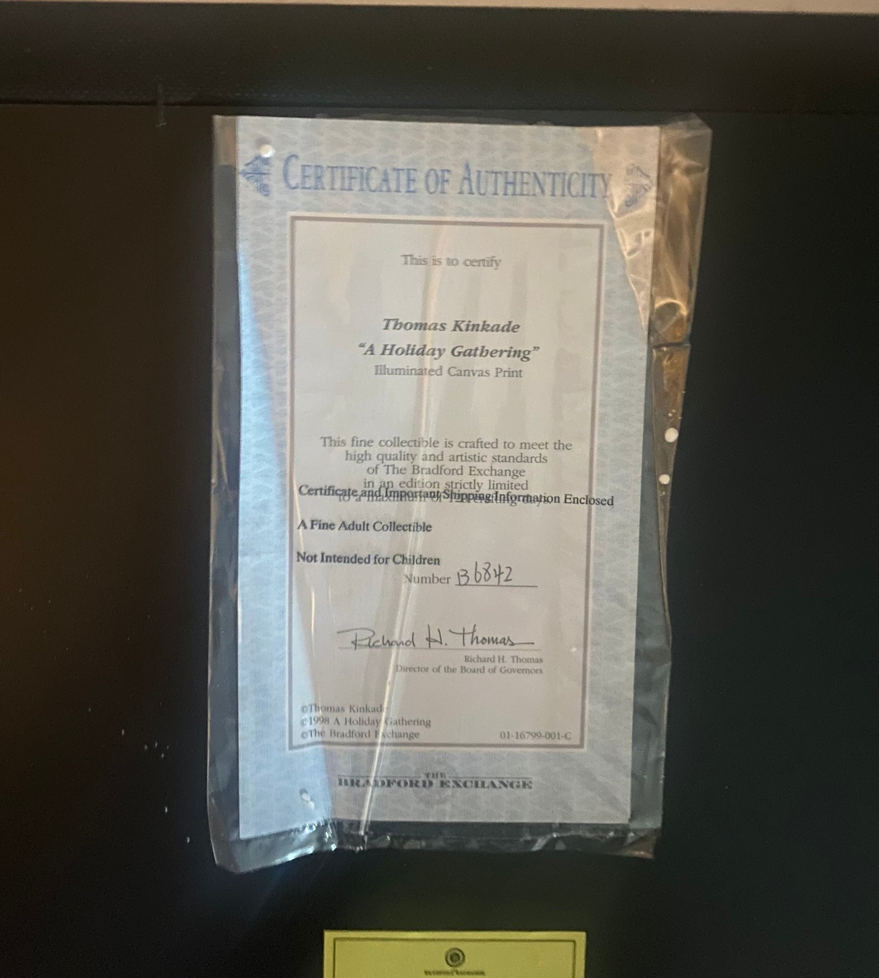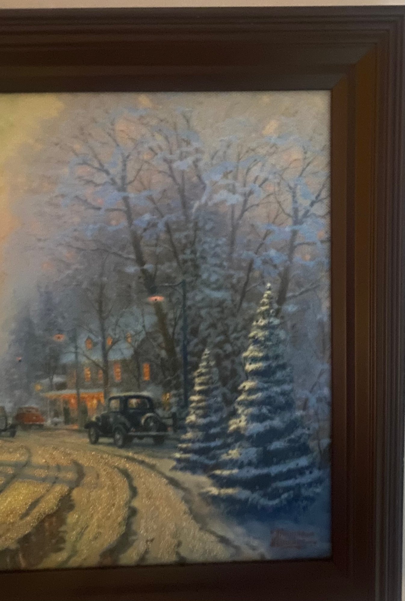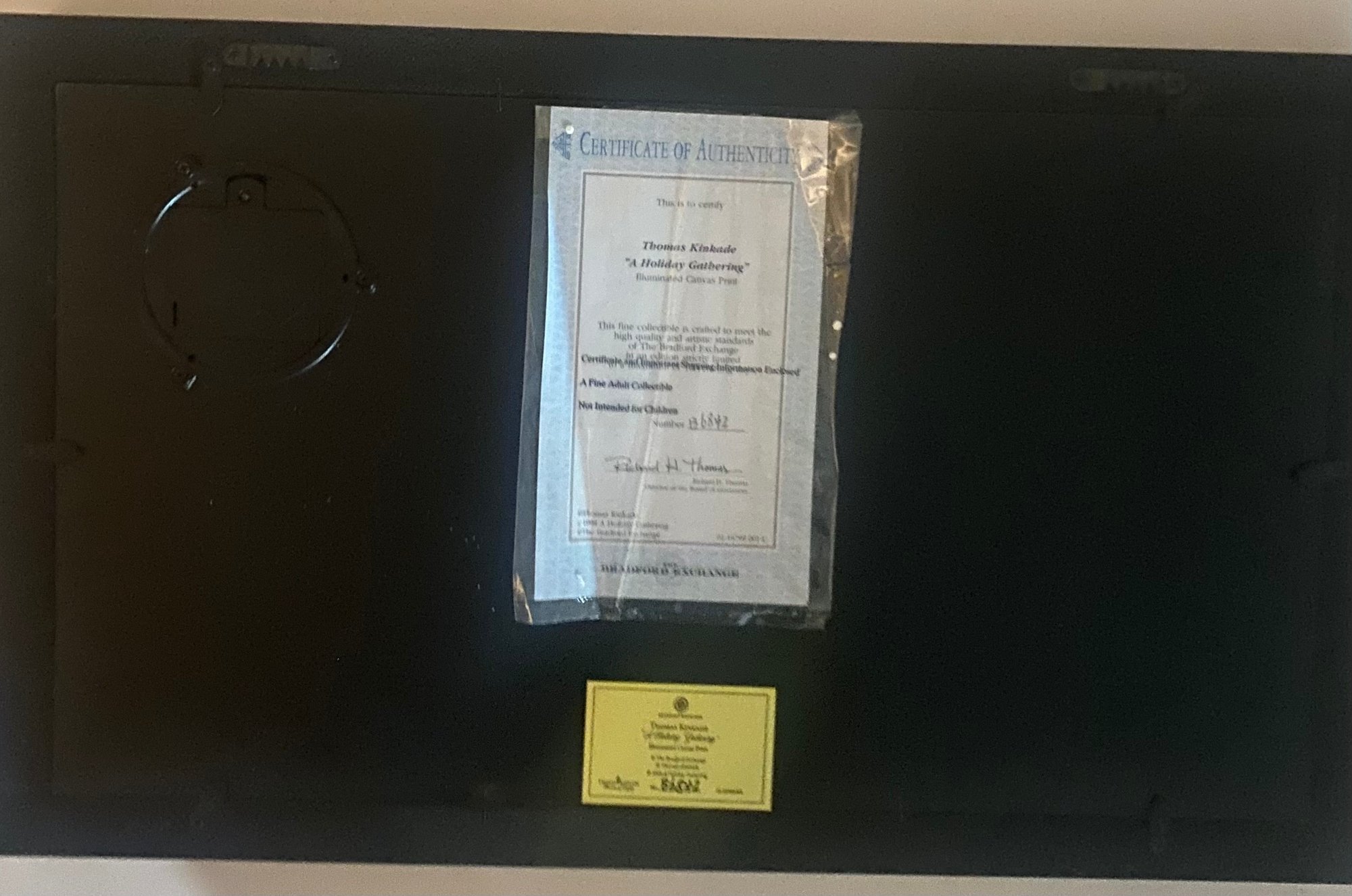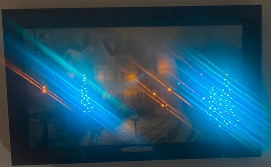 Print Titled "A Holiday Gathering" (also known as Christmas Cottage IX) by the American artist Thomas Kinkade. Kinkade was known as the "Painter of Light" due to his signature use of brilliant illumination and pastel colors in idyllic scenes. Certificate of Authenticity