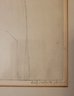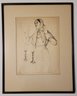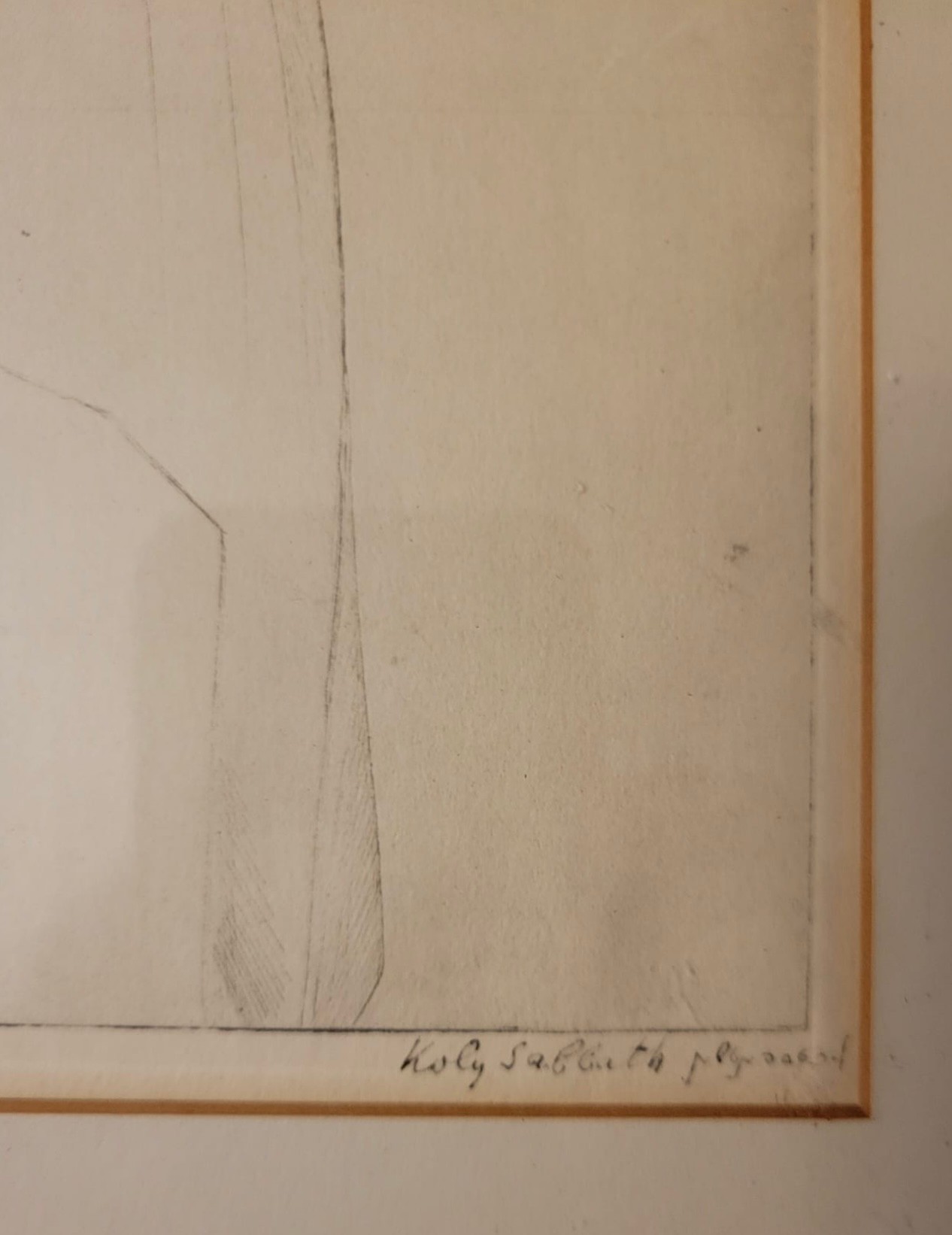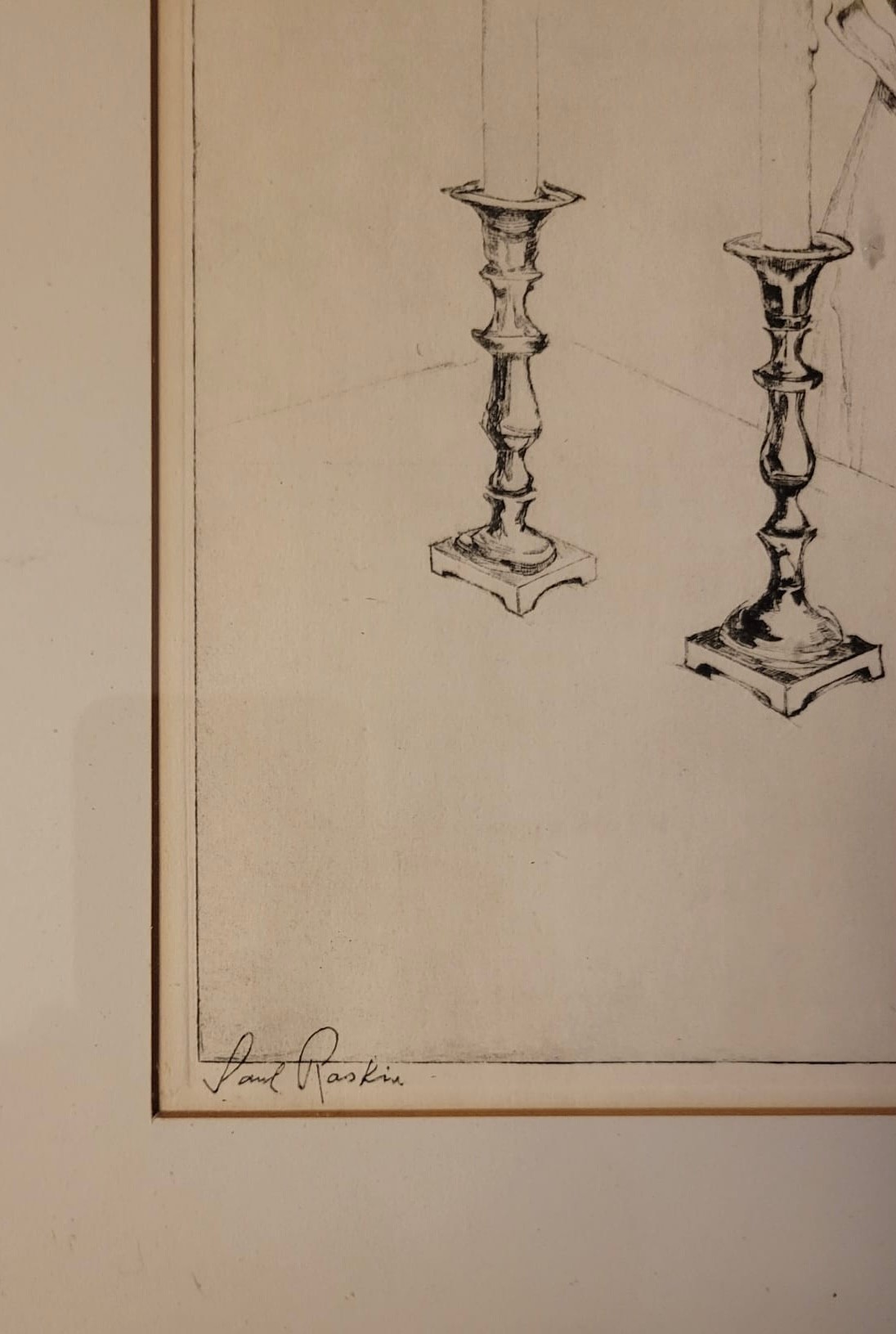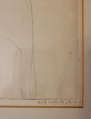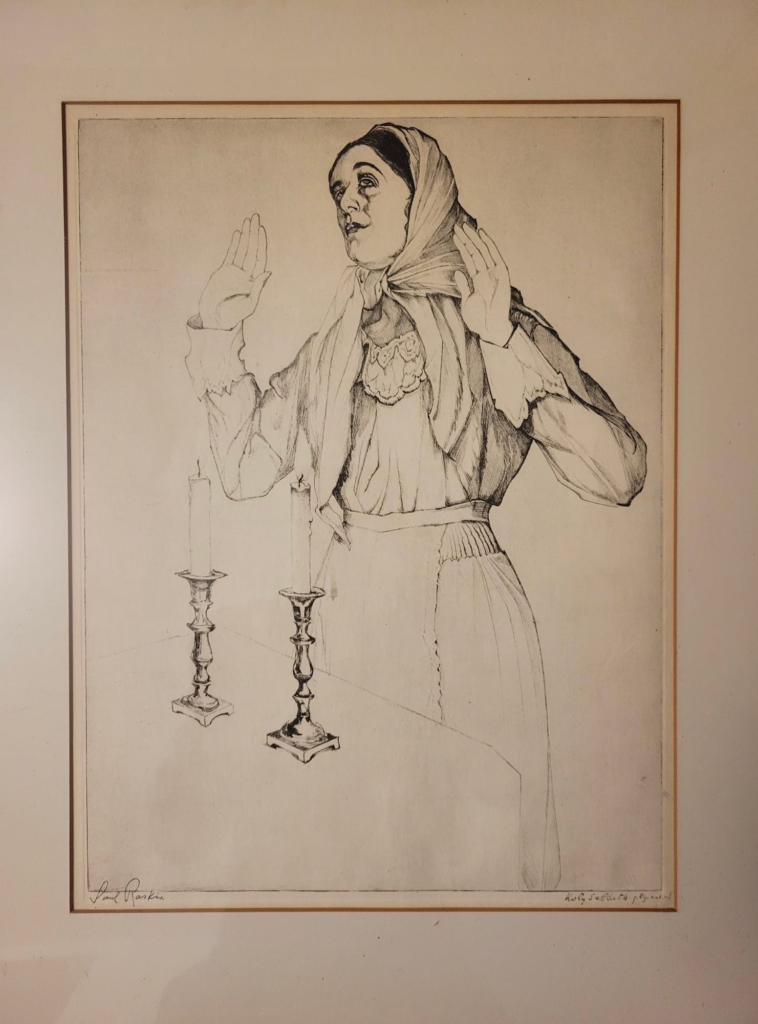 This image features a framed lithograph titled "Holy Sabbath" by Saul Raskin. It depicts a woman with a headscarf, gesturing with her hands near two candlesticks, which adds a sense of context or ritual to the scene. The style is characterized by detailed line work. Saul Raskin Etching Holy Sabbath single mat with black frame