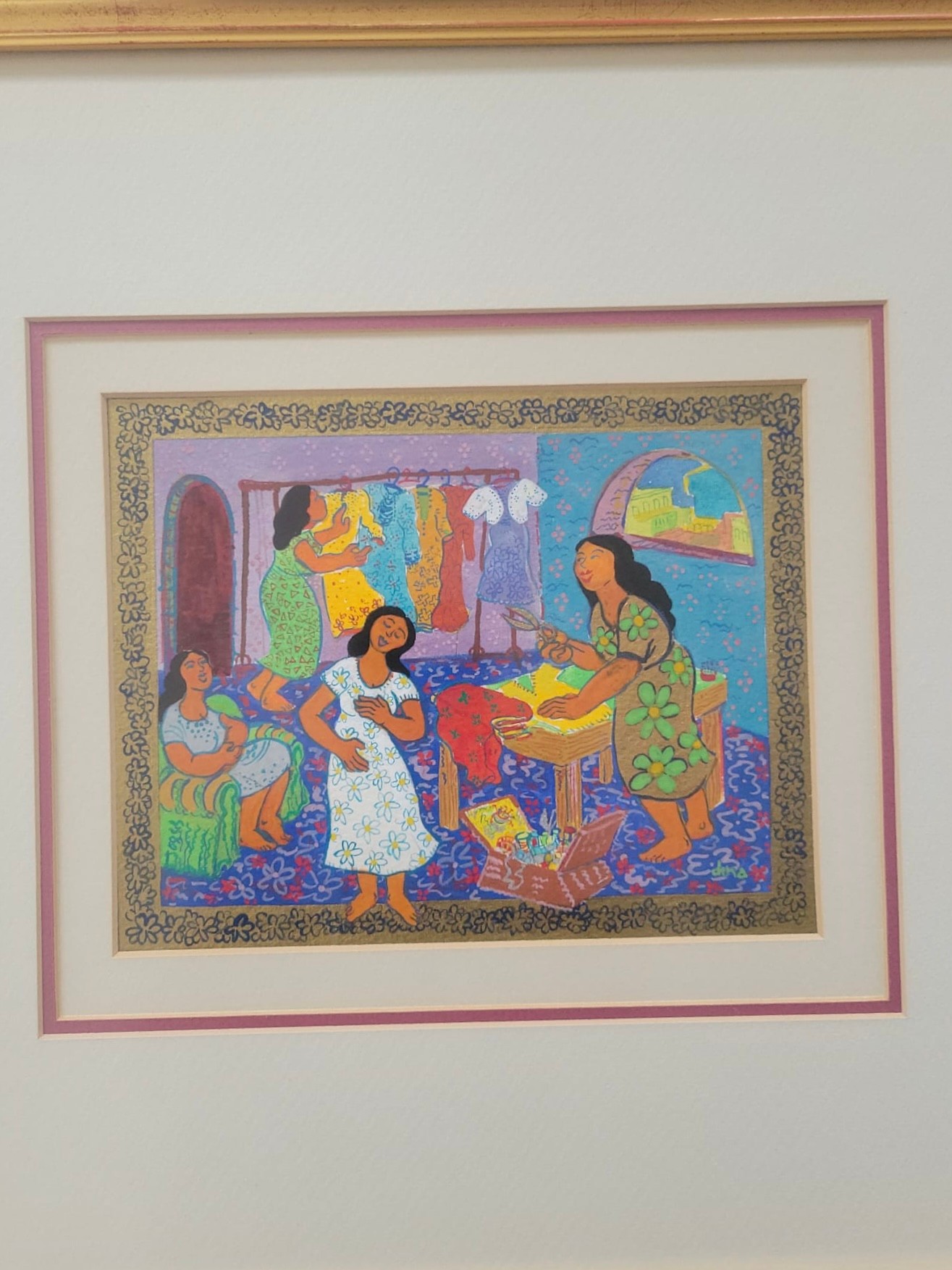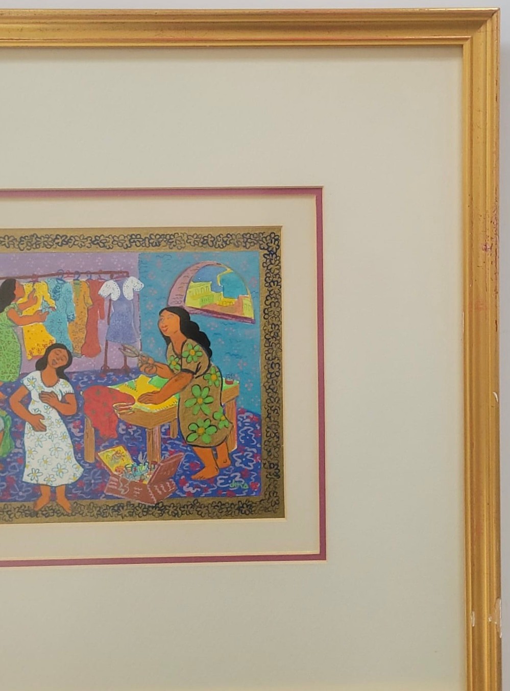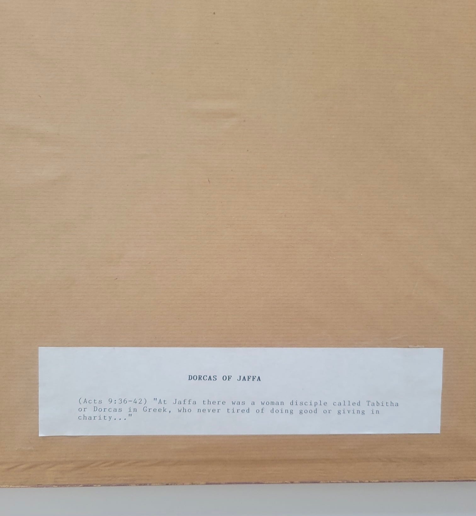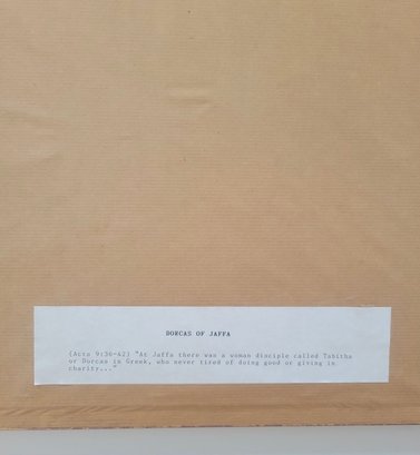 Serigraph titled "Dorcas of Jaffa" (also known as Tabitha)by Dina Cormic from her Heroic Women in the Scriptures series.Subject: It depicts the biblical story of Dorcas (Tabitha) from Acts 9:36–42, who was a disciple in Jaffa (Joppa) known for her "good works and acts of charity," specifically making tunics and other clothing for widows.